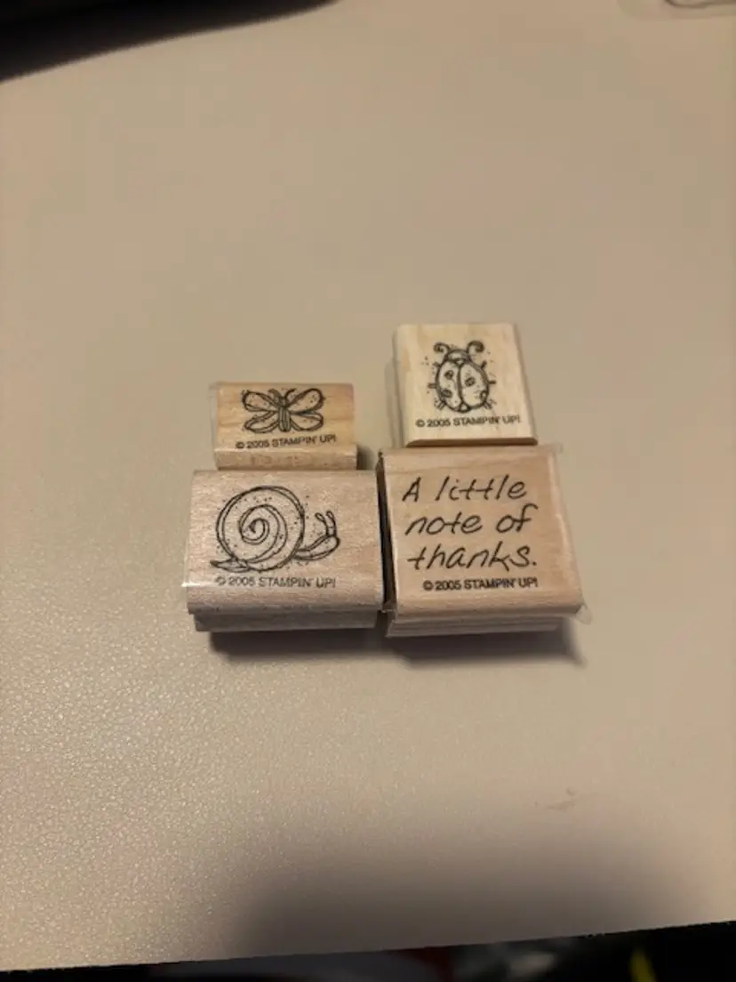 Four stamps from the Wing Things collection from Stampin' Up! Ladybug, Butterfly, Snail and "A Little Note of Thanks" stamps. Used but in great shape.