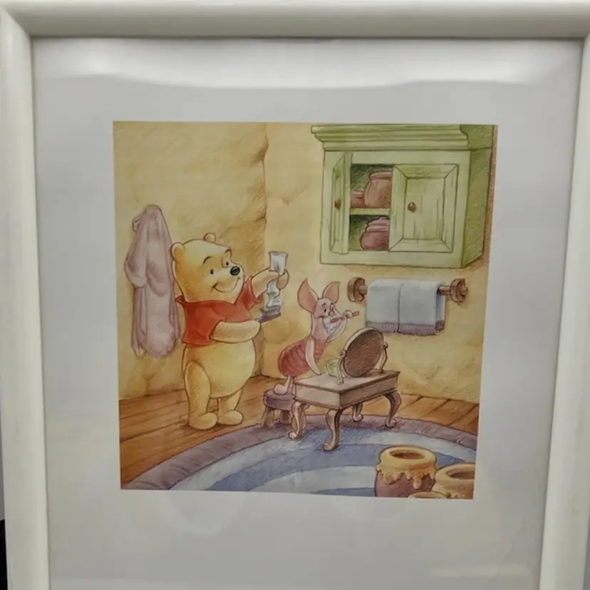 THIS COULD BE A BATHROOM OR NURSERY PICTURE. IT WAS MADE FOR DISNEY IN CANADA. THERE I WHAT LOOKS LIKE A WATER SPOT AT THE BOTTOM CORNER. IT IS CUTE AND IF YOU LOVE POOH.