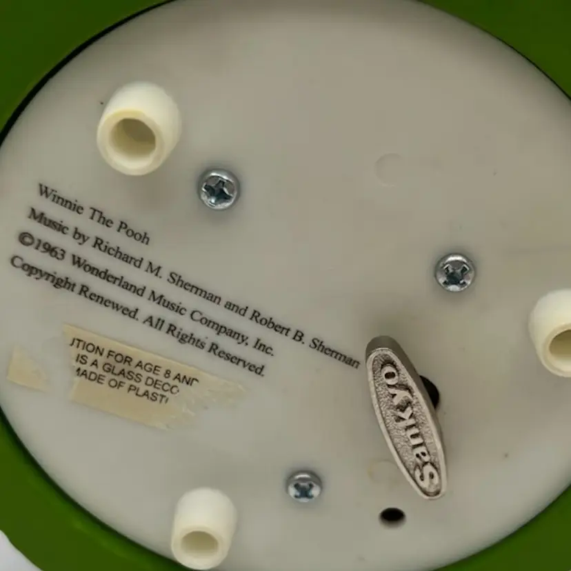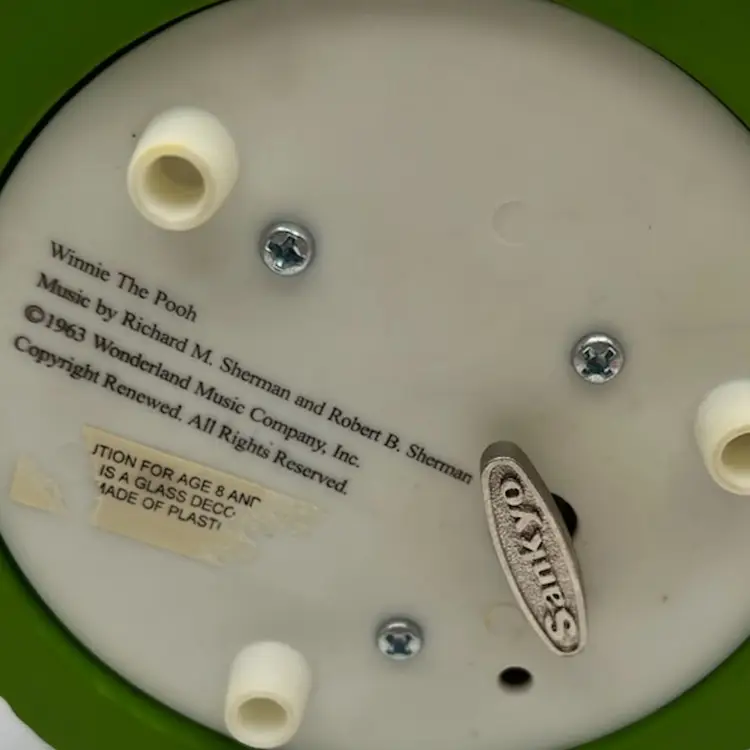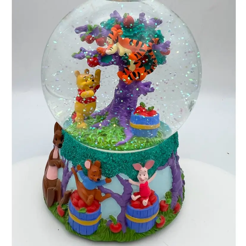 THIS IS A GLITTER BALL SHOWING TIGGER AND POOH PICKING APPLES. IT PLAYS THE WINNIE THE POOH SONG. MADE OF RESIN AND IN BEAUTIFUL CONDITION.