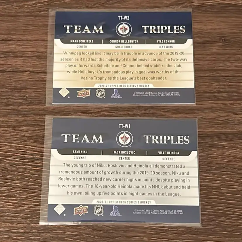 2020-21 Upper Deck Series 1 Team Triples lot TT-W2 Gold Scheiffele, Hellebruyck, Connor TT-W1 Niku, Roslovic, Heinola