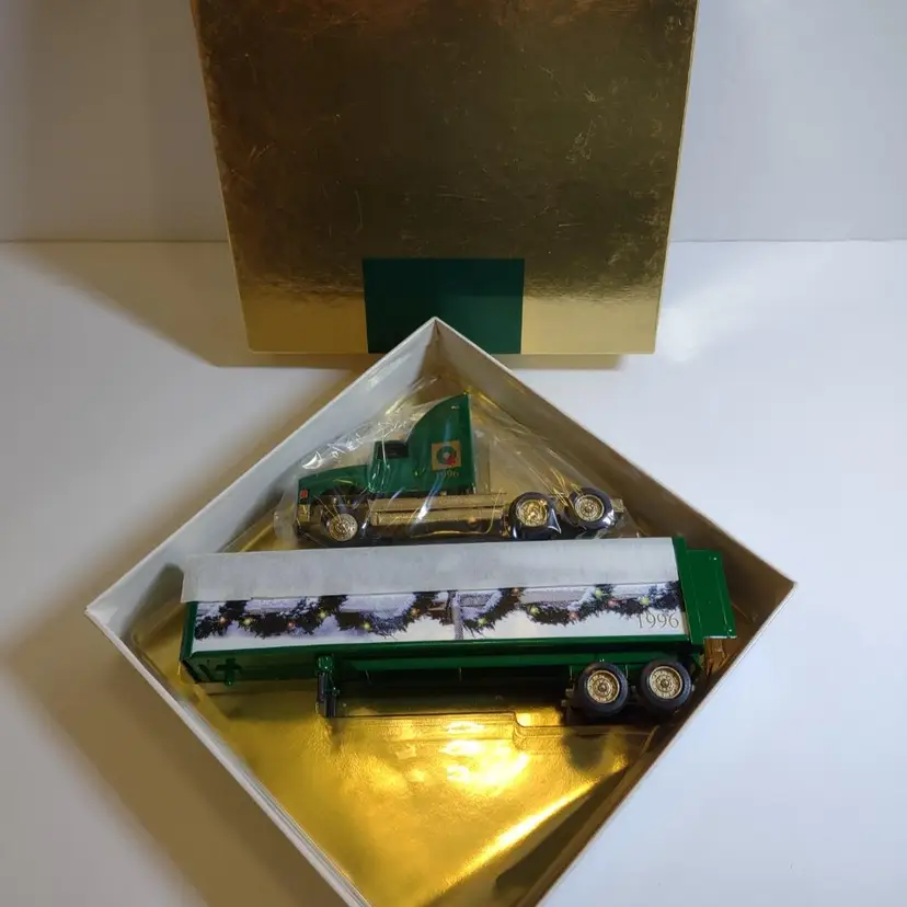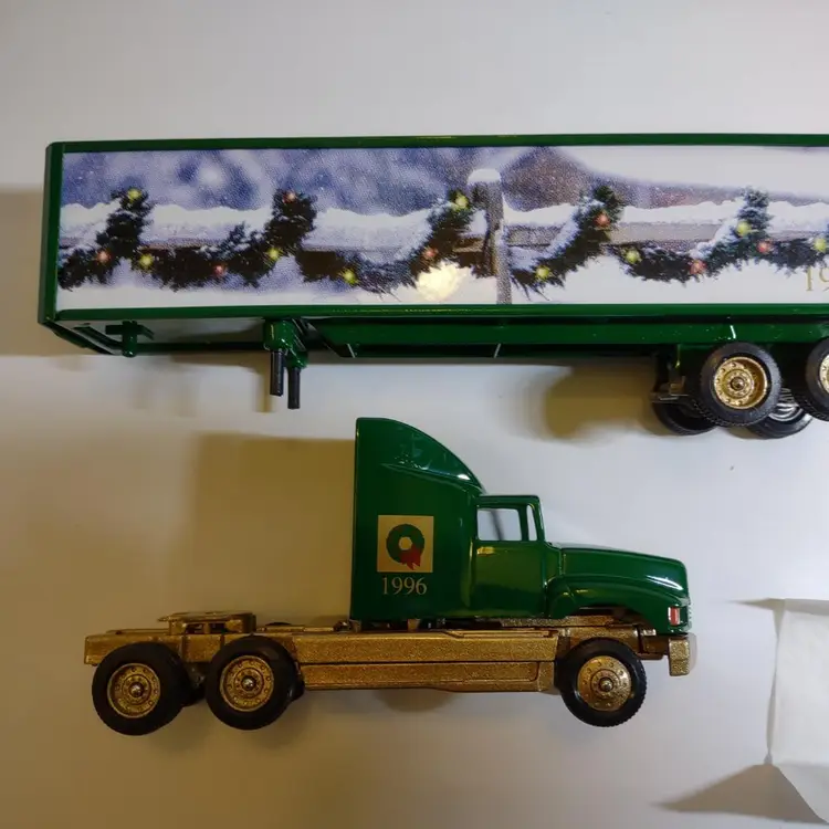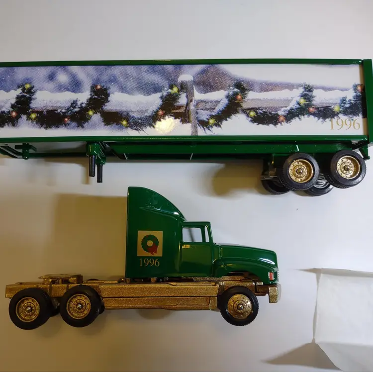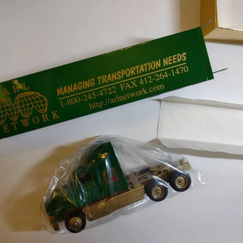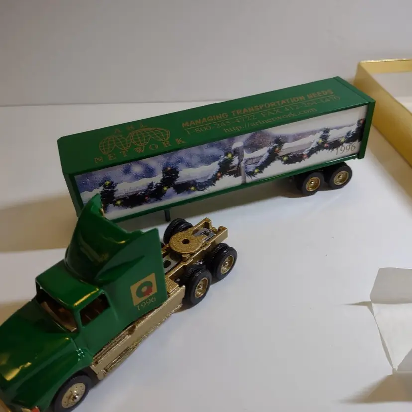 Happy Holidays special artwork with Christmas lights on trailer. Winross tractor trailer truck diecast. ARL Transportation advertising. Looks unused. Box shows some age wear with rub and scrape marks on shiny gold box lid. Bottom is marked "Winross" made in Rochester New York. Scale is unknown. Size of cab is 5.25" long. Size of trailer is 7" long.