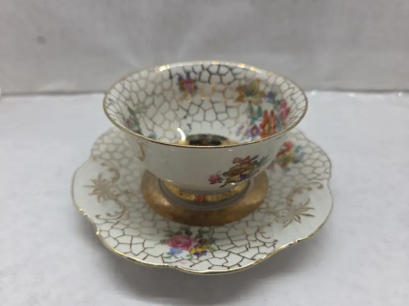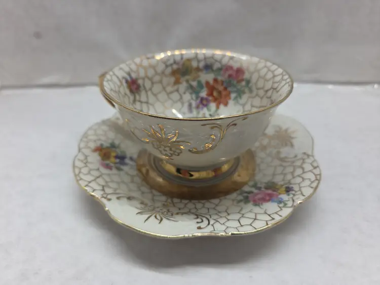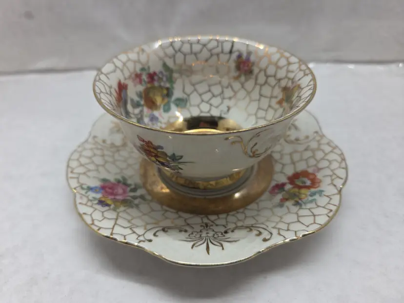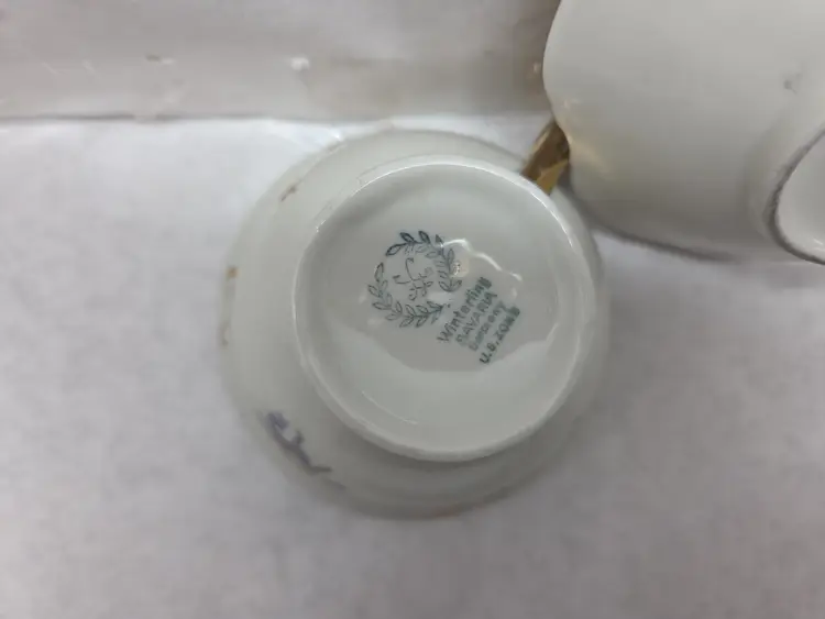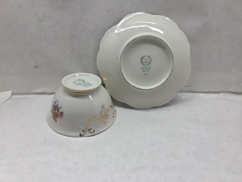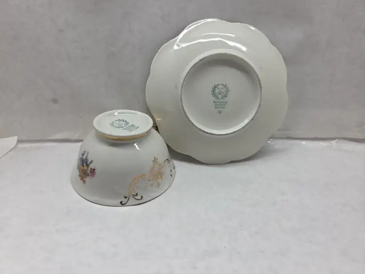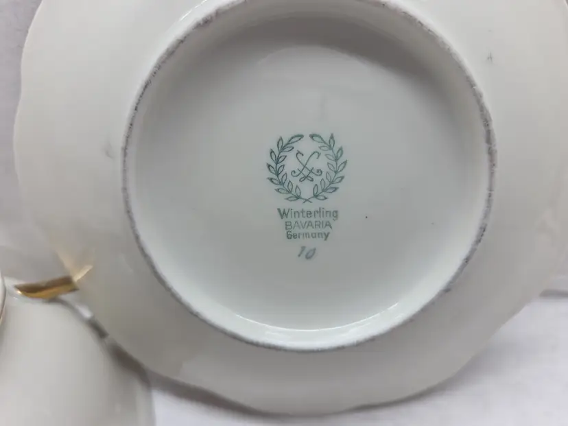 This vintage tea cup and saucer set from Bavaria, Germany, features a delicate floral pattern with gold gilding, perfect for winter occasions. Made of ceramic and porcelain, this set by Winterling in a mid-century modern style embodies the elegance of post-1940 vintage pieces. With a cream, floral, and gold color scheme, this set is ideal for serving hot or cold beverages in a charming and nostalgic way, making it a collectible item for tea enthusiasts A-1