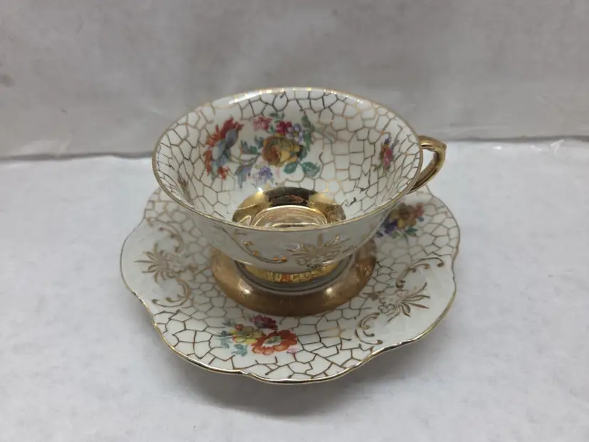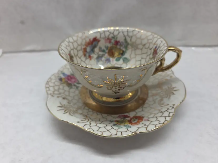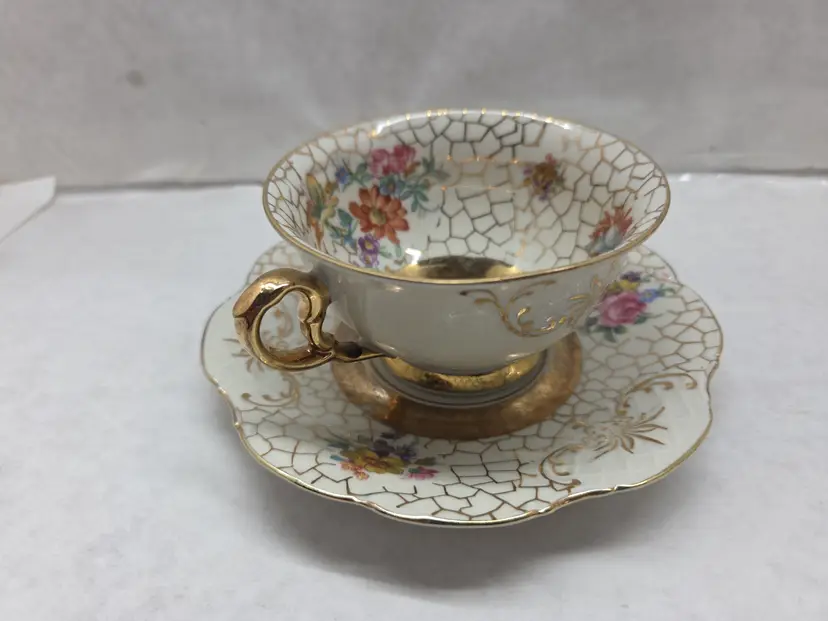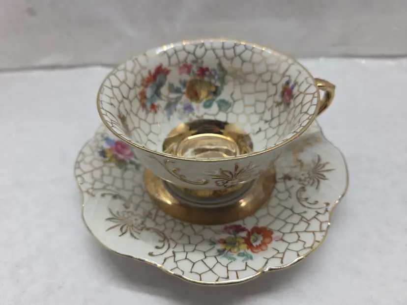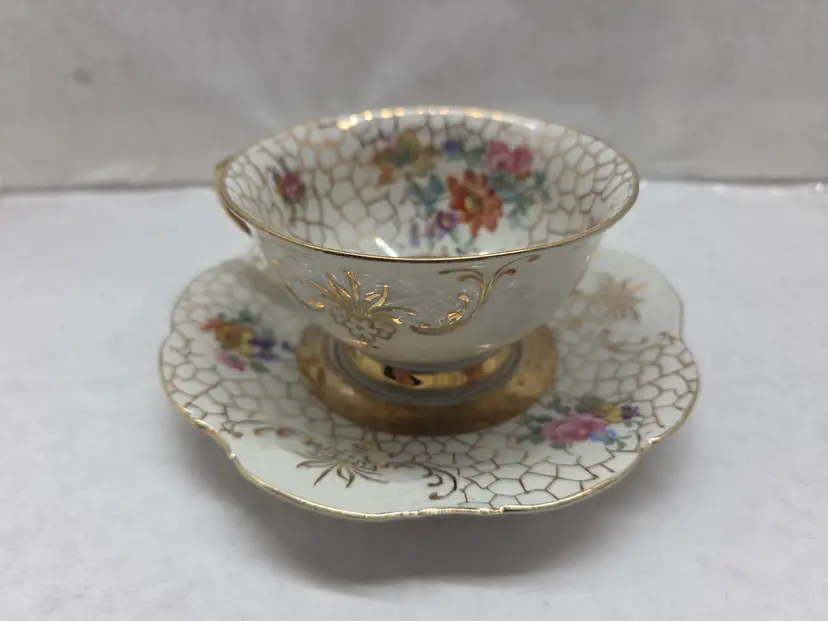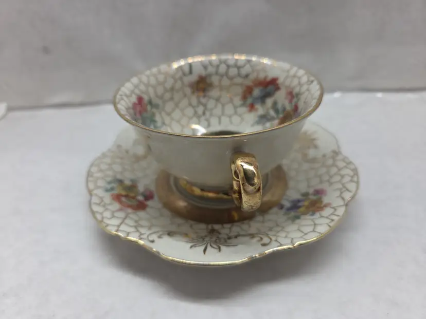 This vintage tea cup and saucer set from Bavaria, Germany, features a delicate floral pattern with gold gilding, perfect for winter occasions. Made of ceramic and porcelain, this set by Winterling in a mid-century modern style embodies the elegance of post-1940 vintage pieces. With a cream, floral, and gold color scheme, this set is ideal for serving hot or cold beverages in a charming and nostalgic way, making it a collectible item for tea enthusiasts A-1