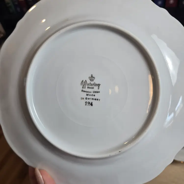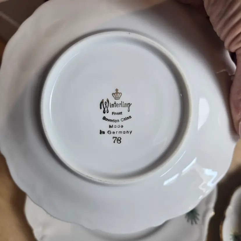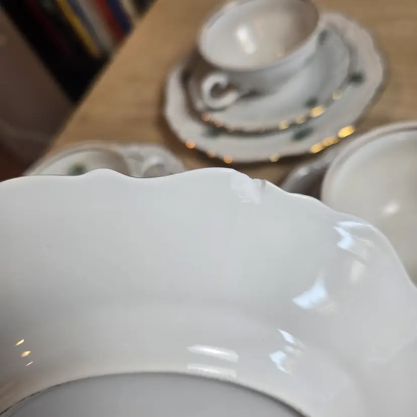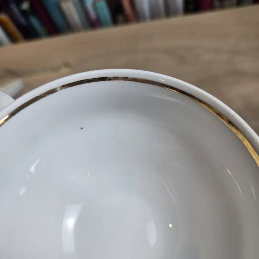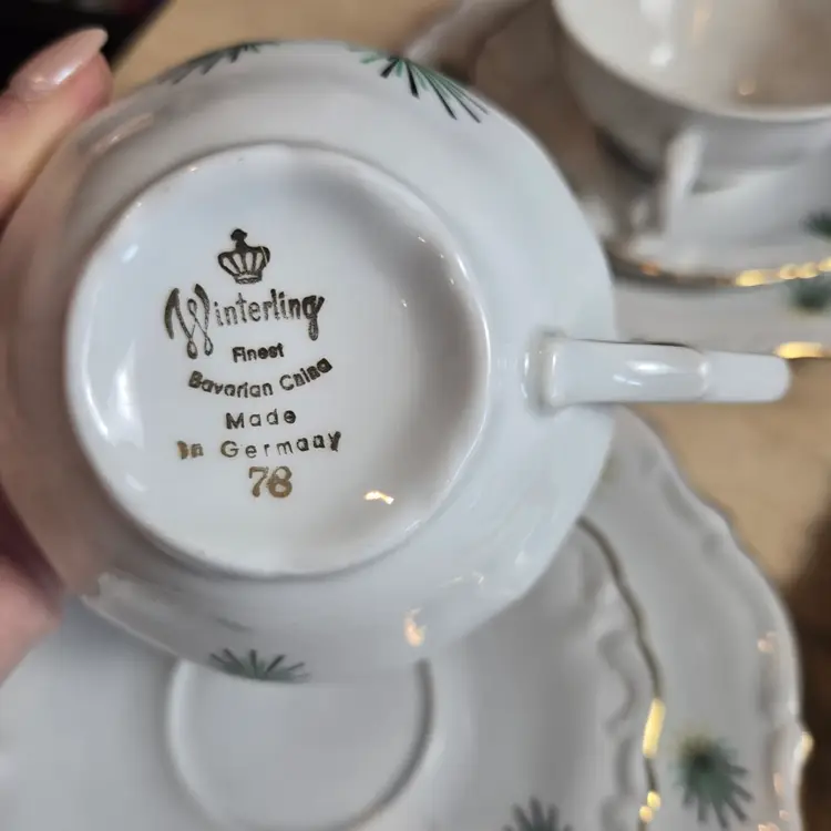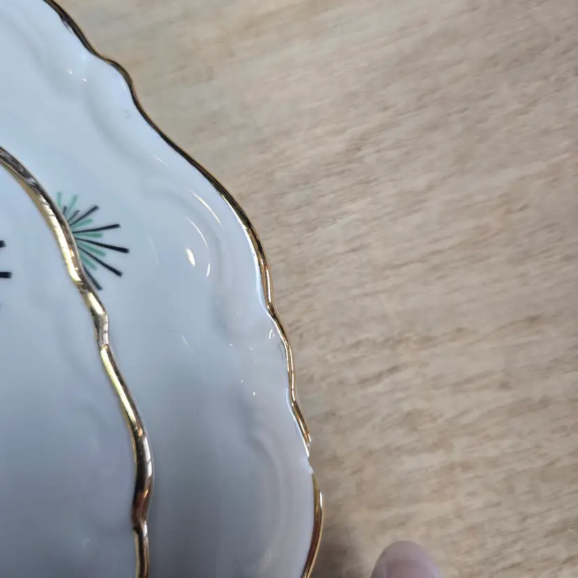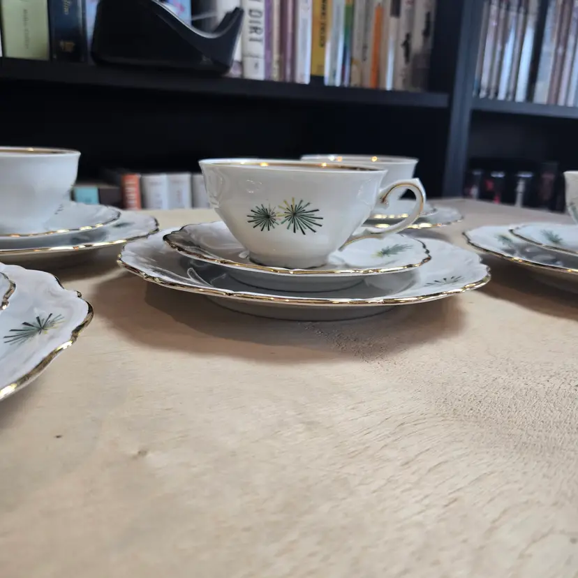 1 of the dessert plates has a chip on the underside (see picture) some wear and slight fading on the gold trim of a teacup Atomic Starburst pattern MCM