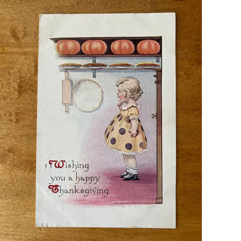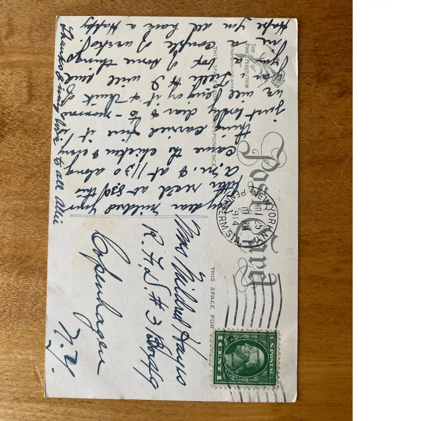 Signed. Minor creases on the left side corners. Measures 5.5"x3.5". Post marked 11/25/1914.