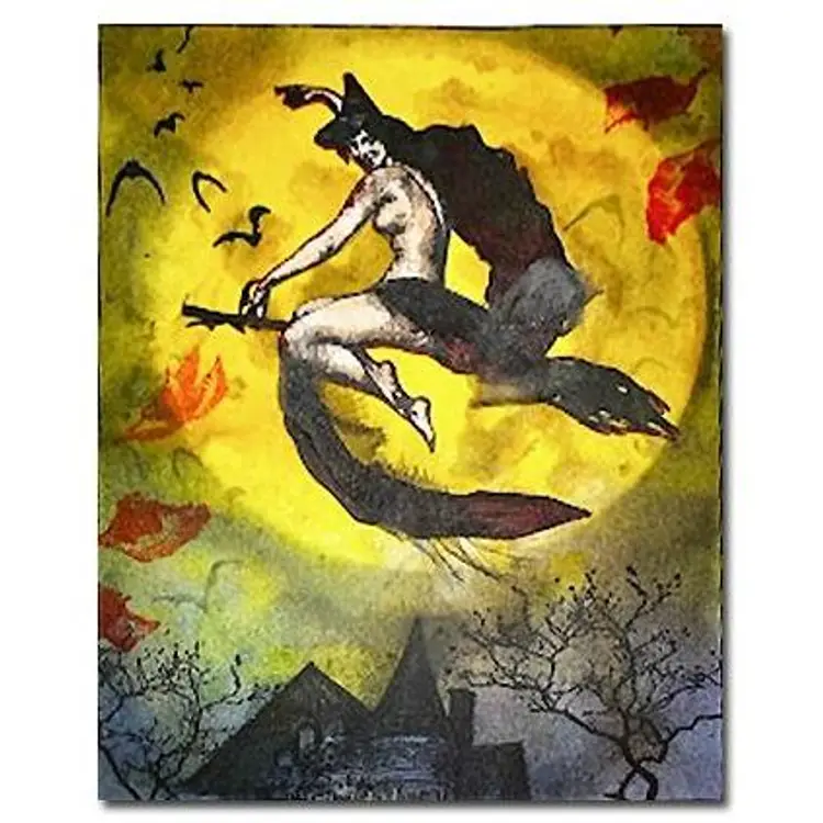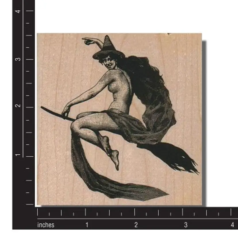 Witch With Scarf Flying On Broom Halloween Rubber Stamp Size: 3-1/2 x 3-1/2 inches Red rubber Handmade • Great for scrapbooking, Halloween cards, journaling, gift tags and all your craft projects!