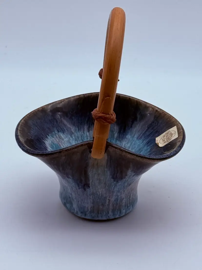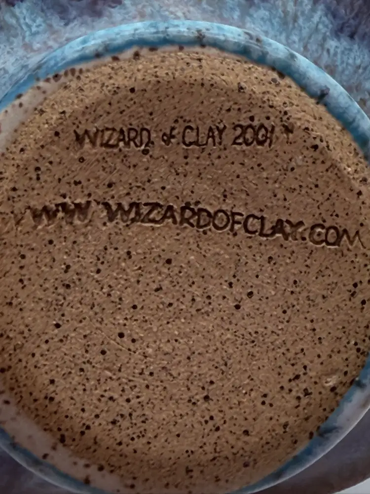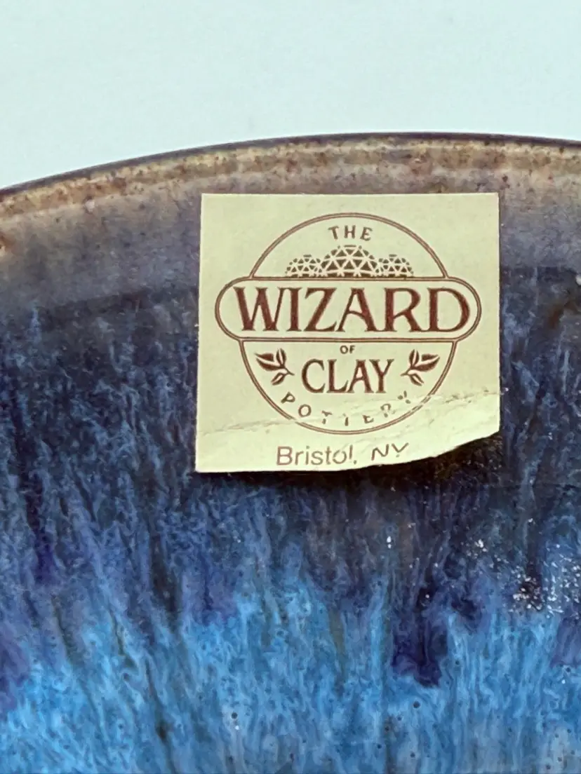 Measures 6” tall w handle, 4” wide No chips or cracks Stamped Wizard of Clay on Base and has original sticker. Made in Bristol, NY