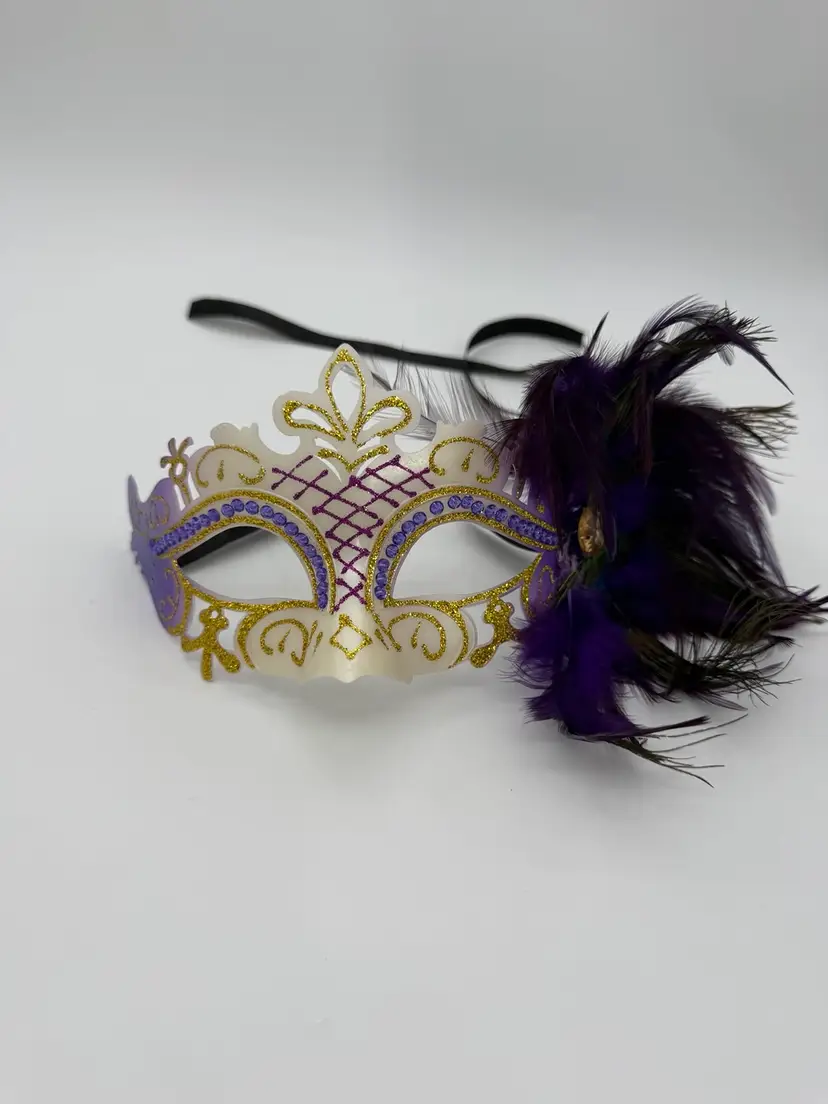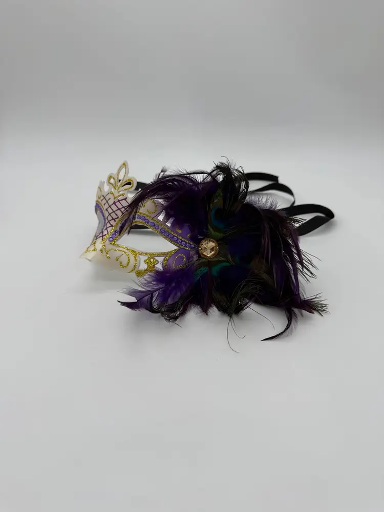 This Women's Purple & Gold Glitter Venetian Peacock Feather Mask is perfect for Mardi Gras, Masquerade, or party events. The adjustable half face/ eye mask features hand-painted details and a vintage design, adding a touch of glamour to any costume or outfit. Made of plastic and adorned with peacock feathers, this unique mask is sure to make a statement at any special occasion.
