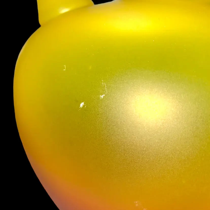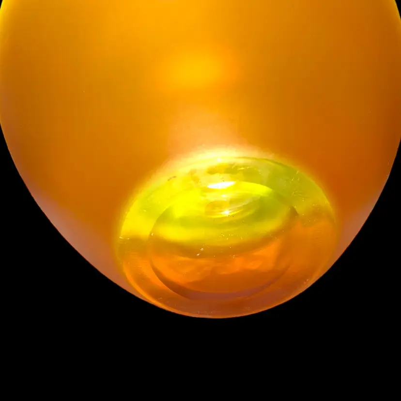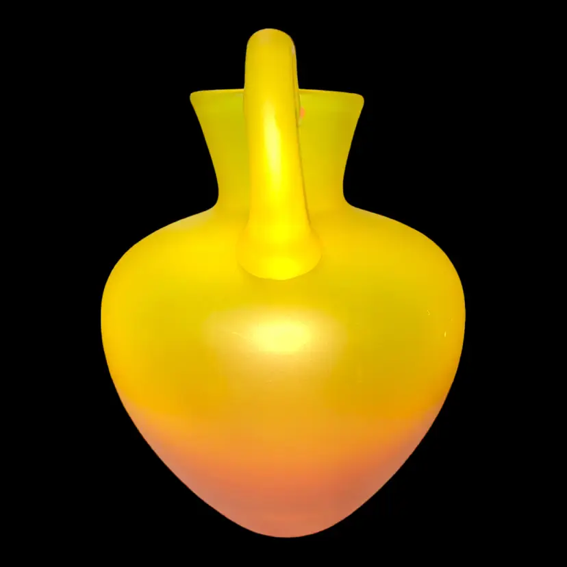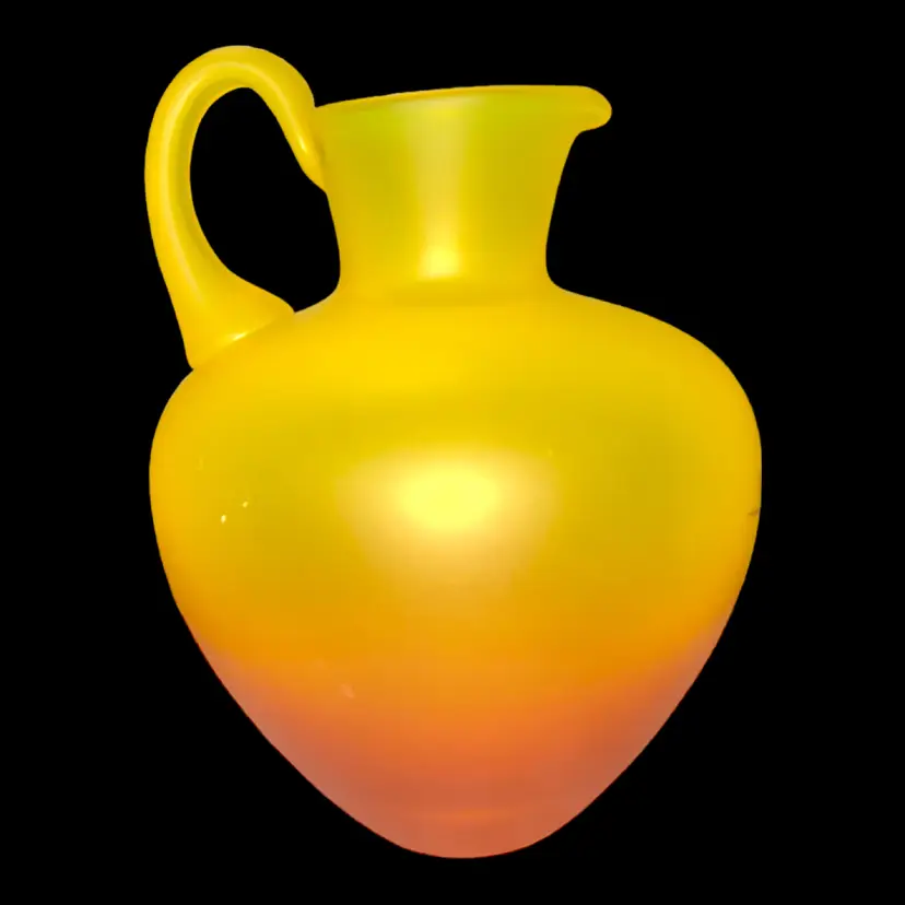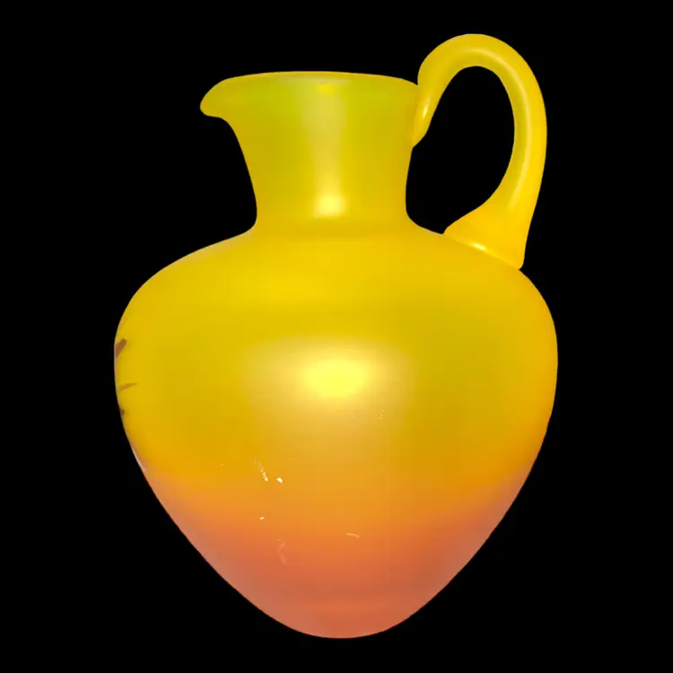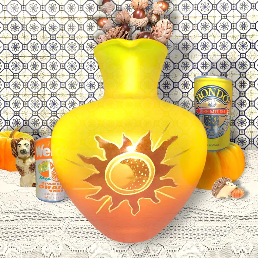 •clear glass with an ombre yellow to orange paint job with gold and burnt-orange sun on front; designed to be used as a vase not a pitcher for beverages