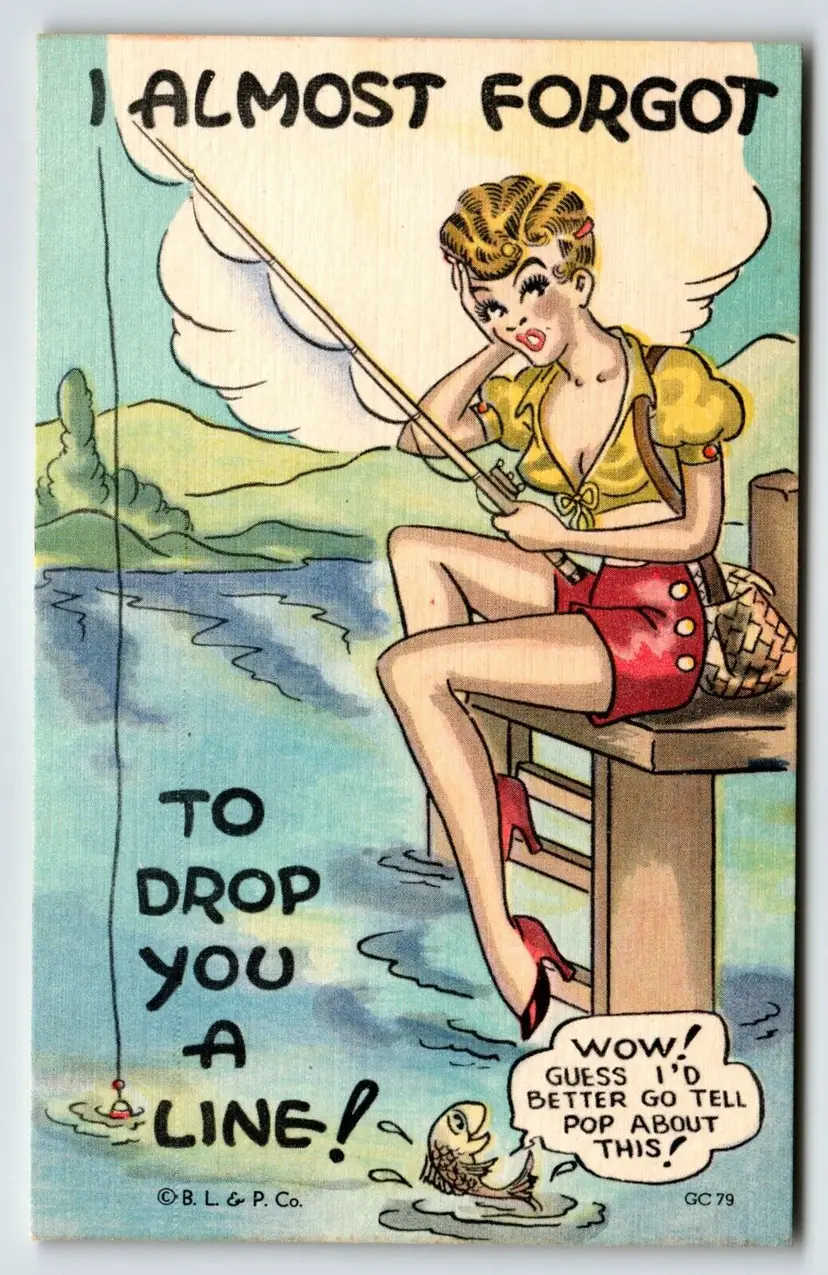 Women Fishing Drop You A Line Sexy Linen Postcard Comical Humor Unposted Vintage