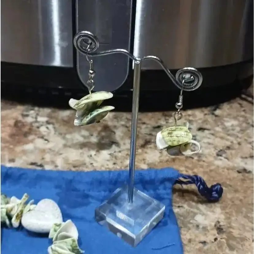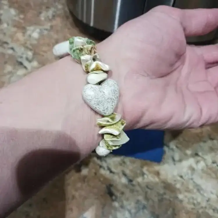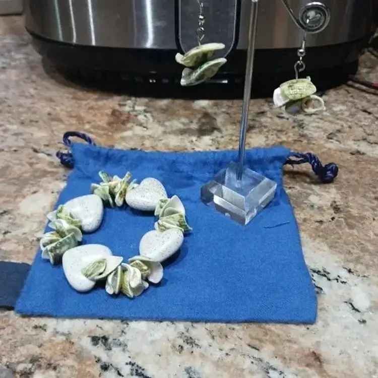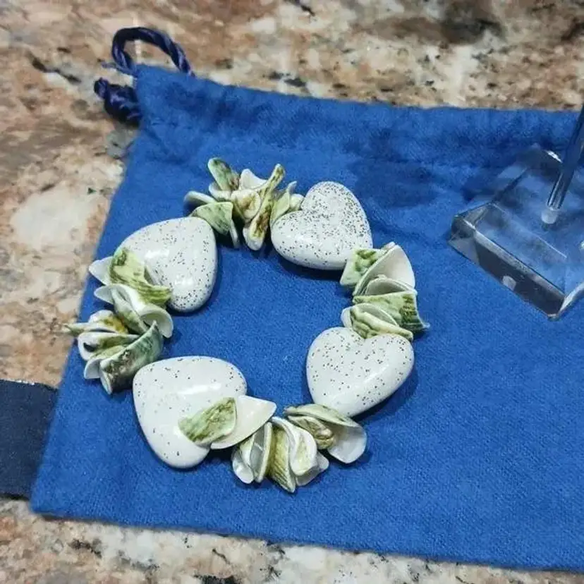 Women's Green & White Seashell Heart Stretch Bracelet W/Matching Earrings. Pre-owned, Great condition.