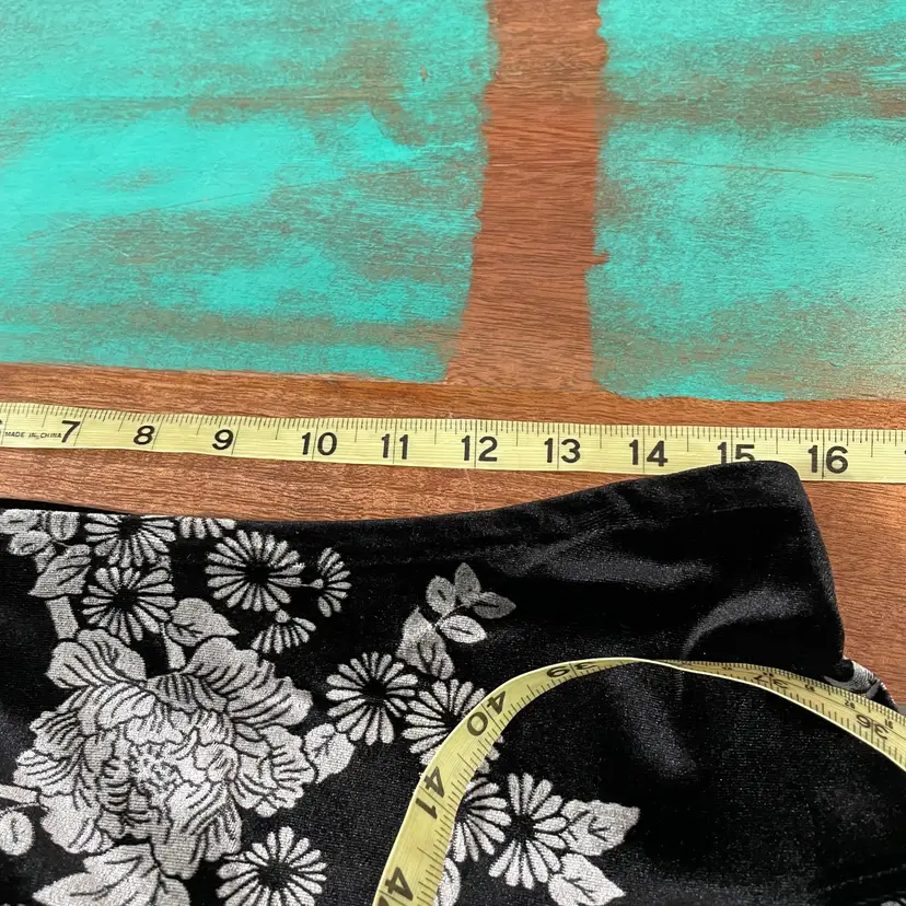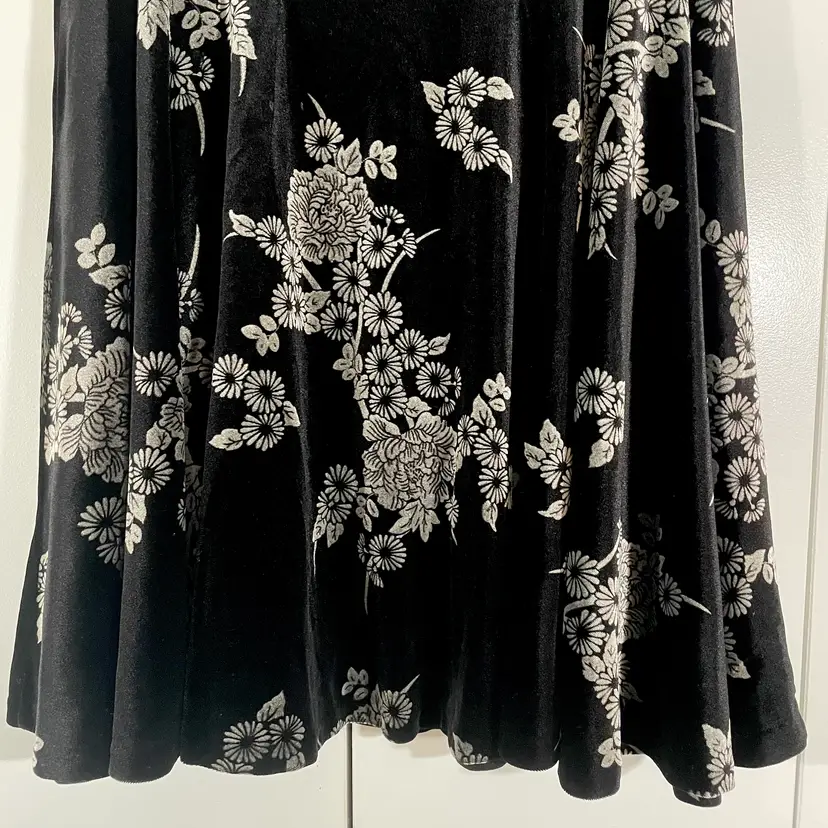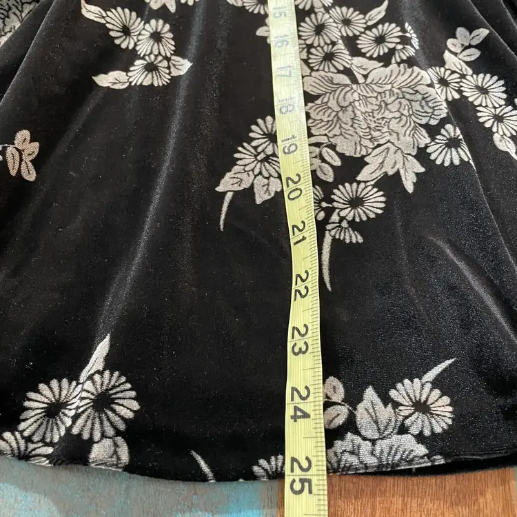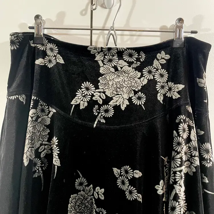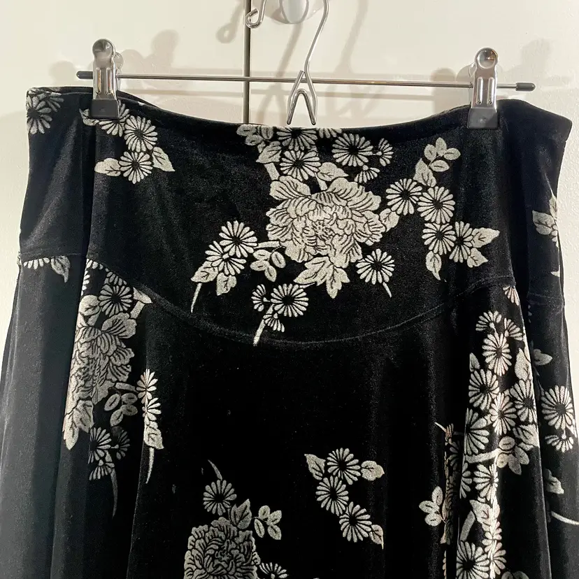 Apostrophe Velvet Skirt A-Line Whimsigoth Swing Condition: Used but in very good condition. Lightly worn. No holes, discoloration or damage. Check out and zoom in on photos for more details. Color: Black with silver floral Size: M (10/12) Measurements taken with item laid flat *Waist: (across the waistband) 15.5" *Length (from waistband to bottom hem) 25"