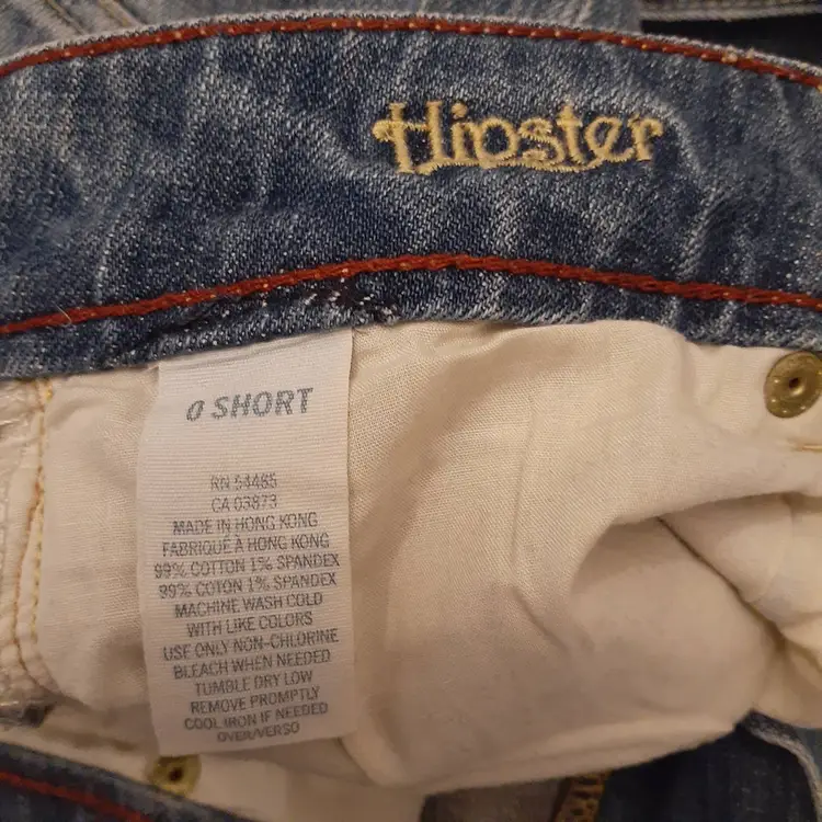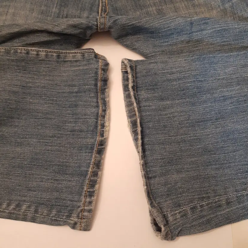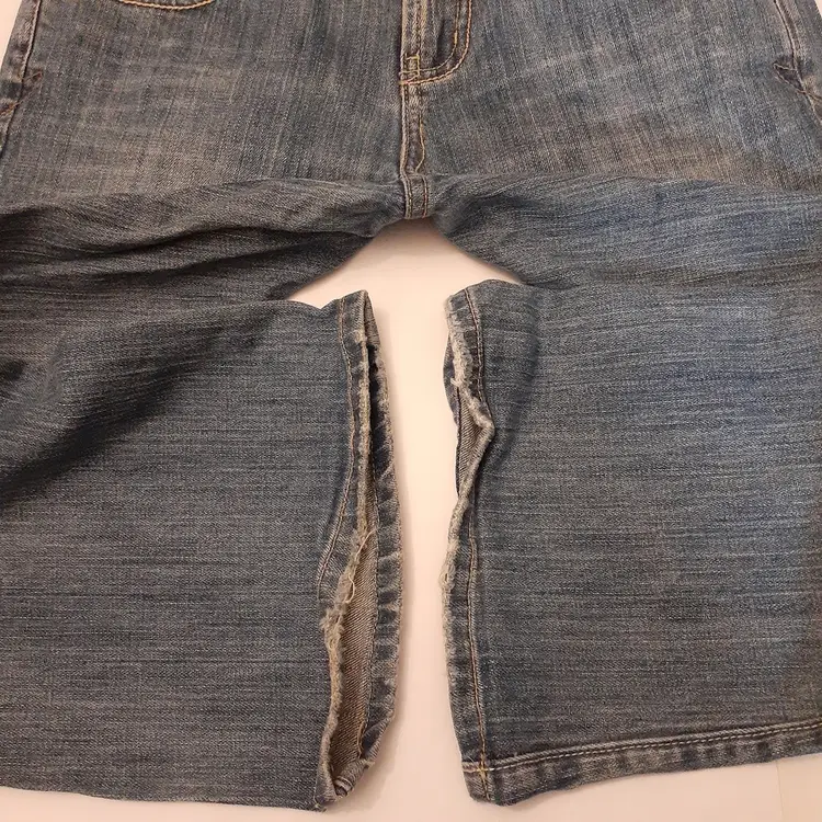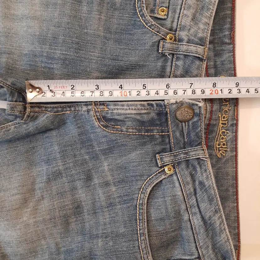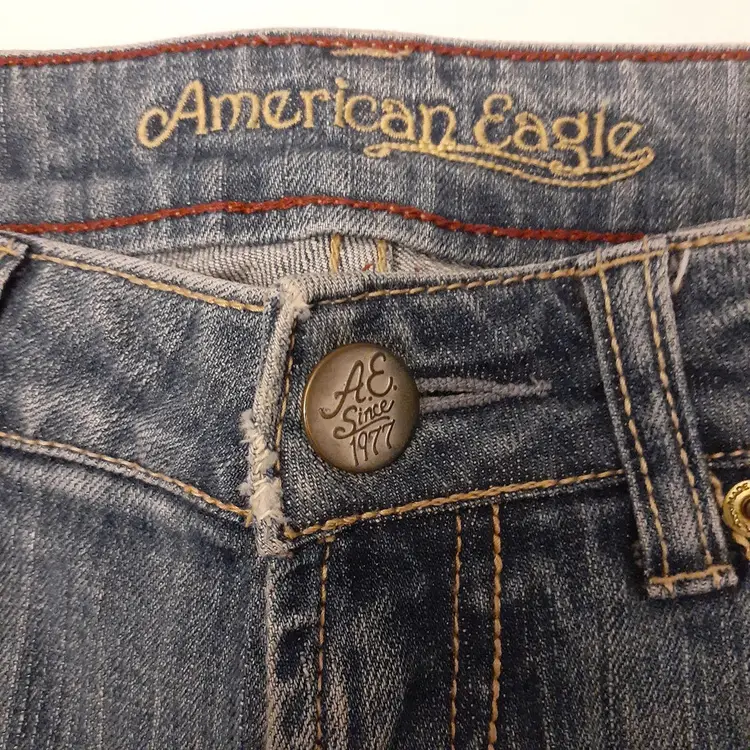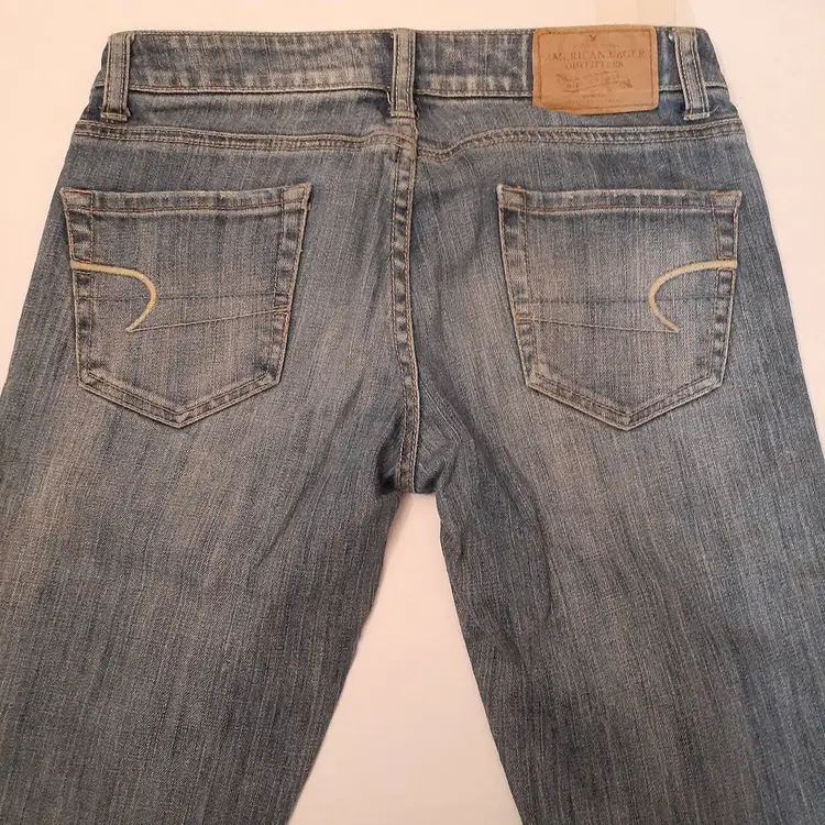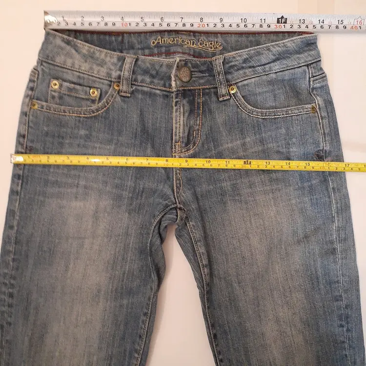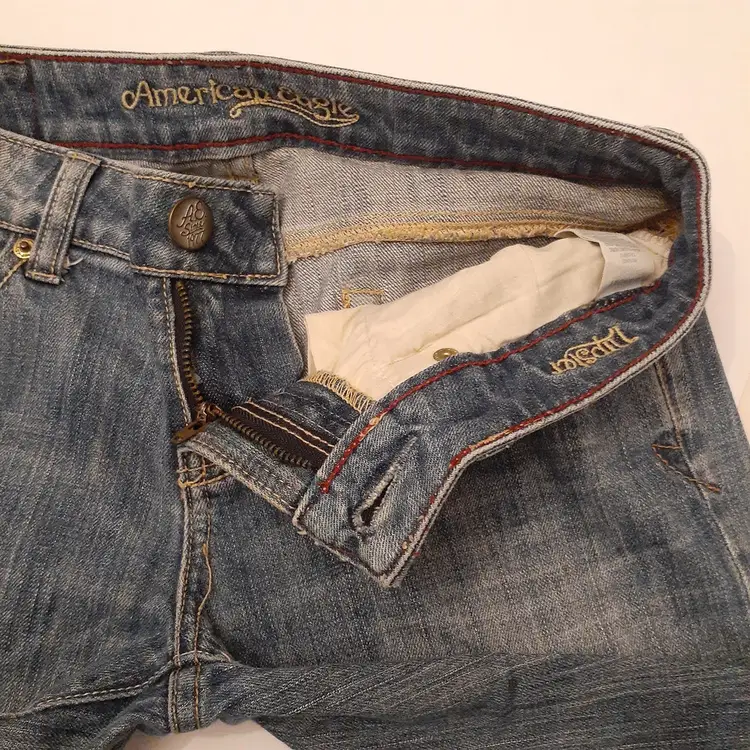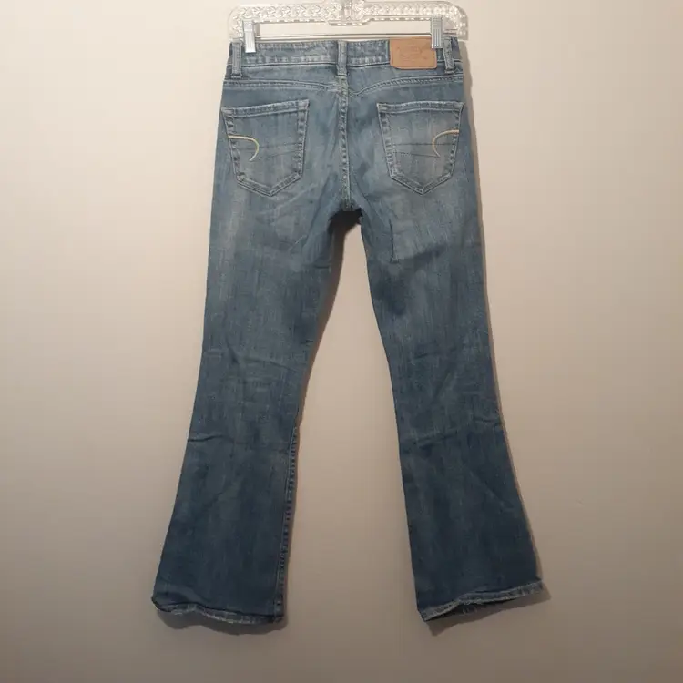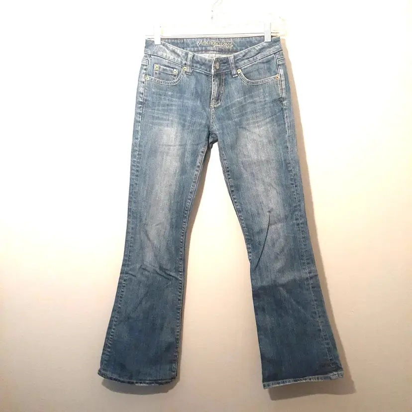 American Eagle Hipster womens flare jeans 0x28 short blue boot cut vintage Y2K loose stitch on crotch and worn cuffs as seen in photos refer to photos for flat lay measurements good pre-loved condition