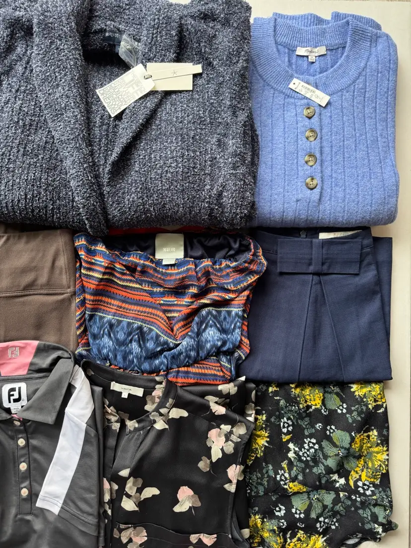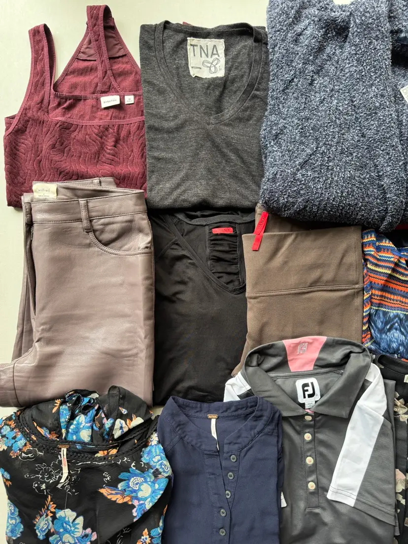 Madewell Sweater NWT / Merino Wool - Alpaca Blend Barefoot Dreams Sweater NWT Free People Dress NWOT, Floral shorts in great condition, Blouse in great condition Boden Skirt like a new Vince Jumpsuit 100% Polyester excellent condition Babaton lace bodysuit excellent condition TNA v-neck shirt with embroidered logo on the side Wilfred Vegan Leather Pants Spanx leggings ( sign of general use - in great condition ) Spanx long sleeve t-shirt with ruched sleeves FJ golf dress with zip pockets Maeve dress
