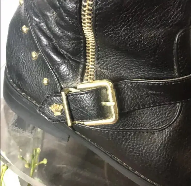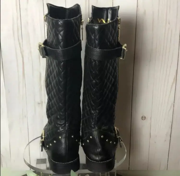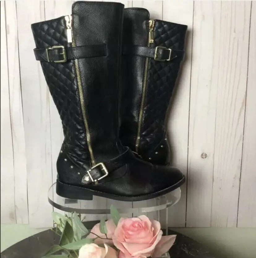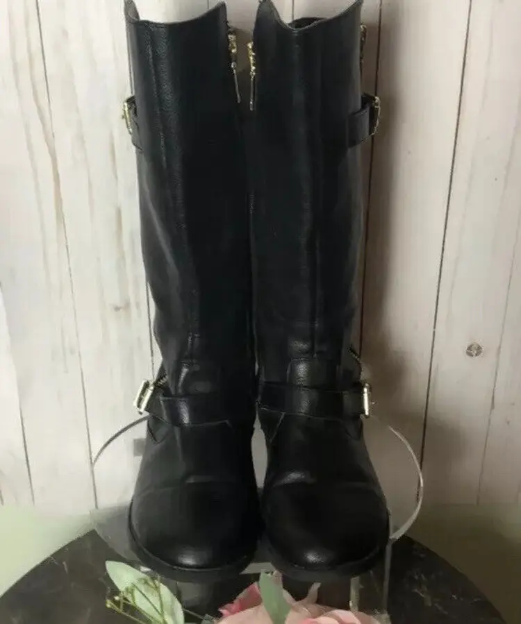 Toe Shape: Round Toe Closure: Pull On/Zip US Shoe Size: 5 Occasion: Casual Size: 5 Heel Height: Low (3/4 in. to 1 1/2 in.) Accents: Studded Vintage: No Department: Women Style: Knee High Boots Features: Stud Season: Fall, Spring, Summer, Winter Width: Medium (B, M) UK Shoe Size: UK 5.5 Pattern: Studded Character: Boots EU Shoe Size: EUR 38.5 Color: Black Lining Material: Synthetic Sub-Style: Tall Boots Brand: Nina Size Type: Medium Type: Boot Heel Style: Block Theme: Equestrian Stud Shape: Circular Shoe Width: M Upper Material: Leather Performance/Activity: Riding