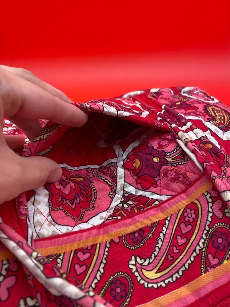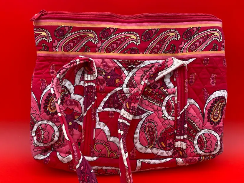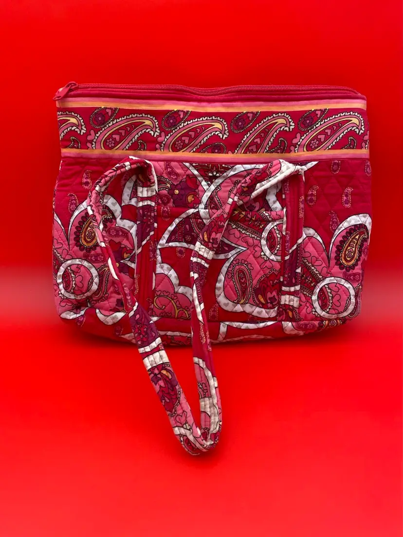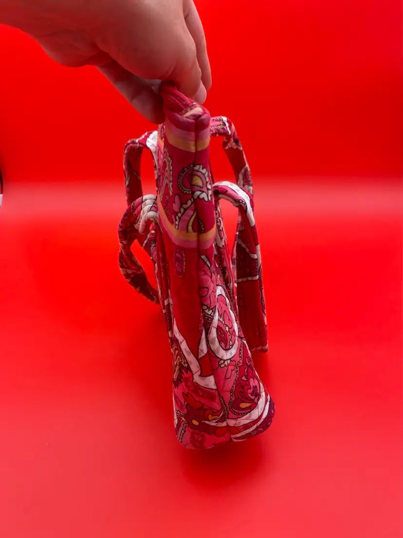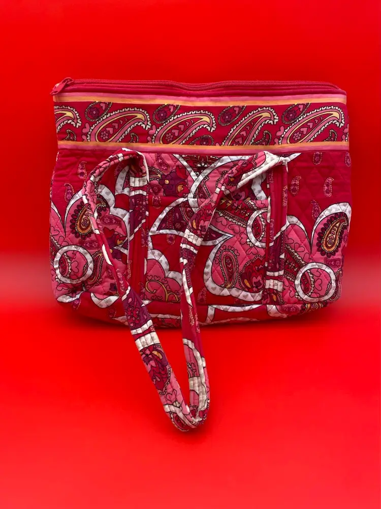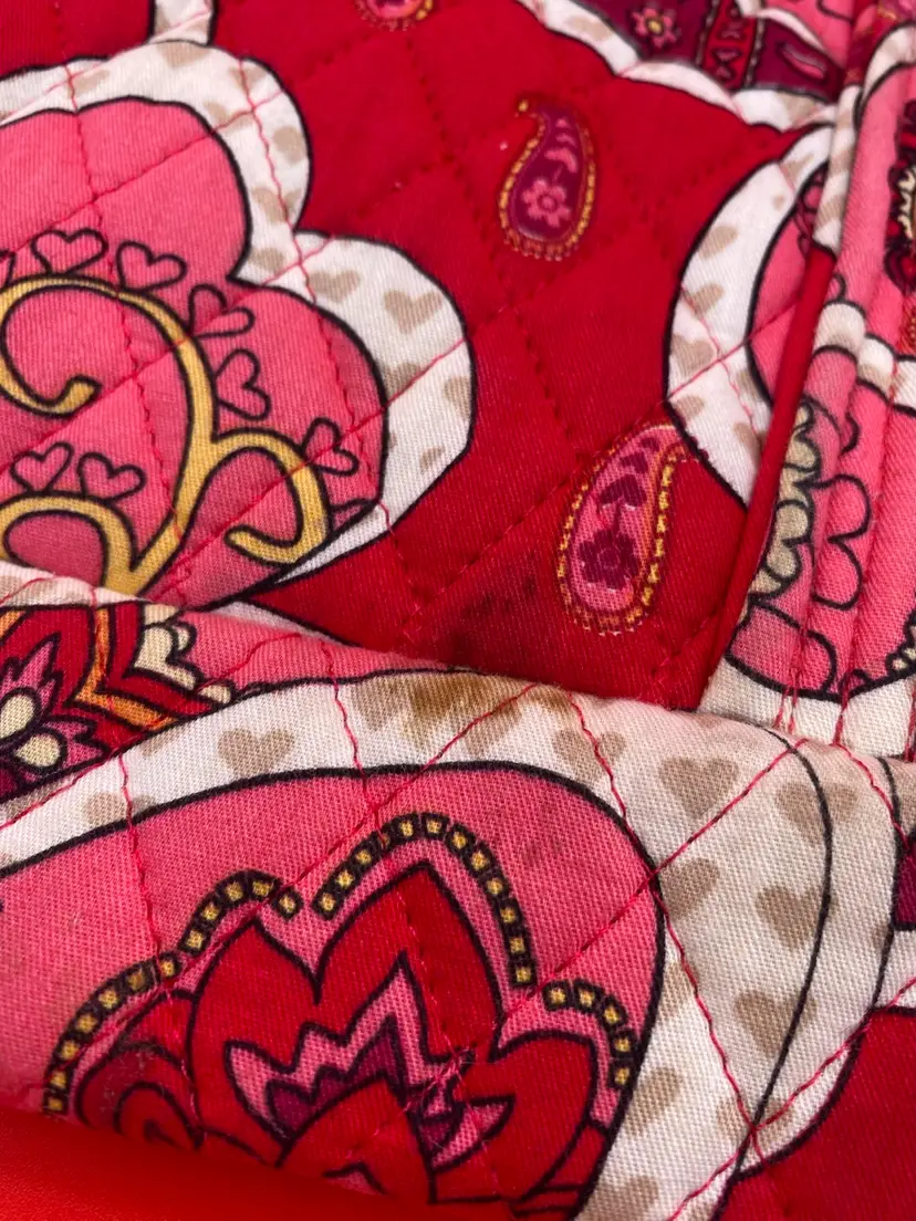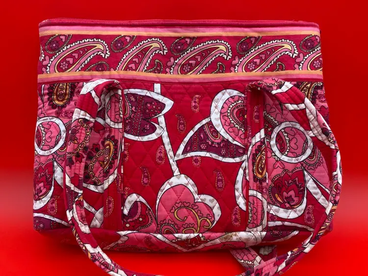 You are purchasing one Women's Red Quilted Floral, Paisley and Heart Pattern Handbag. This Handbag is around 14 inches wide and 10 inches deep. This Handbag is in overall good condition. See final two images for a hole in the interior lining of the bottom (does not go through the exterior fabric) and a small area of discoloration on the bottom of the exterior.
