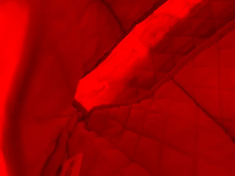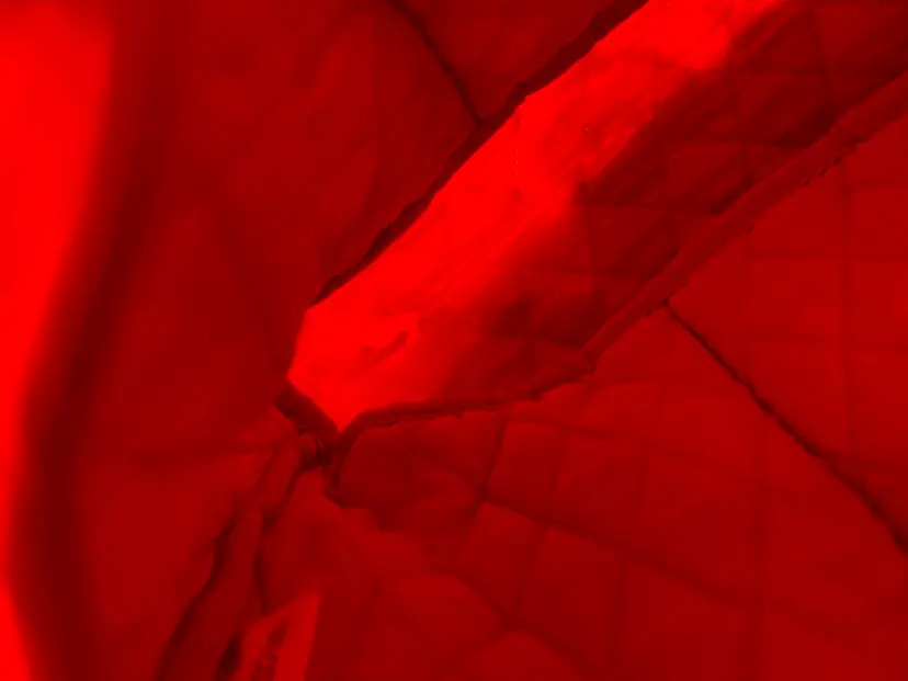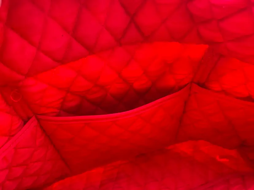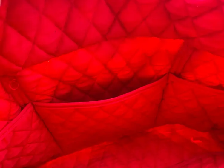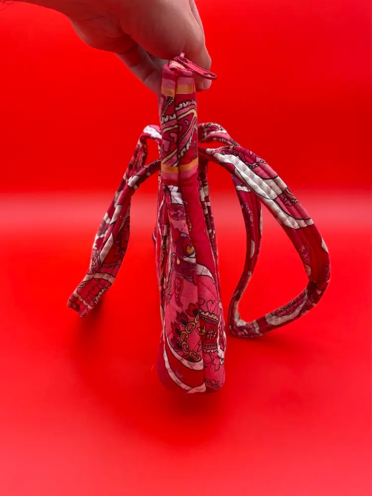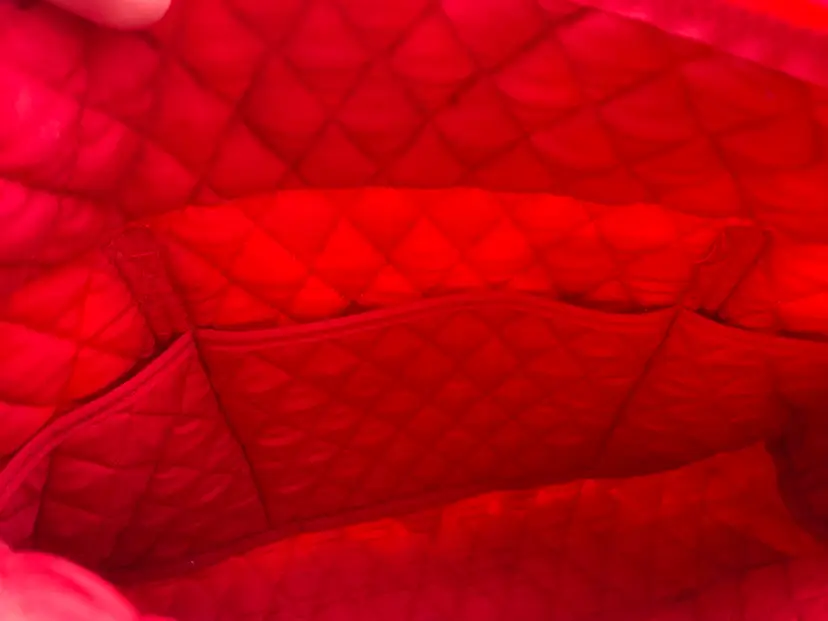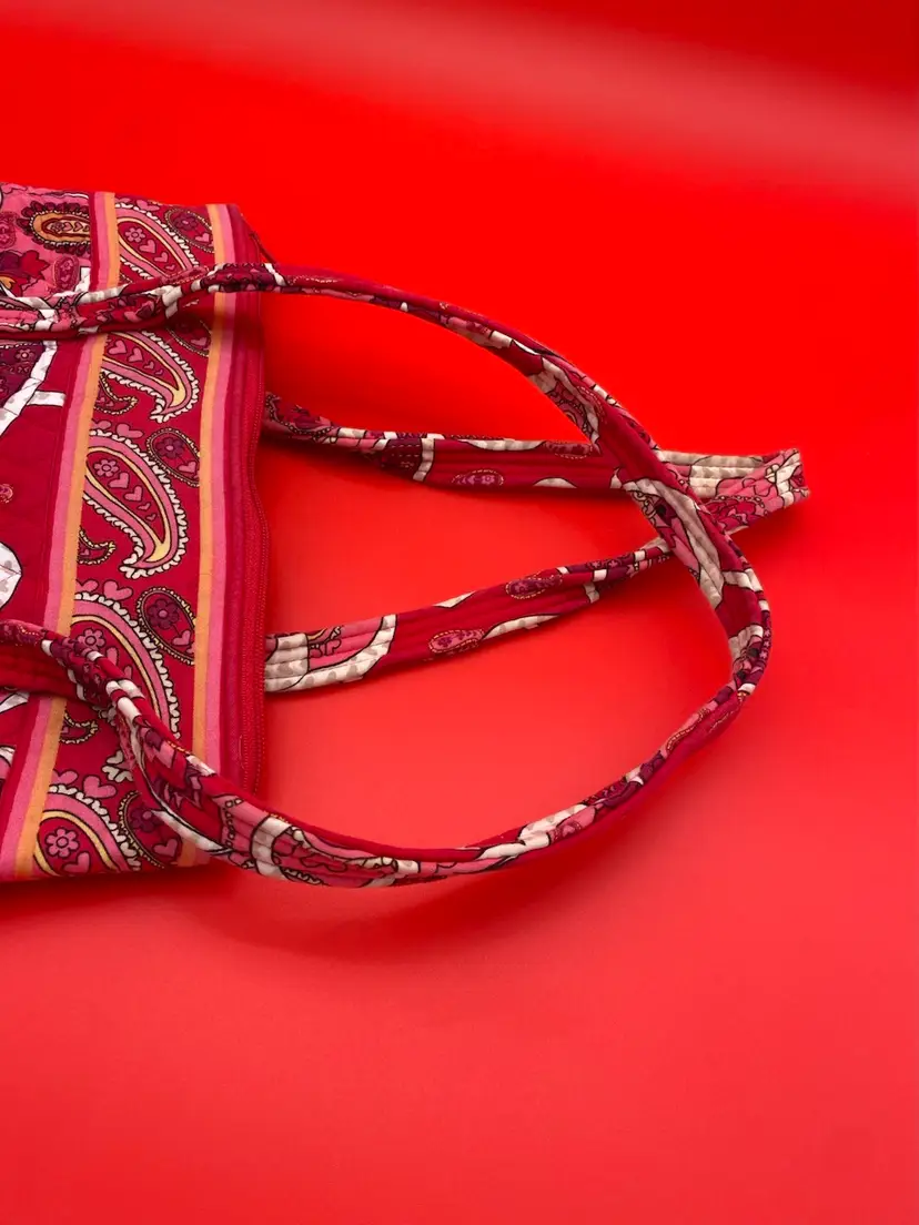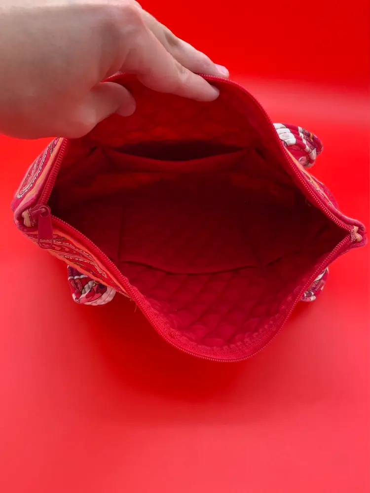 You are purchasing one Women's Red Quilted Floral, Paisley and Heart Pattern Handbag. This Handbag is around 14 inches wide and 10 inches deep. This Handbag is in overall good condition. See final two images for a hole in the interior lining of the bottom (does not go through the exterior fabric) and a small area of discoloration on the bottom of the exterior.