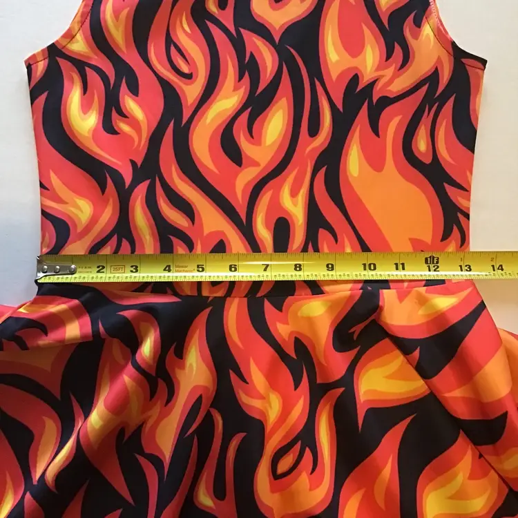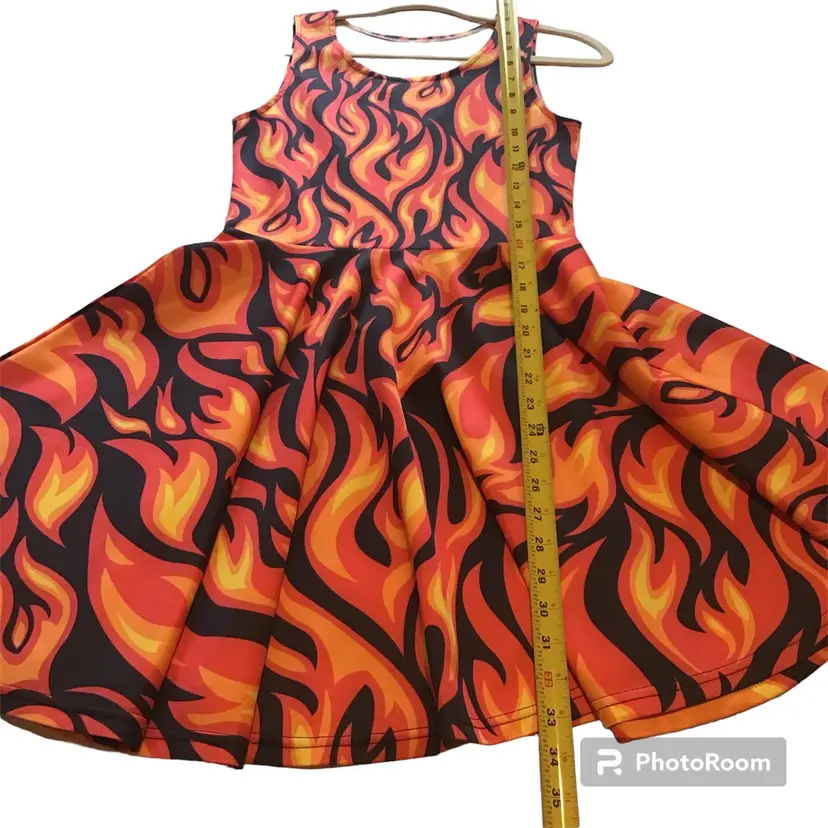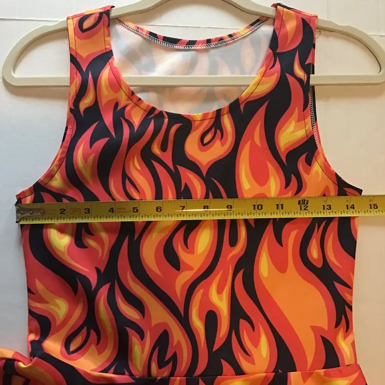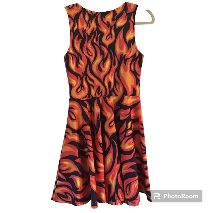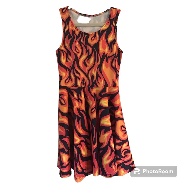 Women’s Sleeveless Hot Flame Fire Pattern Fit & Flare Full Circle Dress XXS. No tags. Spandex stretchy type material. Please see measurements. Please note there is no white spot at the top. Excellent condition.