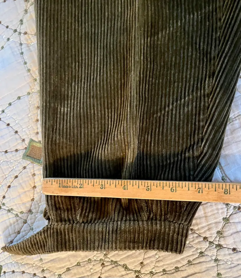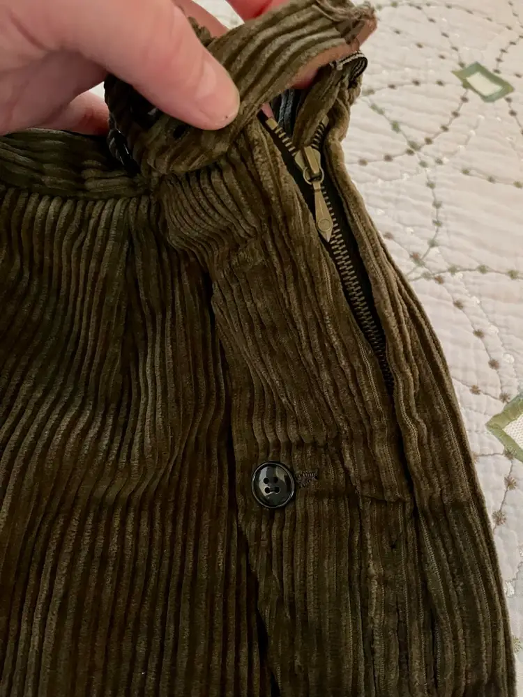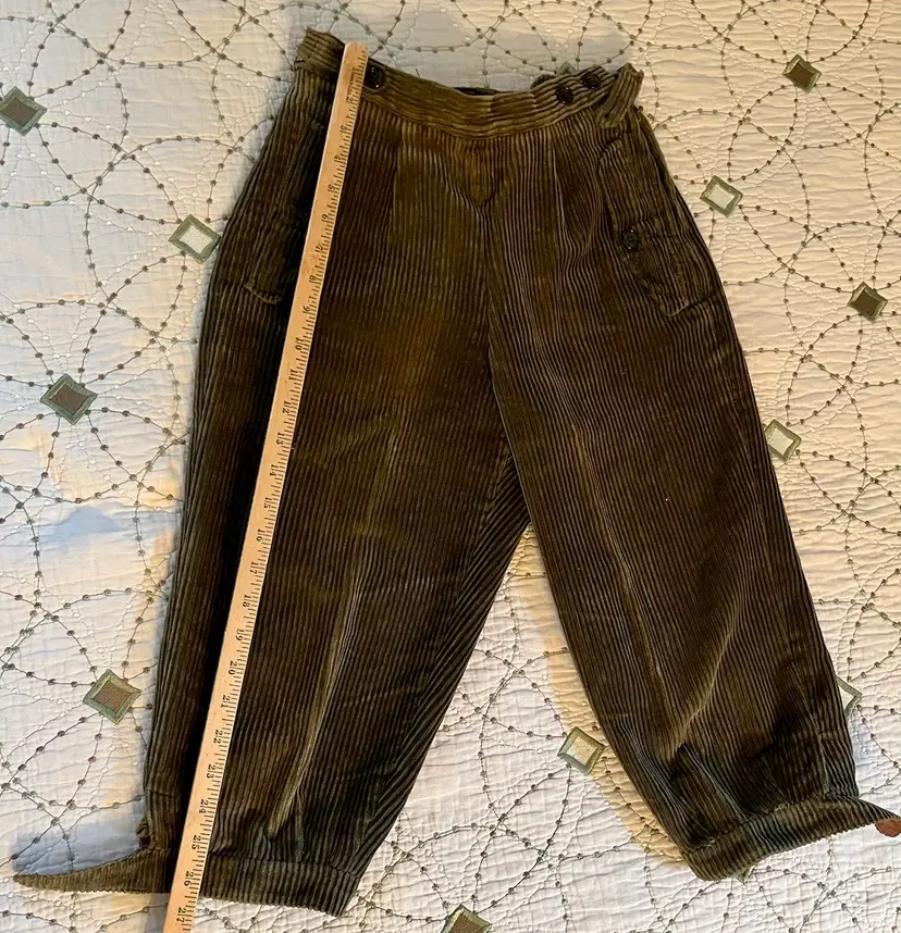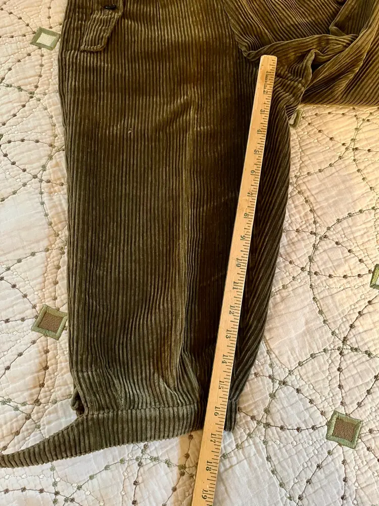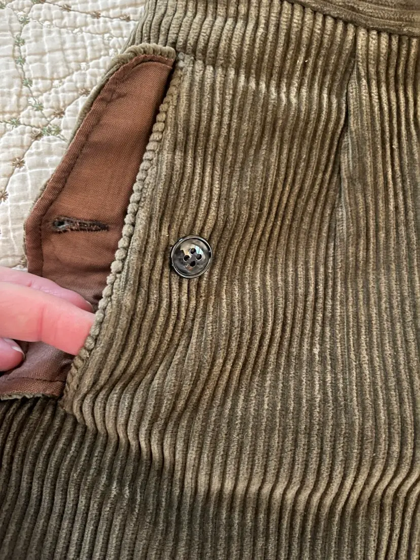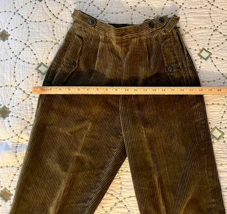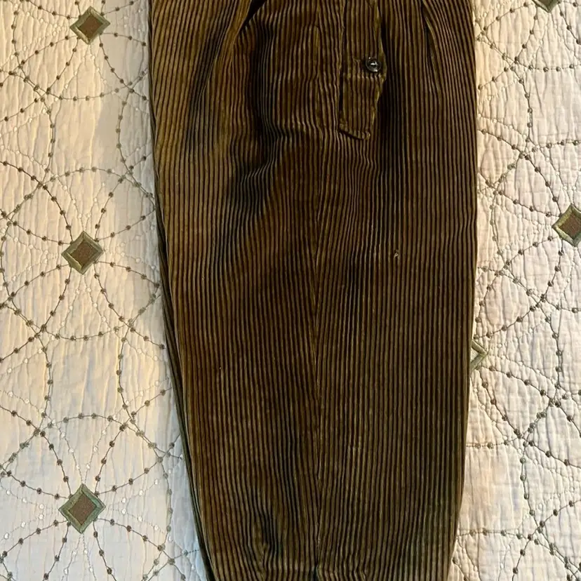 Please look at all the photos prior to deciding to make a purchase. This is a gently used / pre-owned item with a small snag on the front leg fabric. Buyer may also desire to have cleaned ~ these have been hanging in a non-smoking household but there are “household” or a fragrance (possibly softener(?) smell. The vintage wooden pants hanger is included as well. There may be a slight sun fading as well. Buyer is strongly encouraged to review the photos and decide for themselves its condition as my interpretation may not align with yours. Prior to a purchase, questions not answered in photos, details, description are welcome.