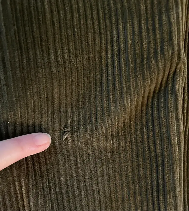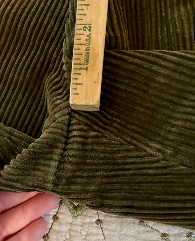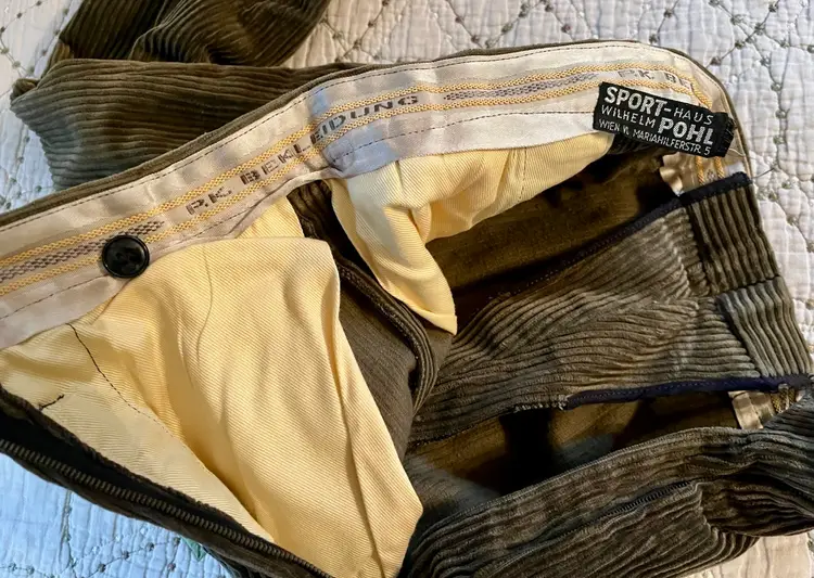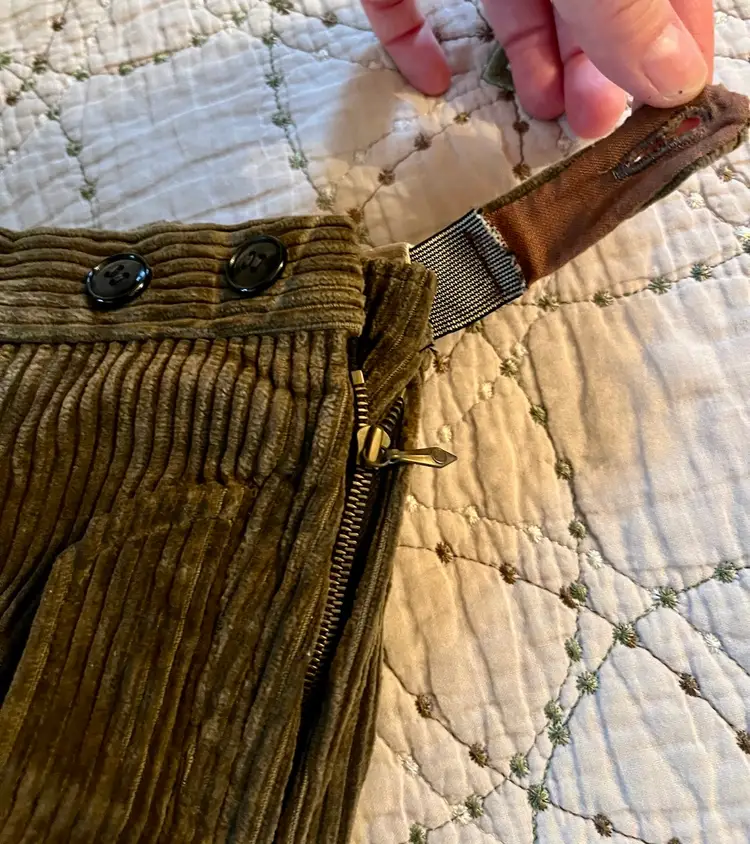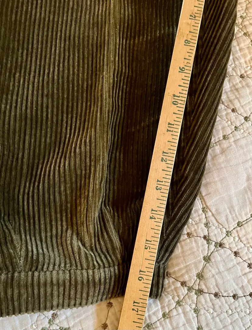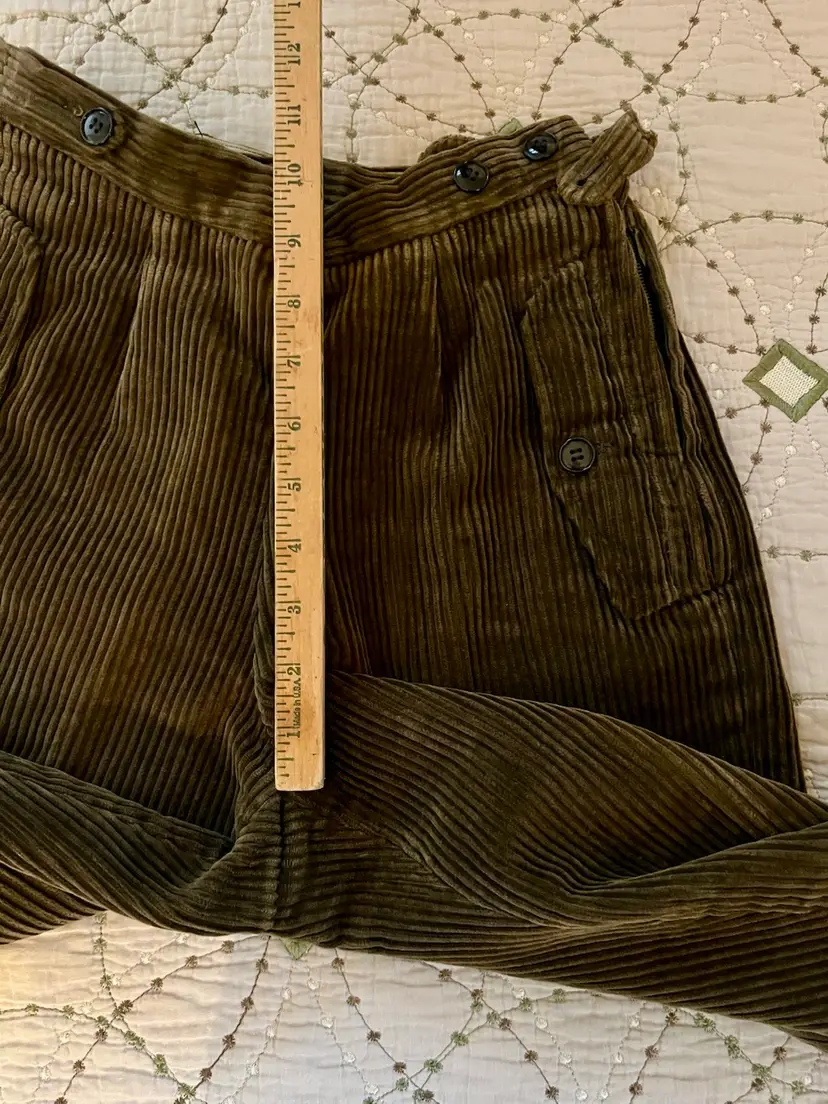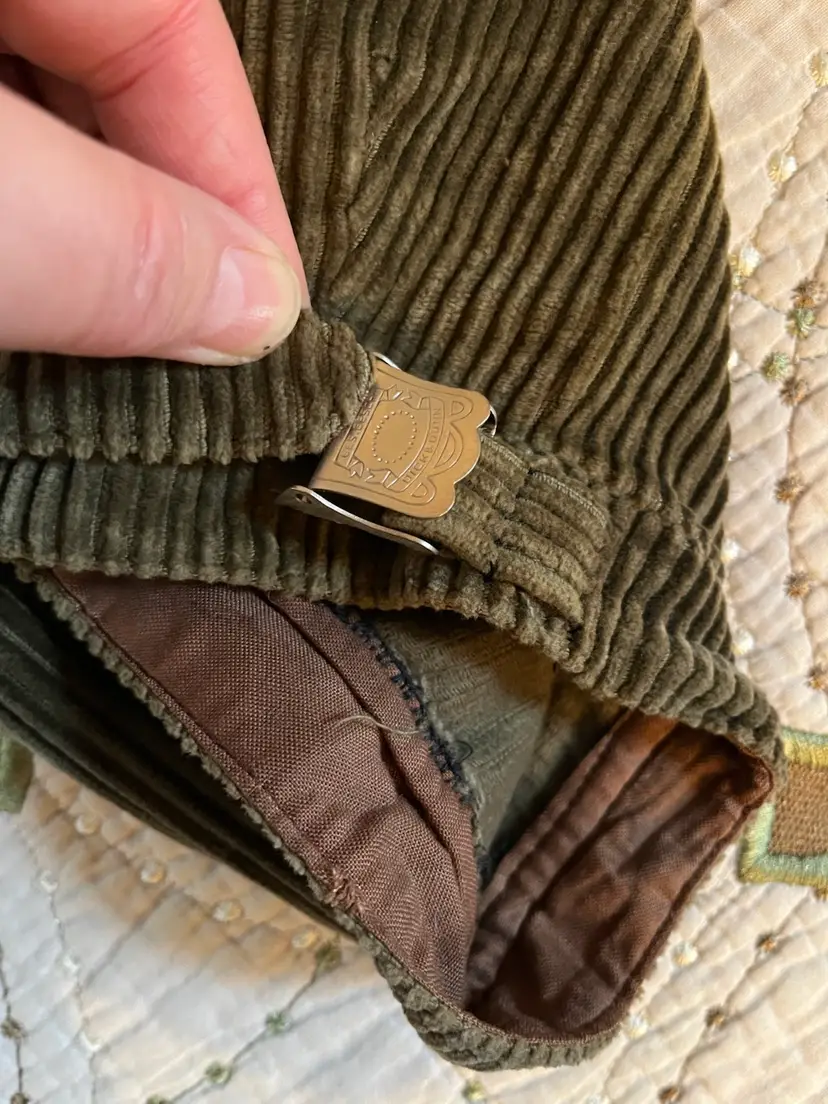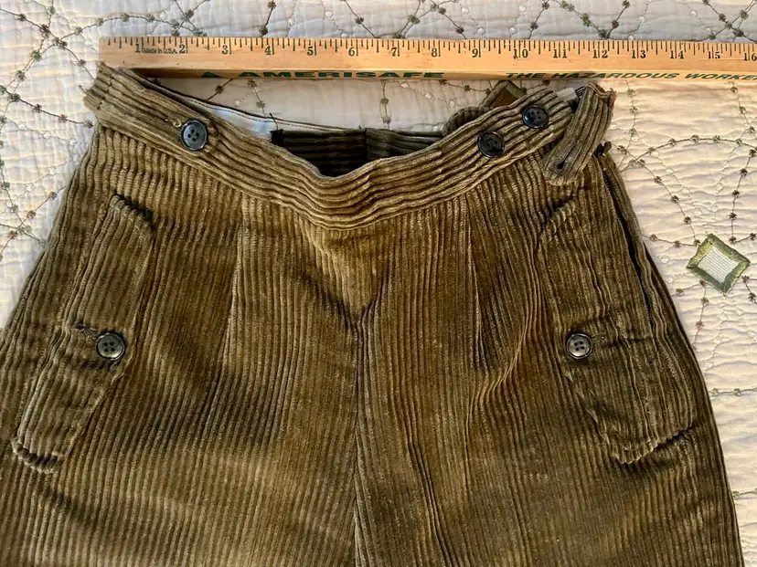 Please look at all the photos prior to deciding to make a purchase. This is a gently used / pre-owned item with a small snag on the front leg fabric. Buyer may also desire to have cleaned ~ these have been hanging in a non-smoking household but there are “household” or a fragrance (possibly softener(?) smell. The vintage wooden pants hanger is included as well. There may be a slight sun fading as well. Buyer is strongly encouraged to review the photos and decide for themselves its condition as my interpretation may not align with yours. Prior to a purchase, questions not answered in photos, details, description are welcome.