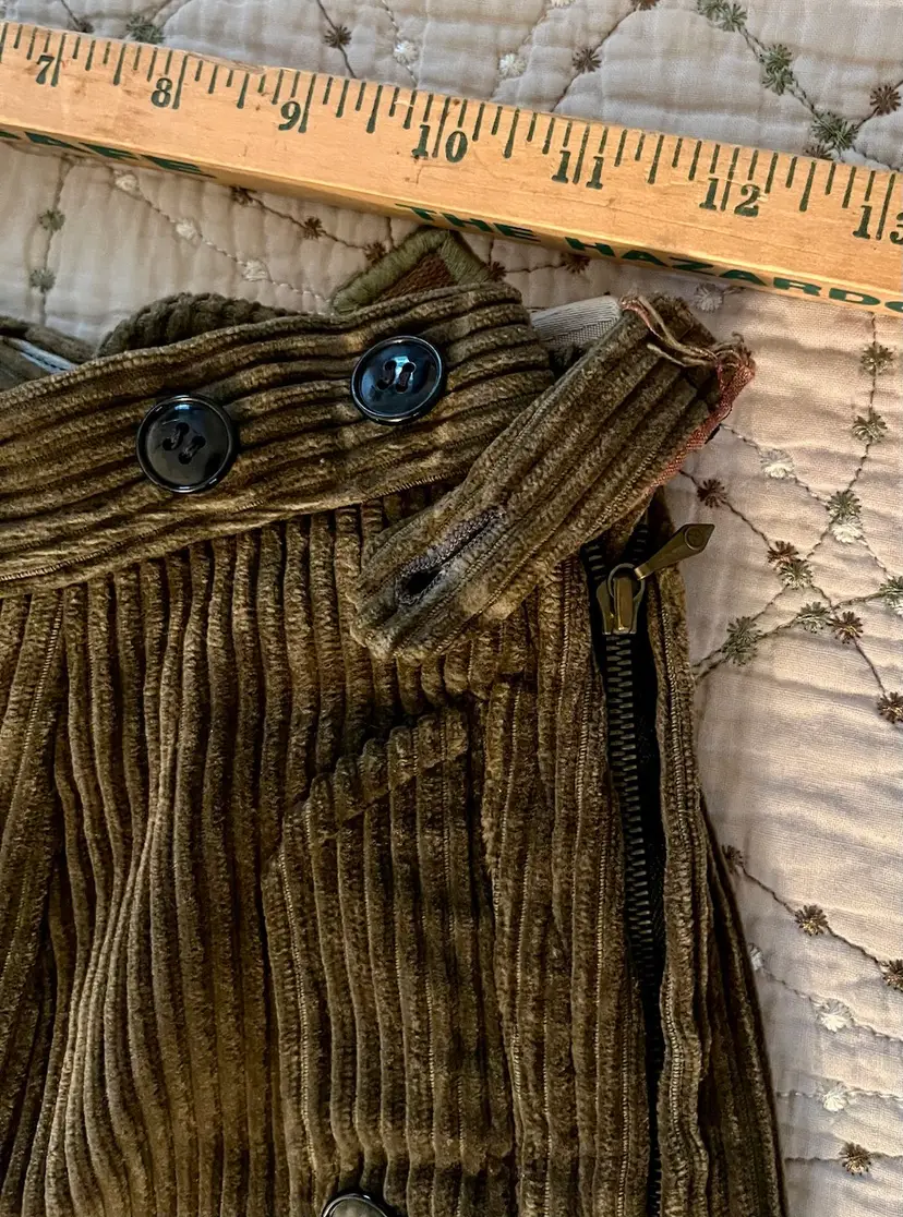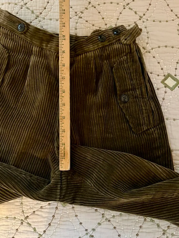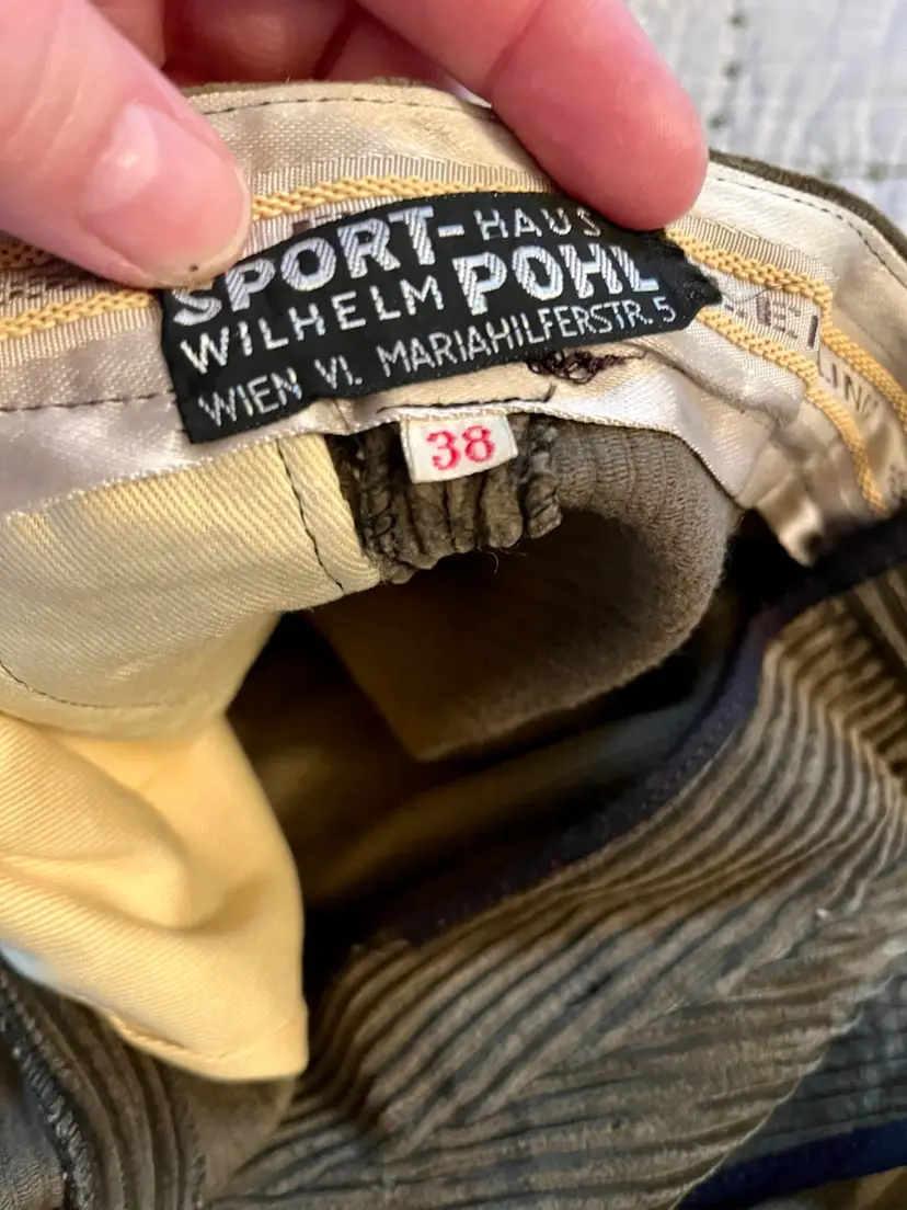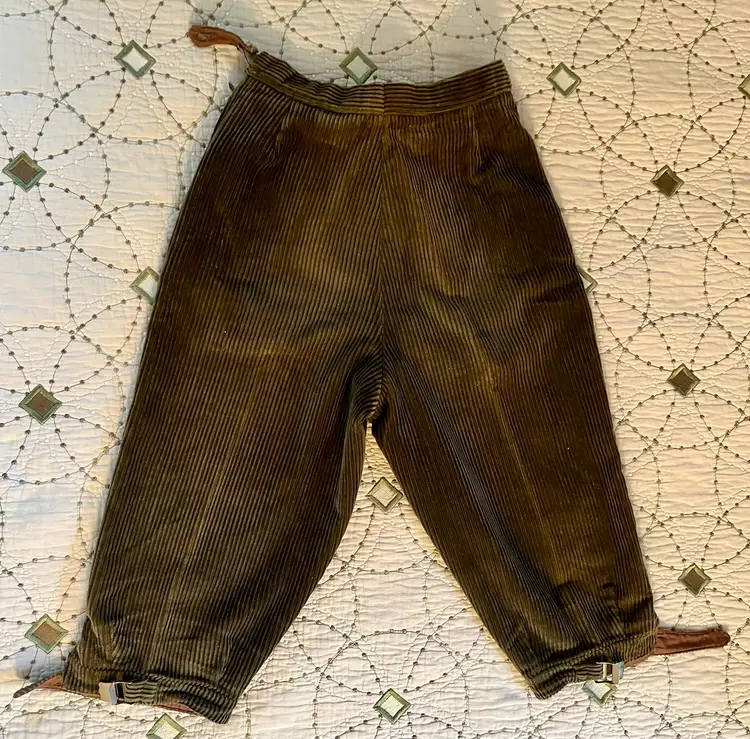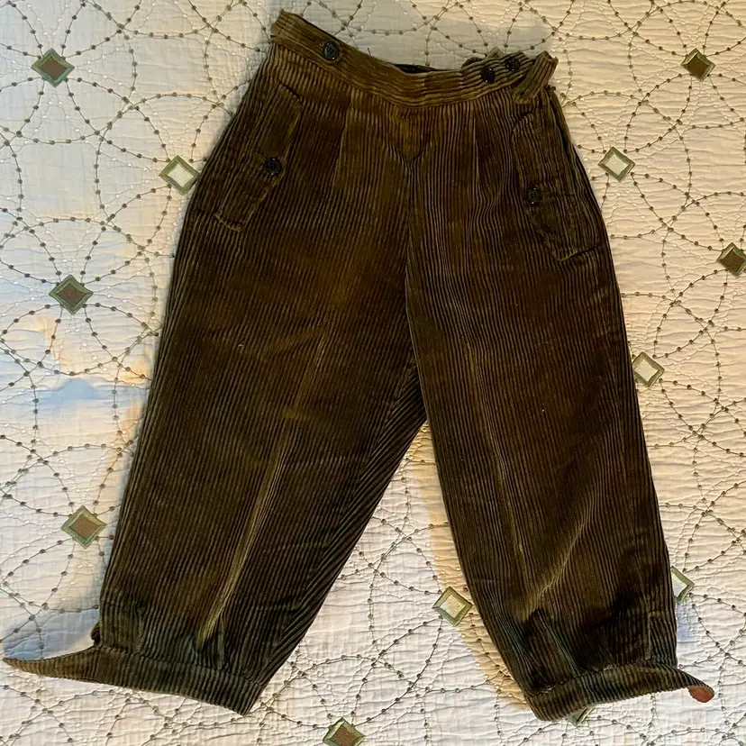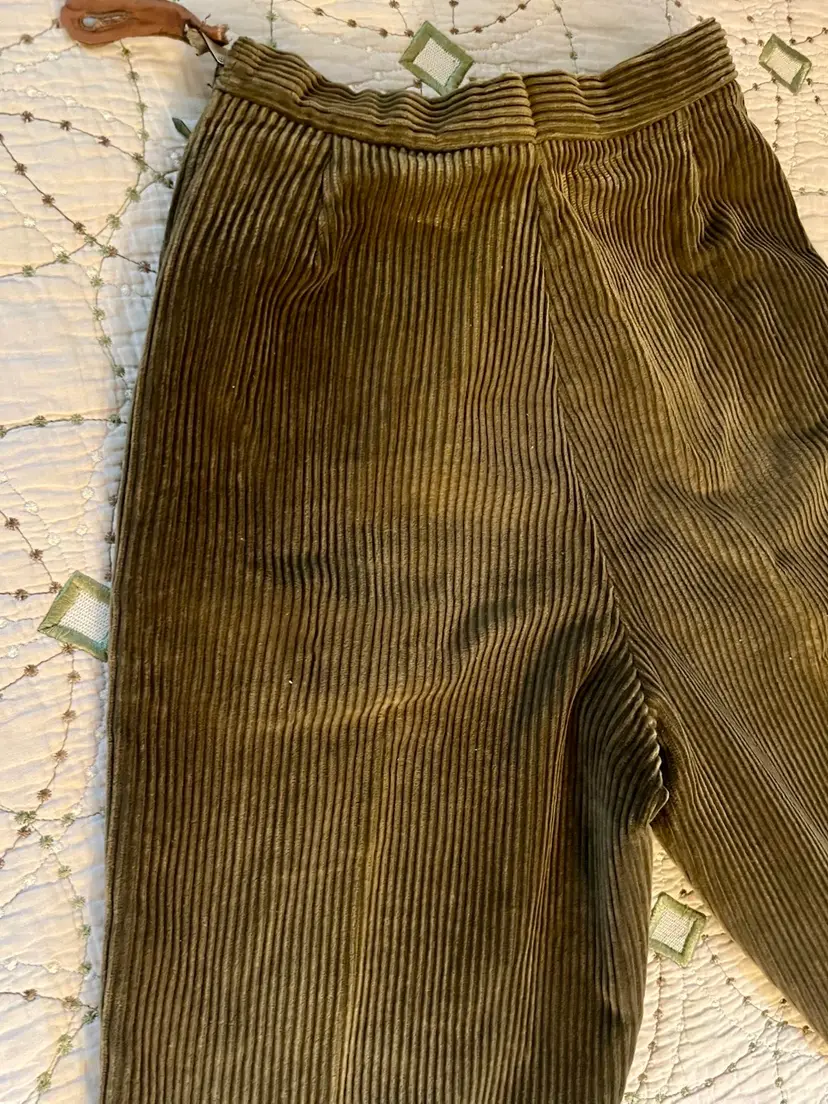 These vintage women's EURO size 38 or USA size 8 green corduroy Nordic cross country ski knickers by Sport Haus Wilhelm Pohl offer a European style with a tapered to just below the knee design. The pants feature a gusset crotch for ease of mobility and are made of a cotton or a cotton blend fabric, making them suitable for winter and fall activities. With a classic solid pattern and a combination of side zip and button closure, these knickers or knickerbocker style provide functionality for skiing enthusiasts (snow shoe too) or with a pair of complimentary tights for casual wear, portfolio or portrait photographing.