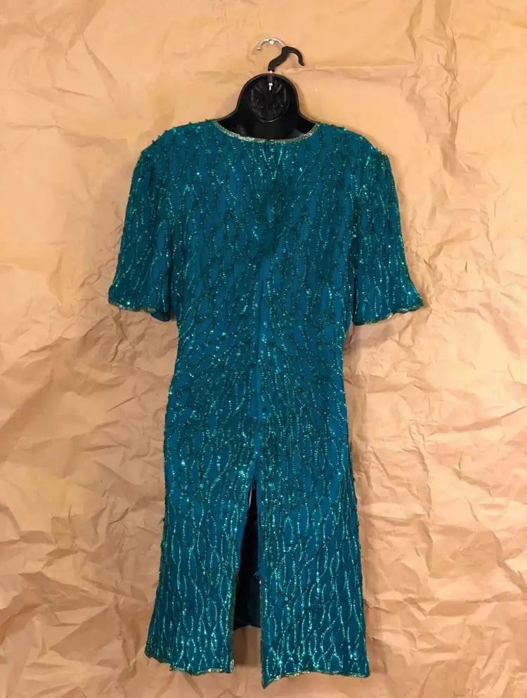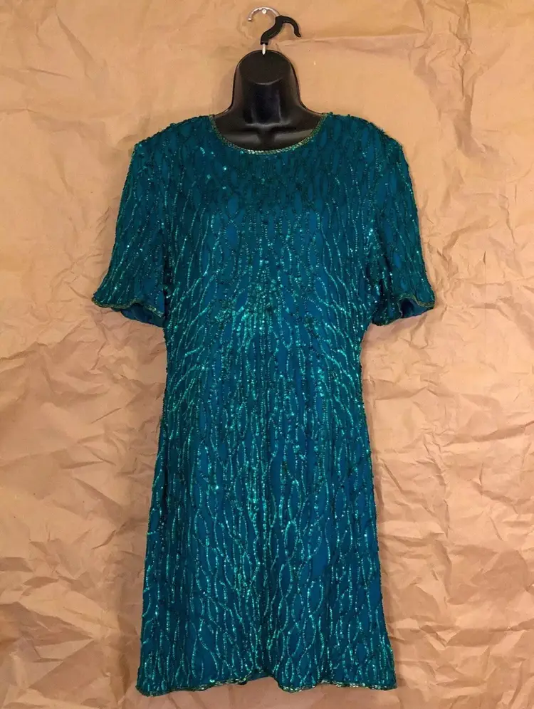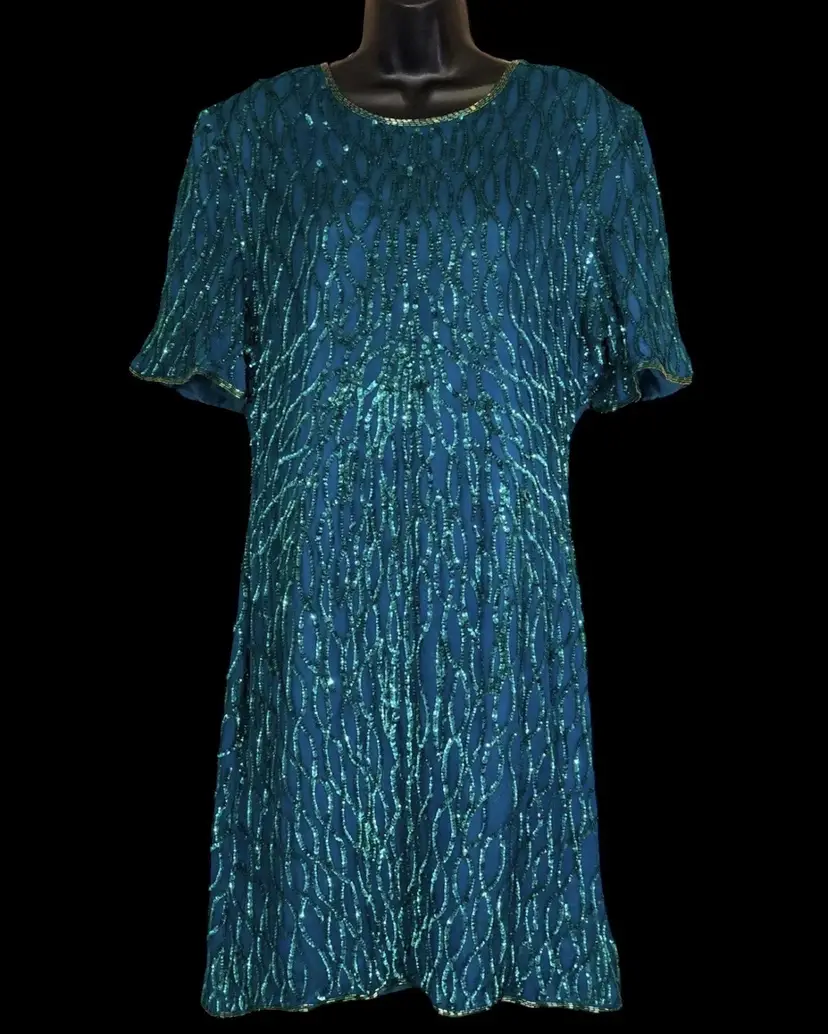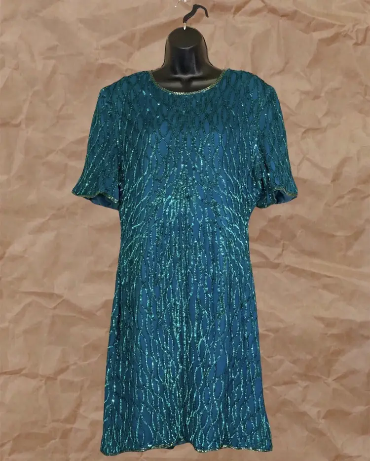 Vintage Laurence Kazar New York Green Beaded Dress Label: Laurence Kazar, New York Fabric: 100% Silk Size: XL Length: 39” Front Pit to Pit: 21” Waist: 36”