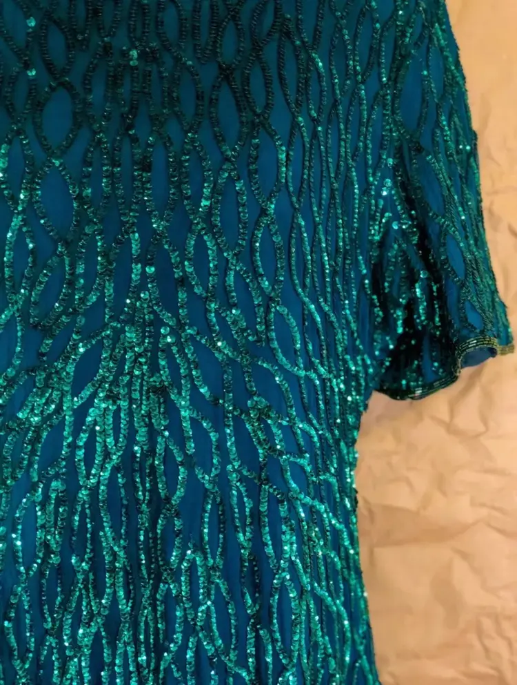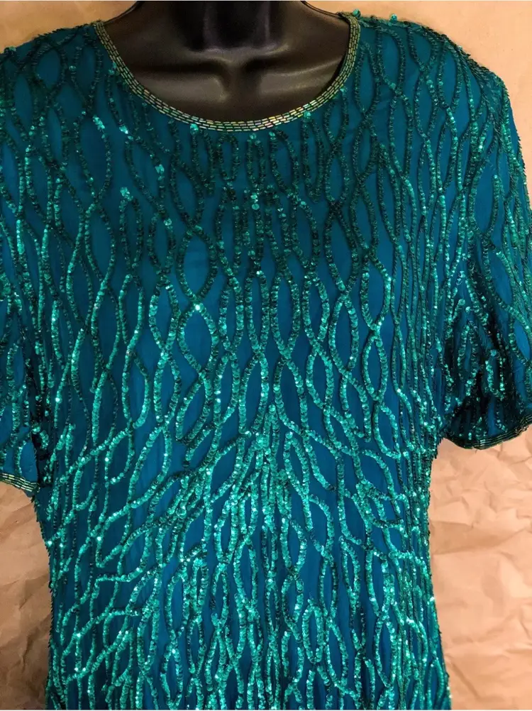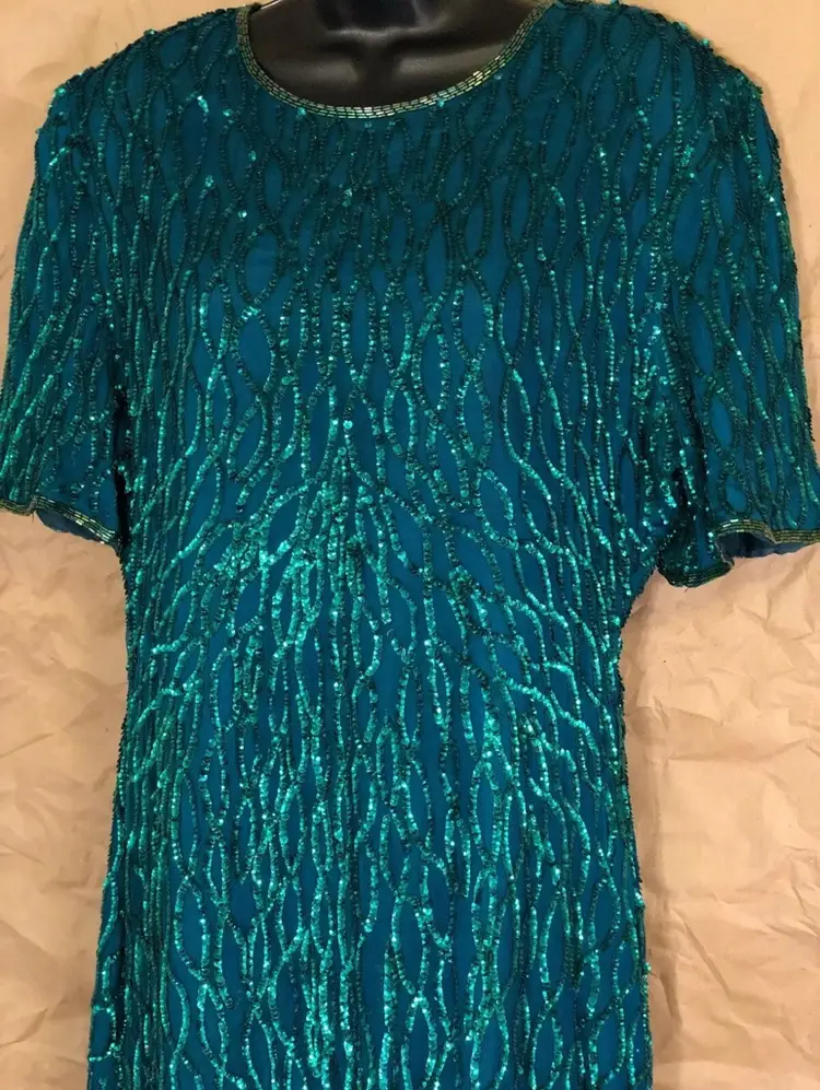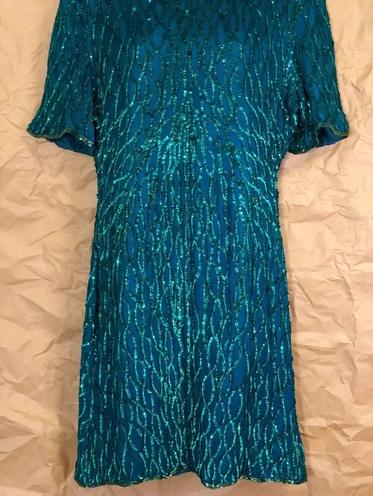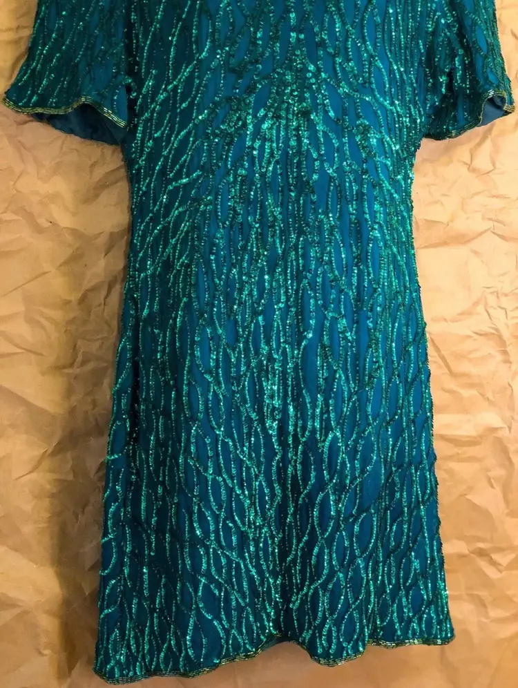 Vintage Laurence Kazar New York Green Beaded Dress Label: Laurence Kazar, New York Fabric: 100% Silk Size: XL Length: 39” Front Pit to Pit: 21” Waist: 36”