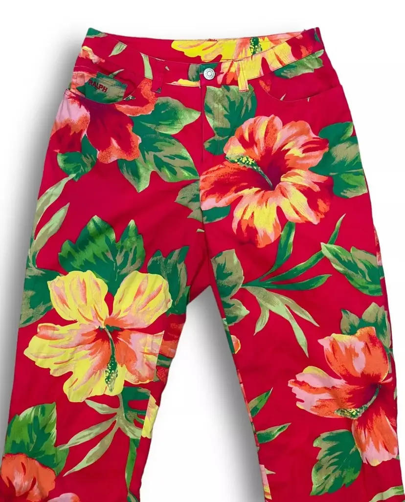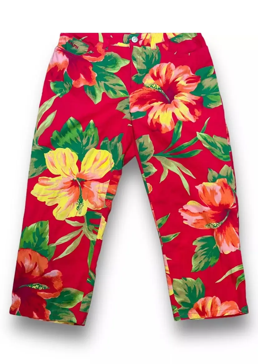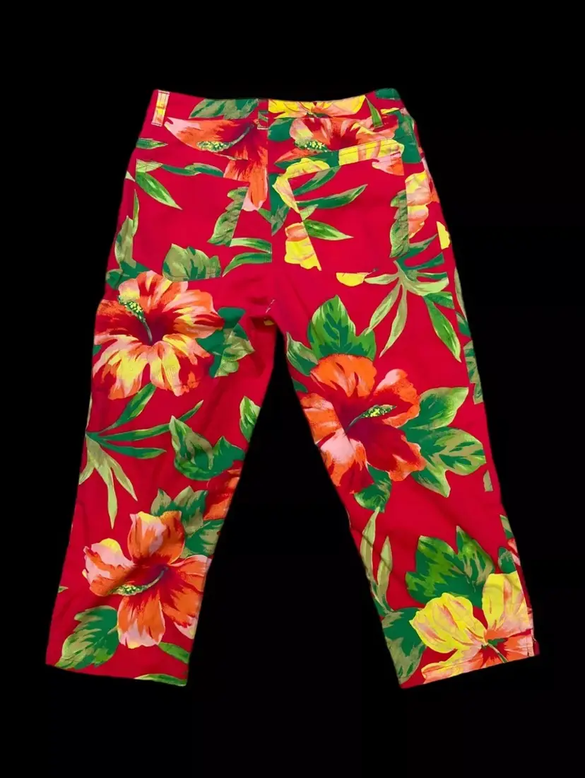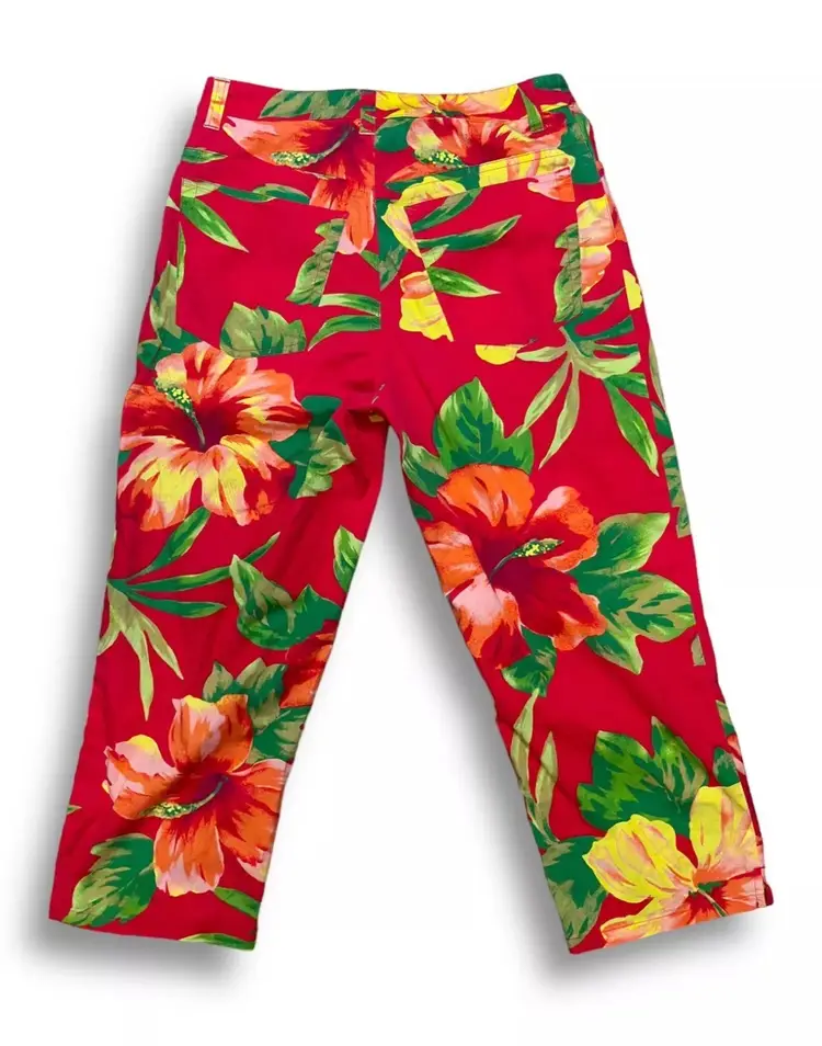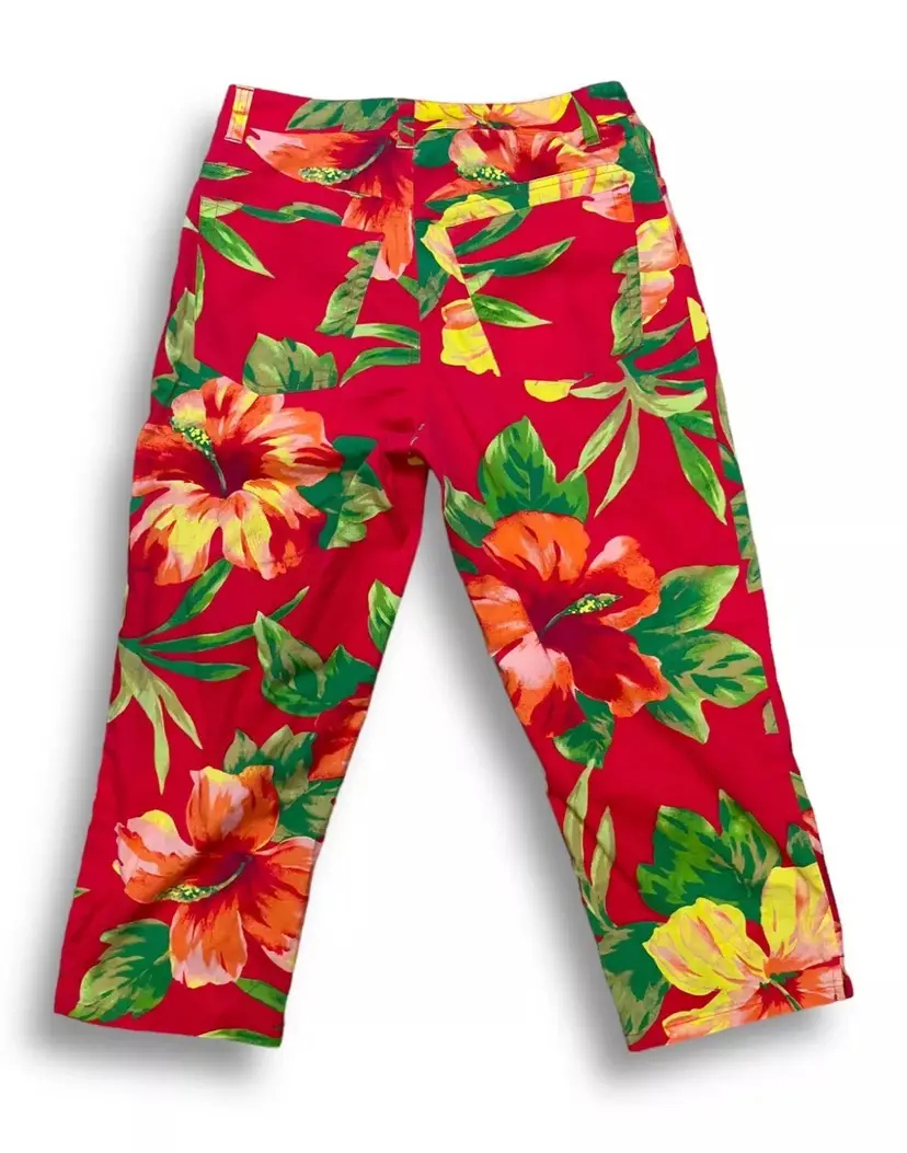 Vintage Ralph by Ralph Lauren Red Yellow Floral Hibiscus Cropped Capri Pants