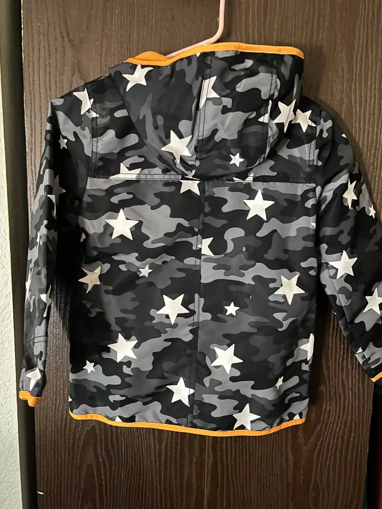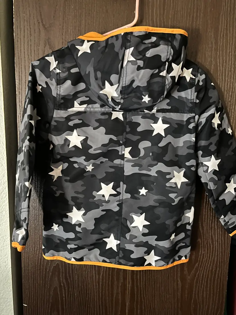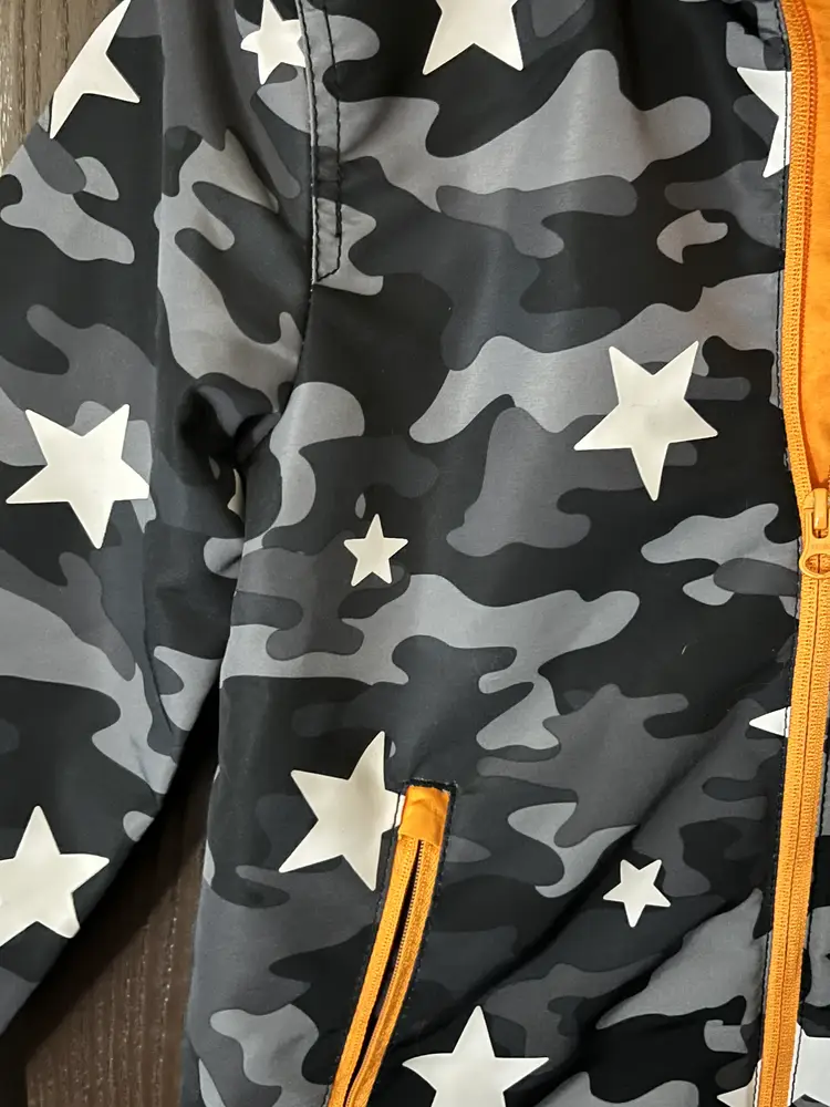 This WONDER NATION hooded jacket blends a bold camo and star print with a warm softshell interior that keeps kids cozy and stylish in cooler weather. Bright orange trim and zipper details pop against the gray tones for a fun standout look. Fabric feels great with no flaws seen ready for everyday wear.