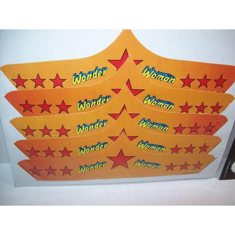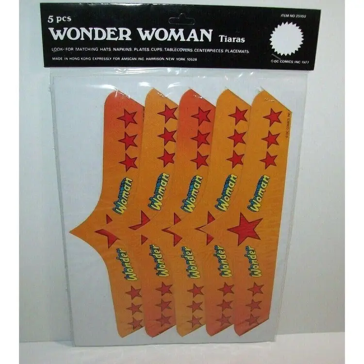 SHIPPING Buyer pays shipping and handling. Bundle and save. New old stock non circulated circa 1977 set of 5 cardboard Wonder Woman Tiaras with elastic straps. The package is marked "Wonder Woman Tiaras" Copyright "DC Comics Inc. 1977". Marked "AMSCAN Inc". These were sold back in the day as Halloween or costume party accessories. See photos.