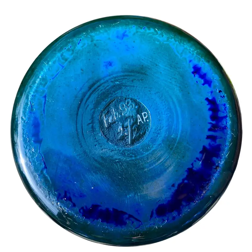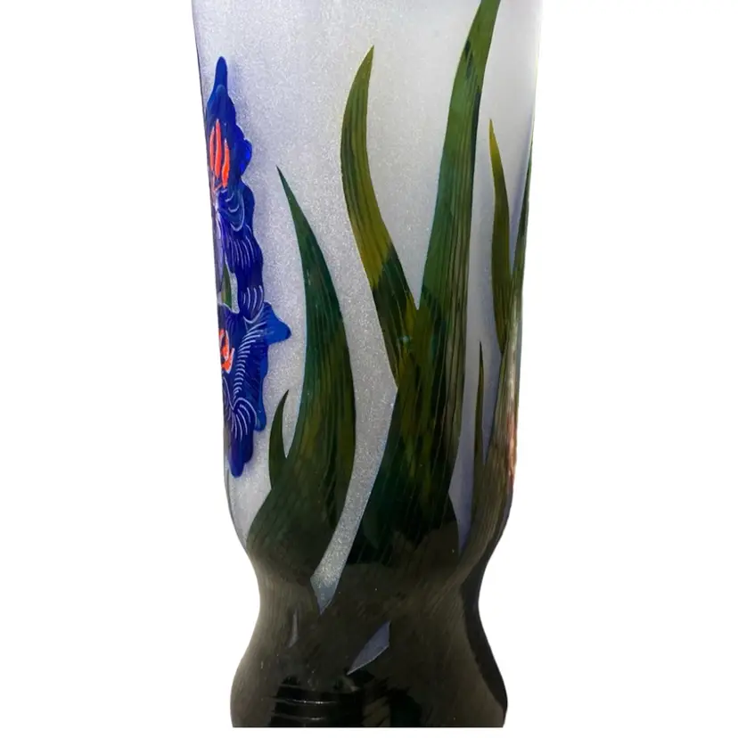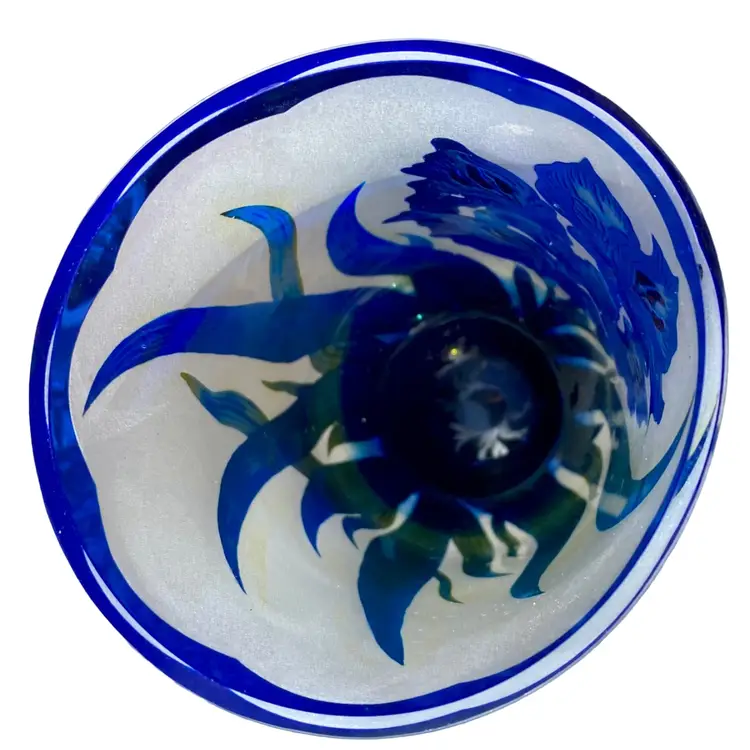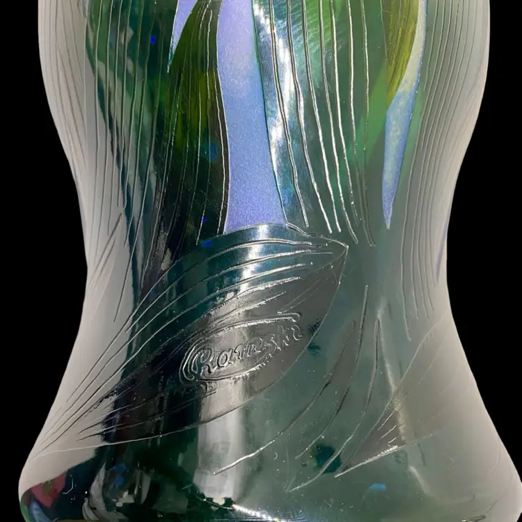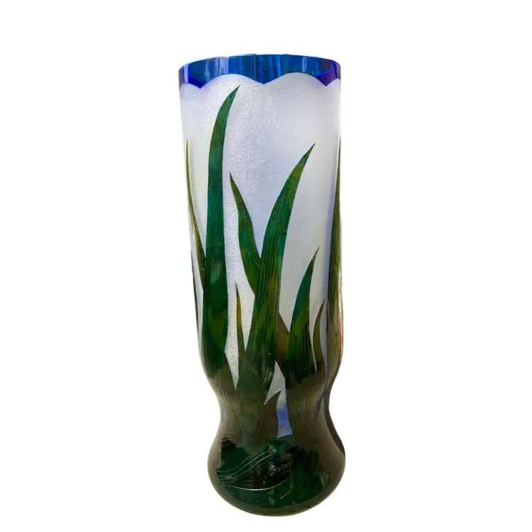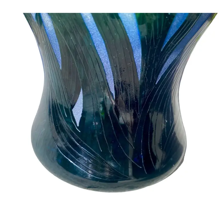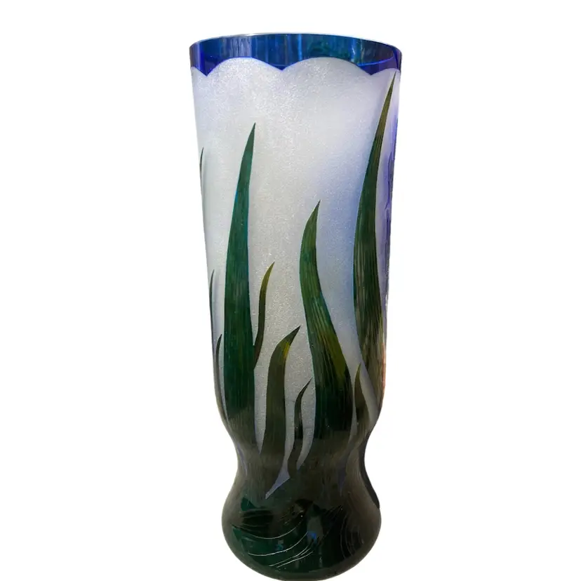This beautiful vase is 13.5” tall and 4.75” across the top. It was made by Ryzsak Ramski, a well known glass artist from Poland. It is signed, dated feb 93, numbered 2/2, and is an artist proof. The layered blue and greens are beautifully done and the red stamens are applied. Ramski's work is housed in permanent collections at the National Museum of Art in Warsaw and the Sobieski Museum in Vienna, Austria. It is in excellent condition with no cracks or chips. It is a stunning piece from the collection of a past president at both the Paperweight Collectors Assoc. and New England Paperweight Collectors Association.