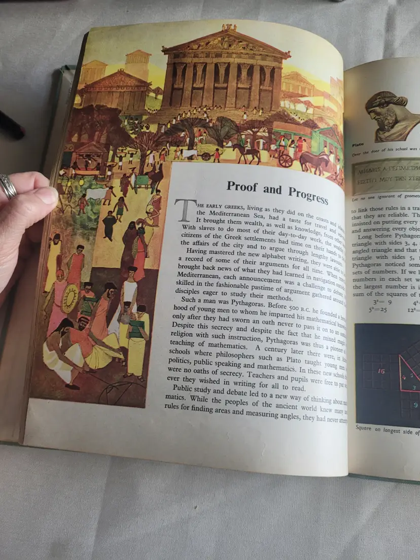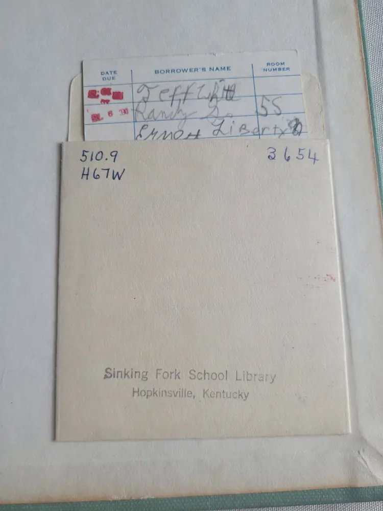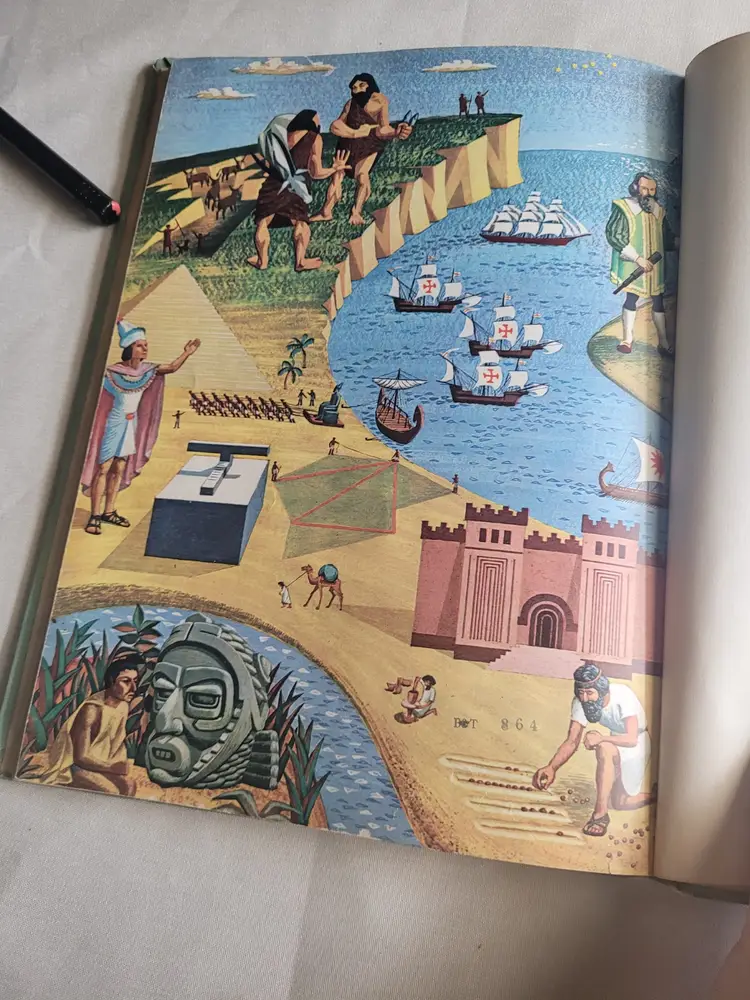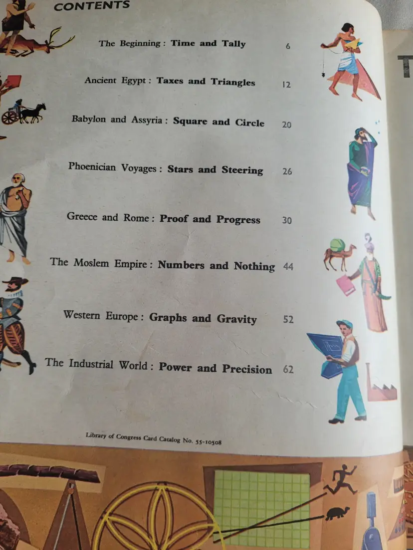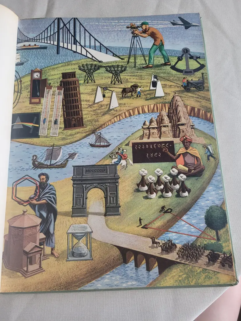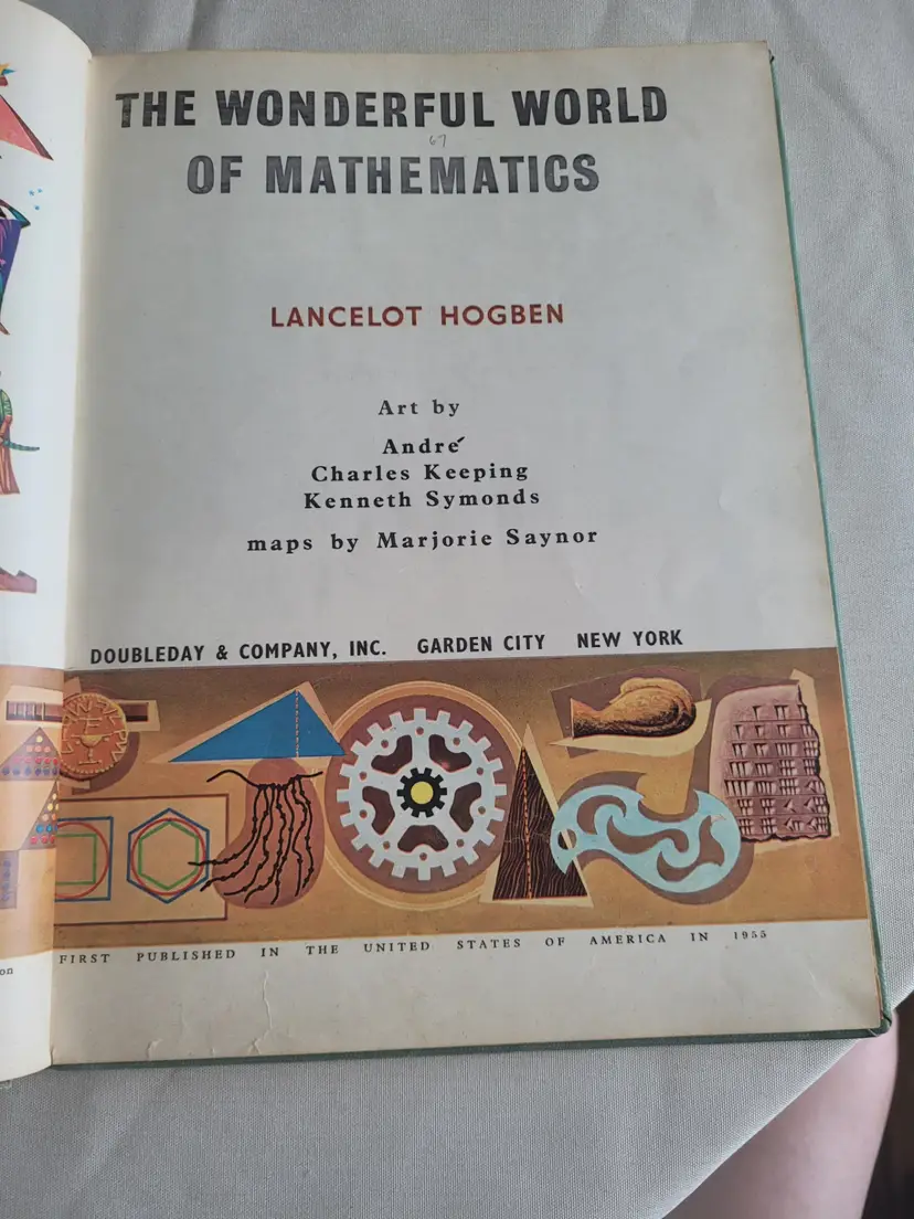 1955 Edition of the WONDERFUL WORLD OF MATHEMATICS, in Hardback Library edition with Library markings including DISCARD throughout. ALSo has the fun Check out slip with NAMES on the card included. This book is BEAUTIFULLY illustrated and does a very good job of describing various forms of math and their uses. Great for homeschoolers, or those who collect ART from the 1950s because this book if FULL of illustrations.