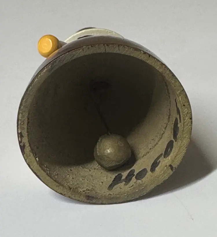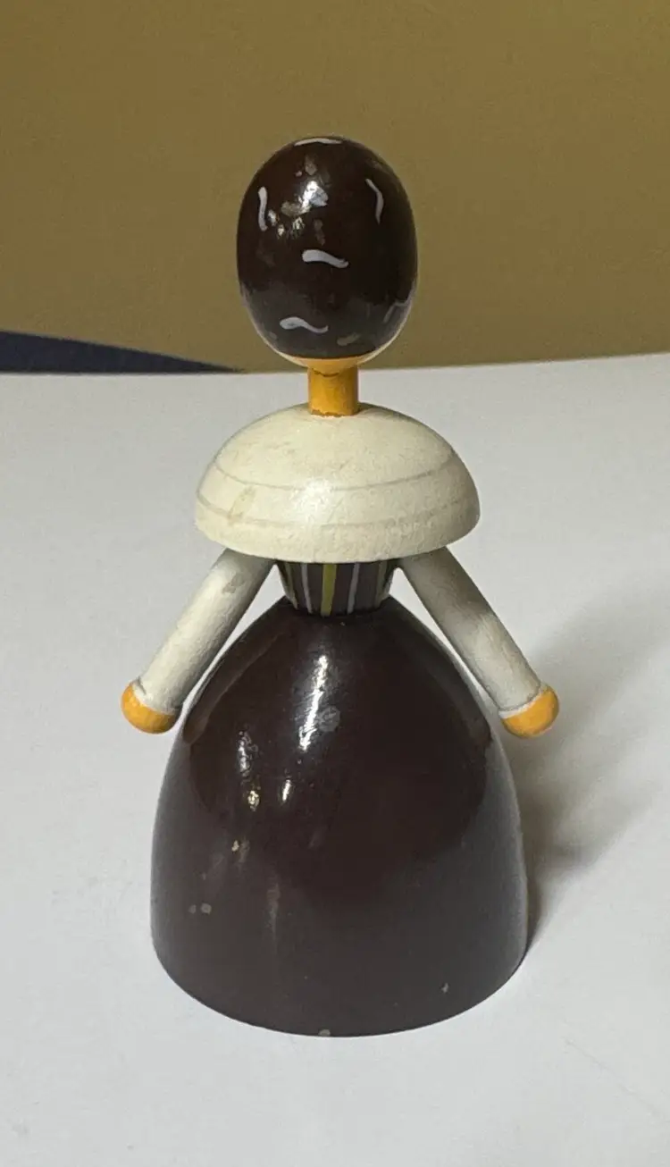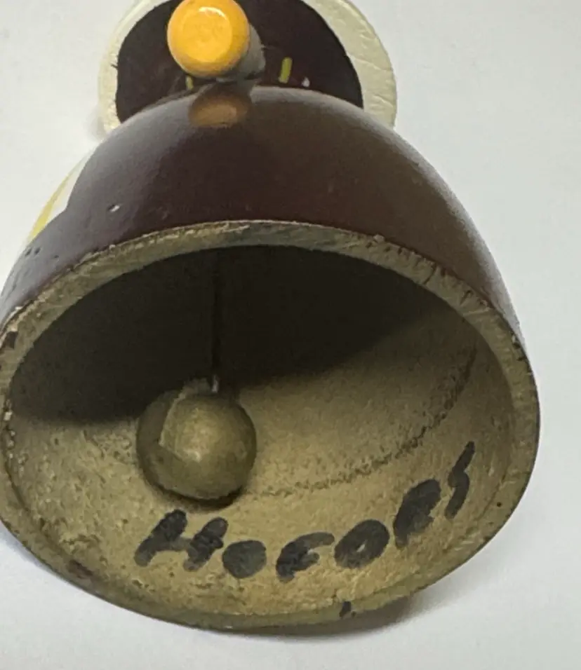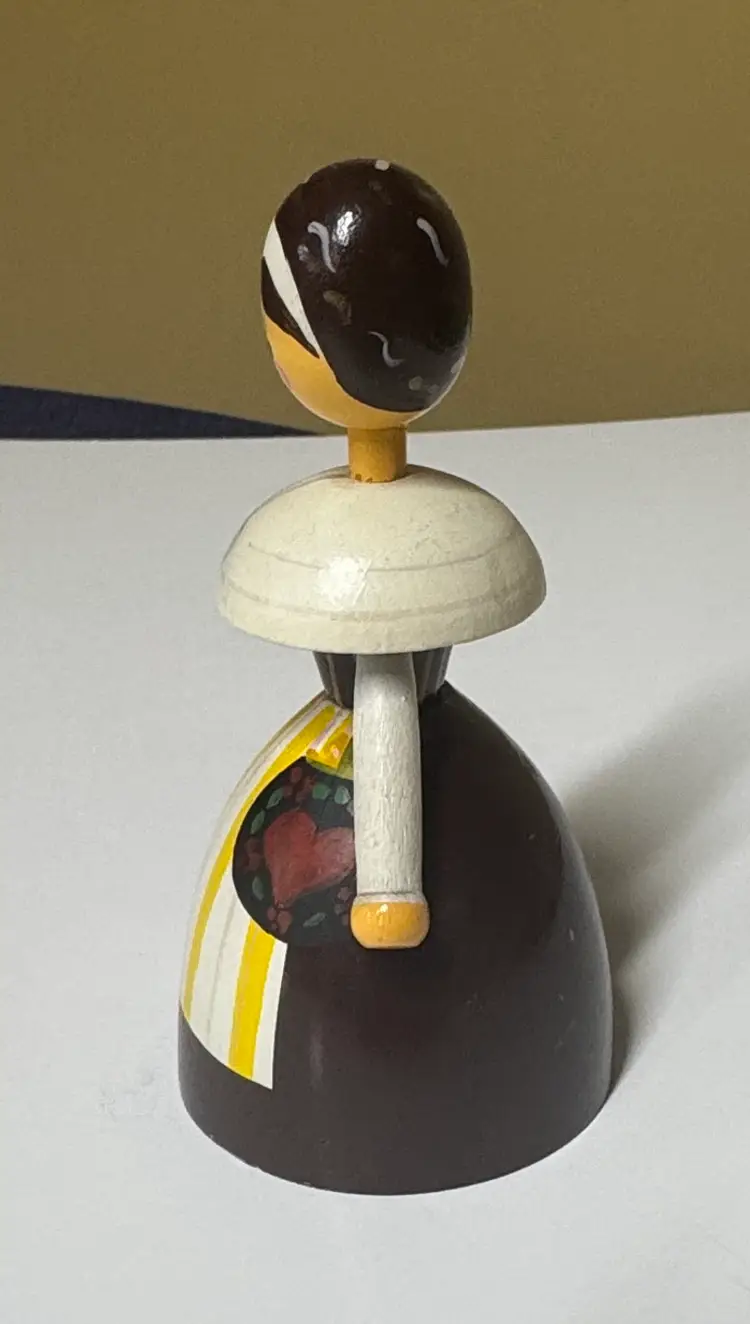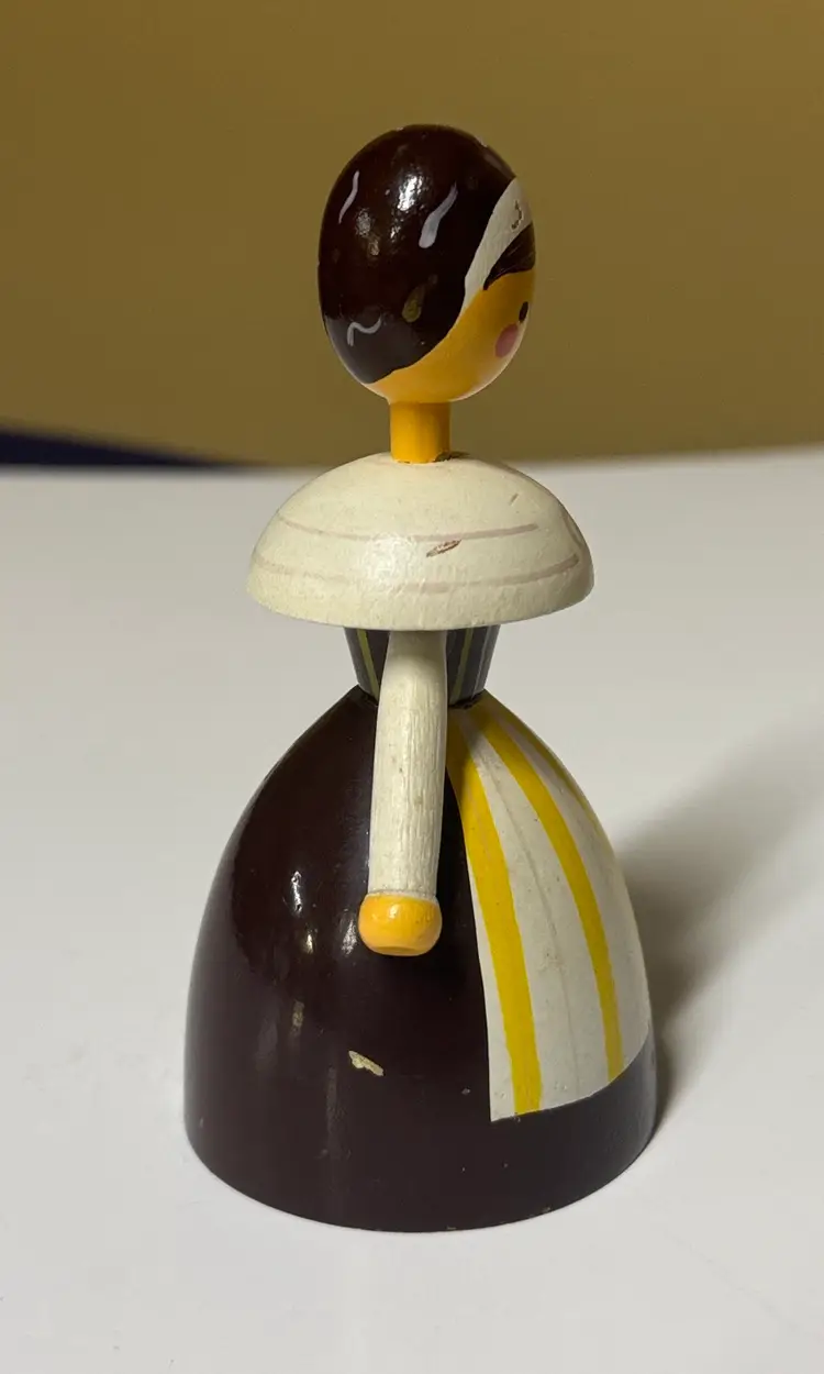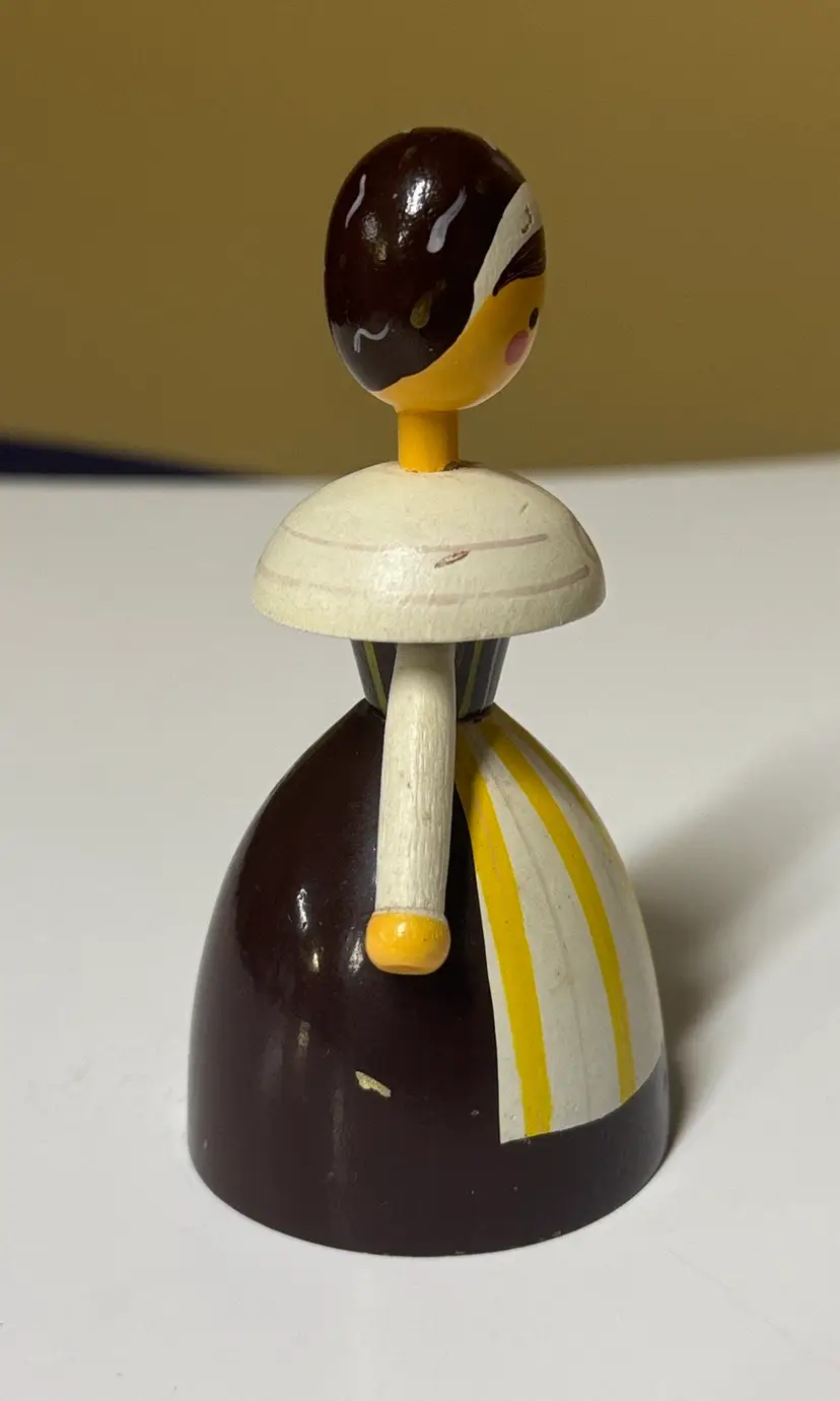 Wood & Brass Bell Woman Swedish Hand-painted Folk Art 4.25" tall signed Hofors. Charming wooden doll with a striped dress. Features yellow and white colors with brown accents. The head, bodice, and arms are made of wood, while the skirt forms the brass bell. Excellent condition (13721128251)