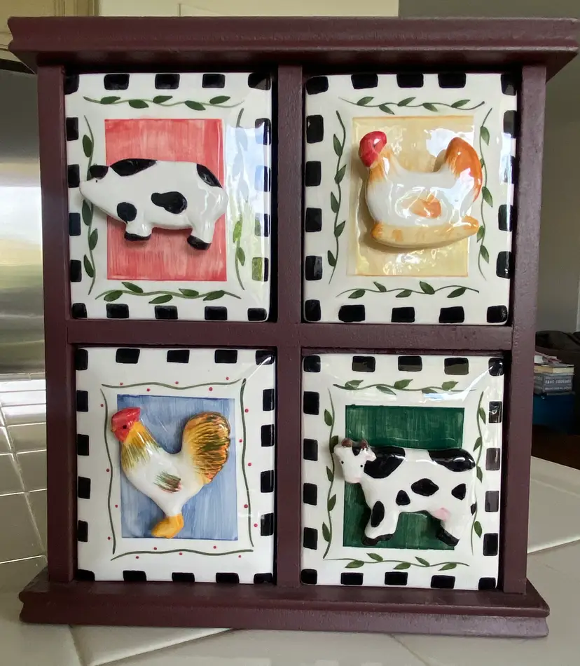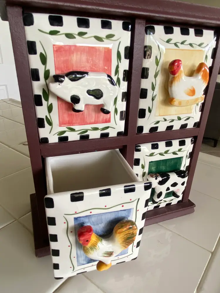 Enhance your kitchen's functionality and charm with the Wood & Ceramic 4 Drawer Kitchen Organizer Chest. This unique piece features a delightful farm motif with chicken, rooster, pig, and cow designs, adding a touch of countryside flair to your decor. Crafted from high-quality wood and ceramic, the organizer is not only durable but also brings a splash of color to your countertop with its vibrant multicolored palette. Ideal for keeping your spices and small kitchen essentials neatly arranged, this organizer chest measures 9.25 inches in height, 7.5 inches in length, and 4.25 inches in width, making it a perfect fit for any kitchen space. With four spacious compartments, it offers ample room to store your favorite ingredients and accessories, all while keeping them within easy reach.