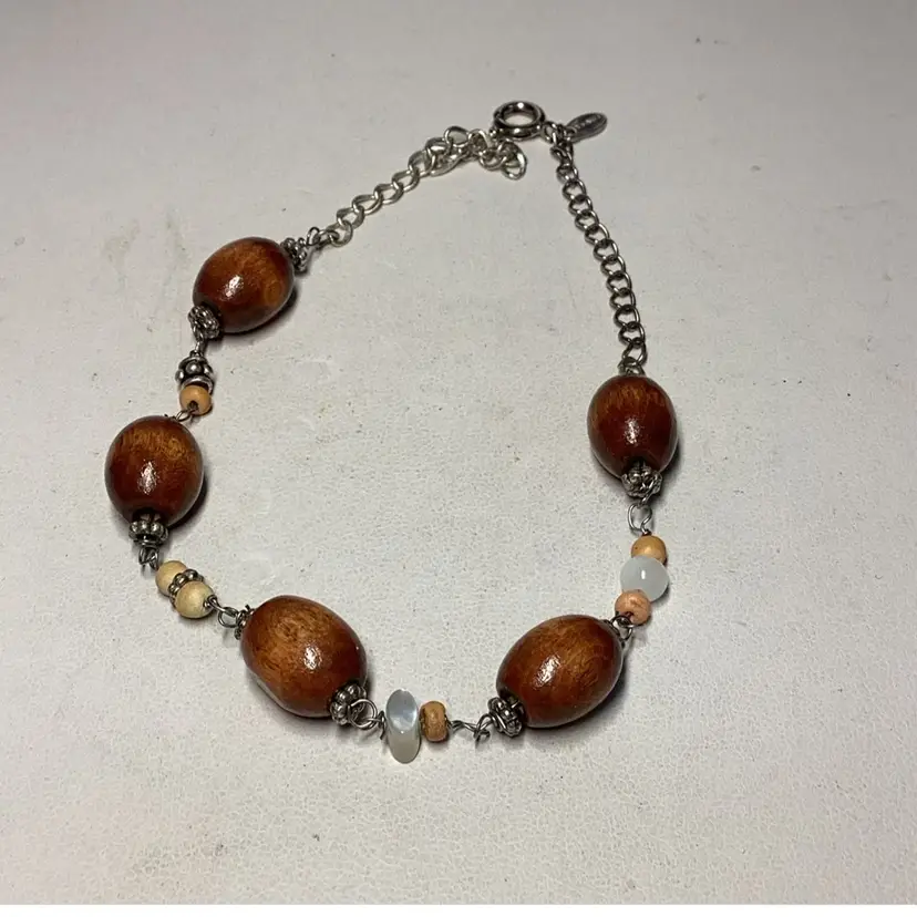 Wood Beads Silvertone Chain Anklet Bracelet 10” - Signed Monet