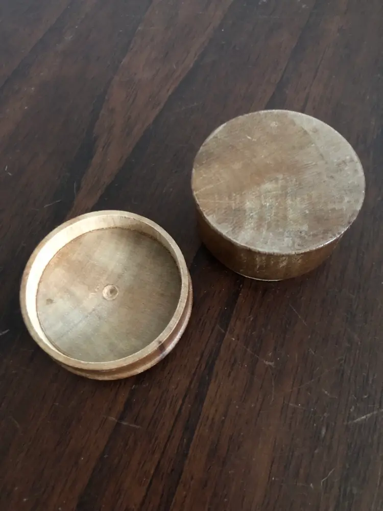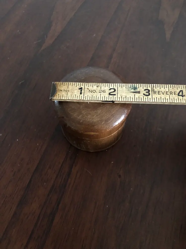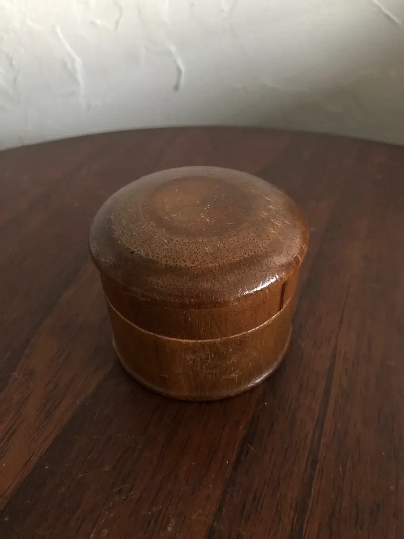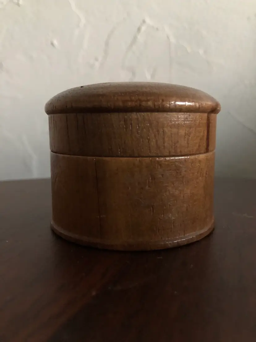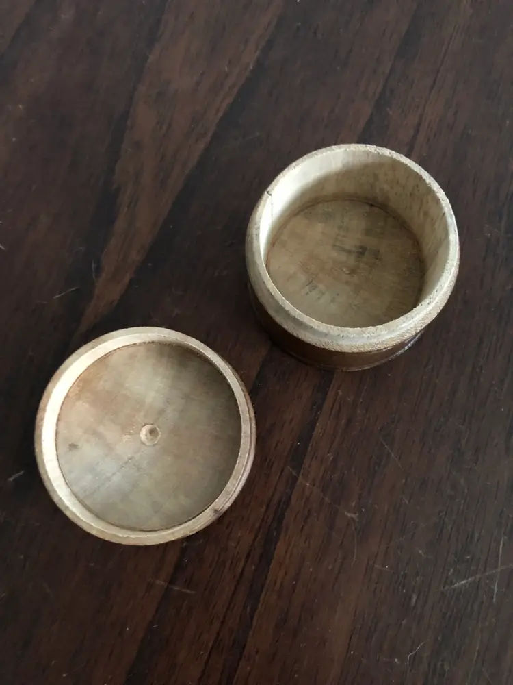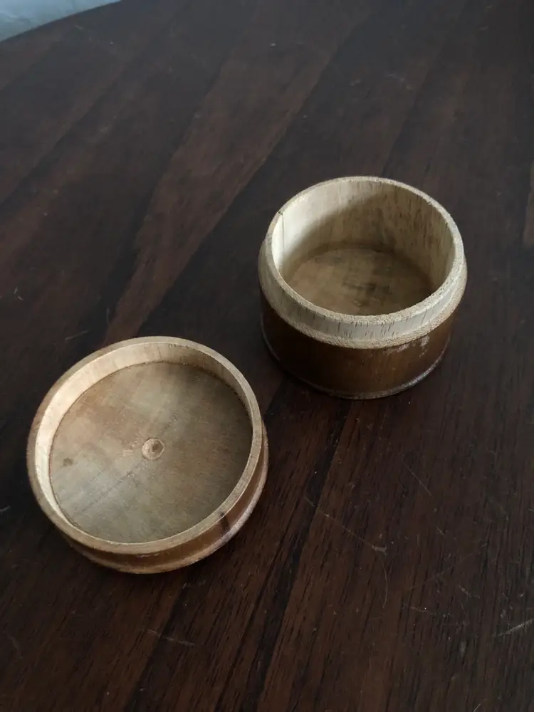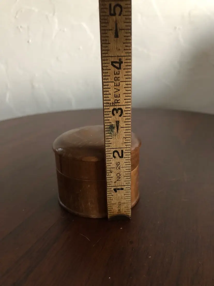 This small box is hand turned wood. It is about 2.25” tall and 2.5 wide.