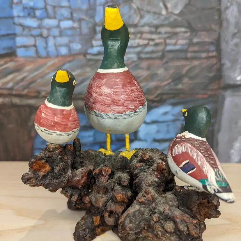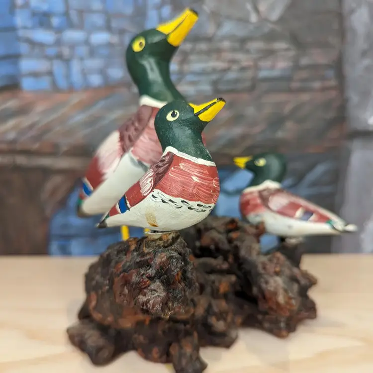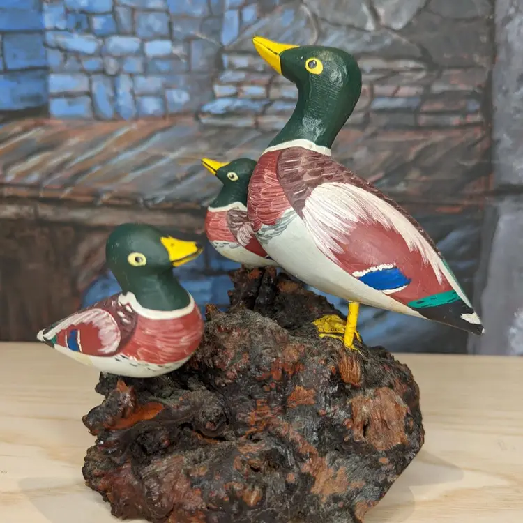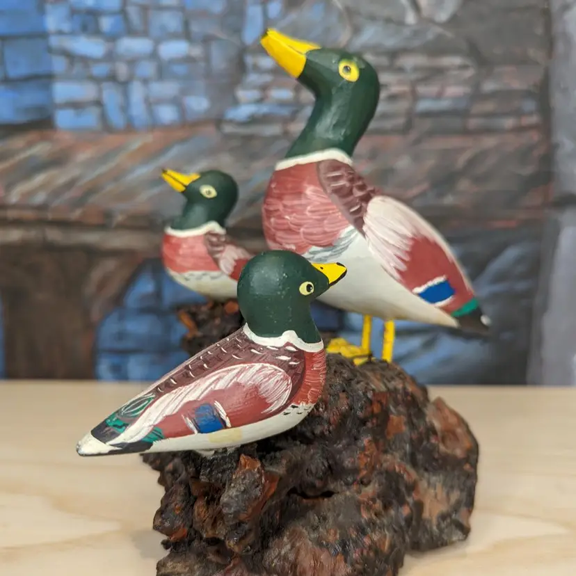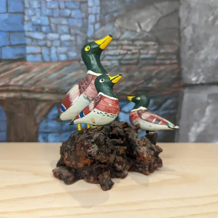Wood Carved Mallard Duck Hand Painted Made in Spain Mom Ducklings wood stand over all measurements are approximately 6" tall, the length is 5" long and 4" deep.Irregular in shape, this duck sits on a wooden base marked with Made in Spain. Very good condition one of the small ducks is loose and spins around but is securely on the wood. Please check our photos for details.