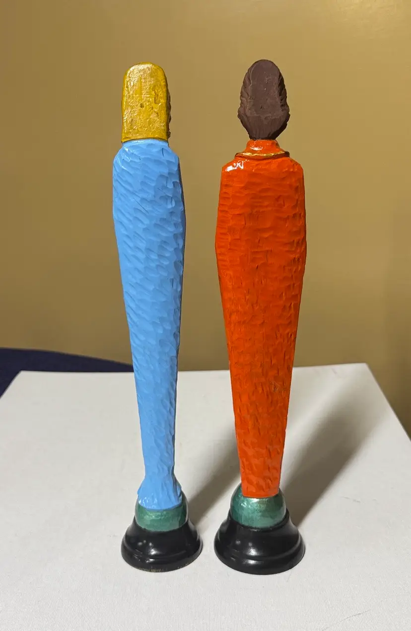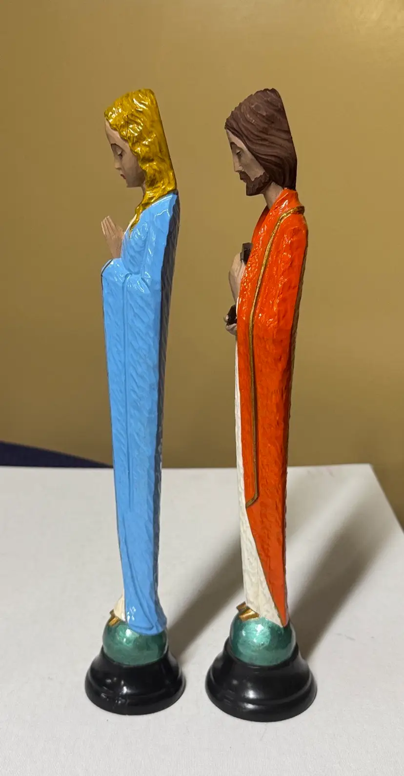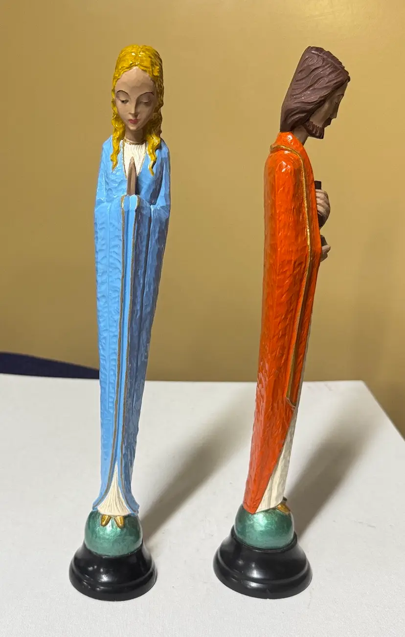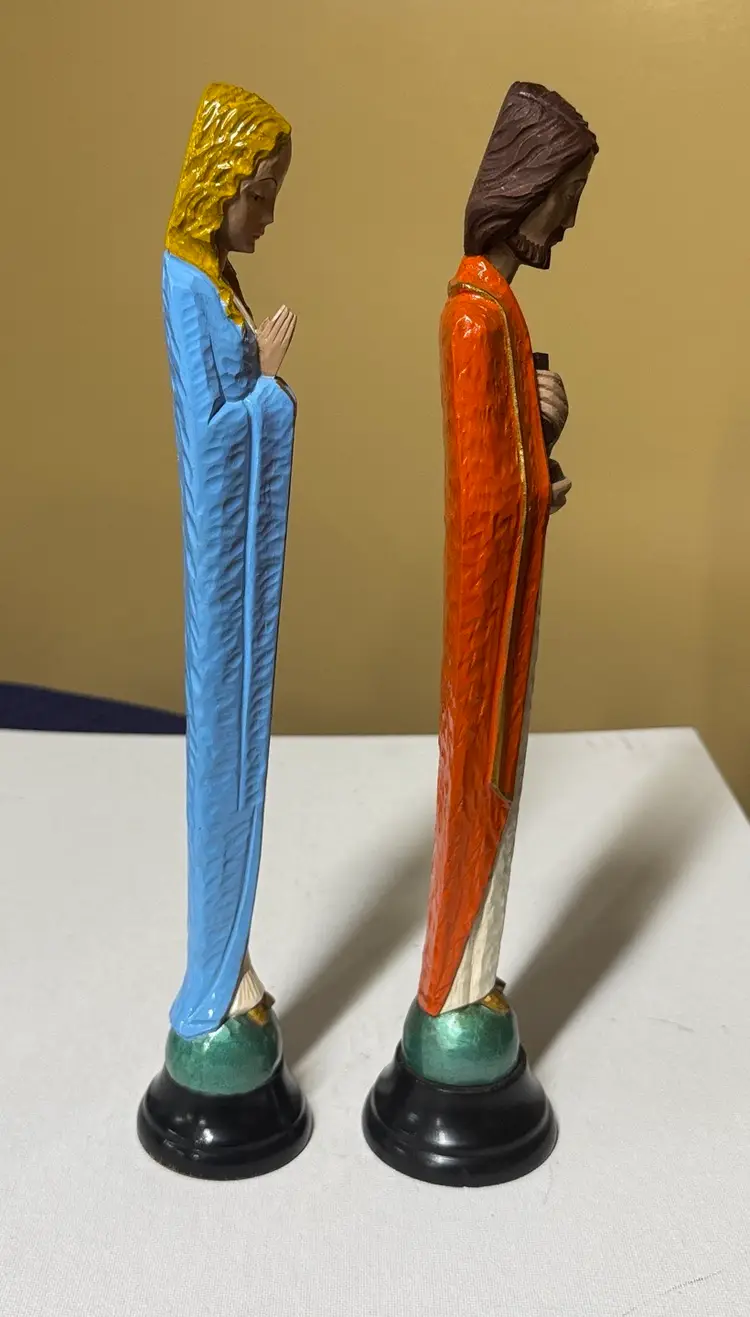 Set of two religious figurines. Features vibrant blue and orange robes. Wood hand carved in Italy praying man and woman Goldscheider hand painted 13” tall Excellent like new condition (11411021254)