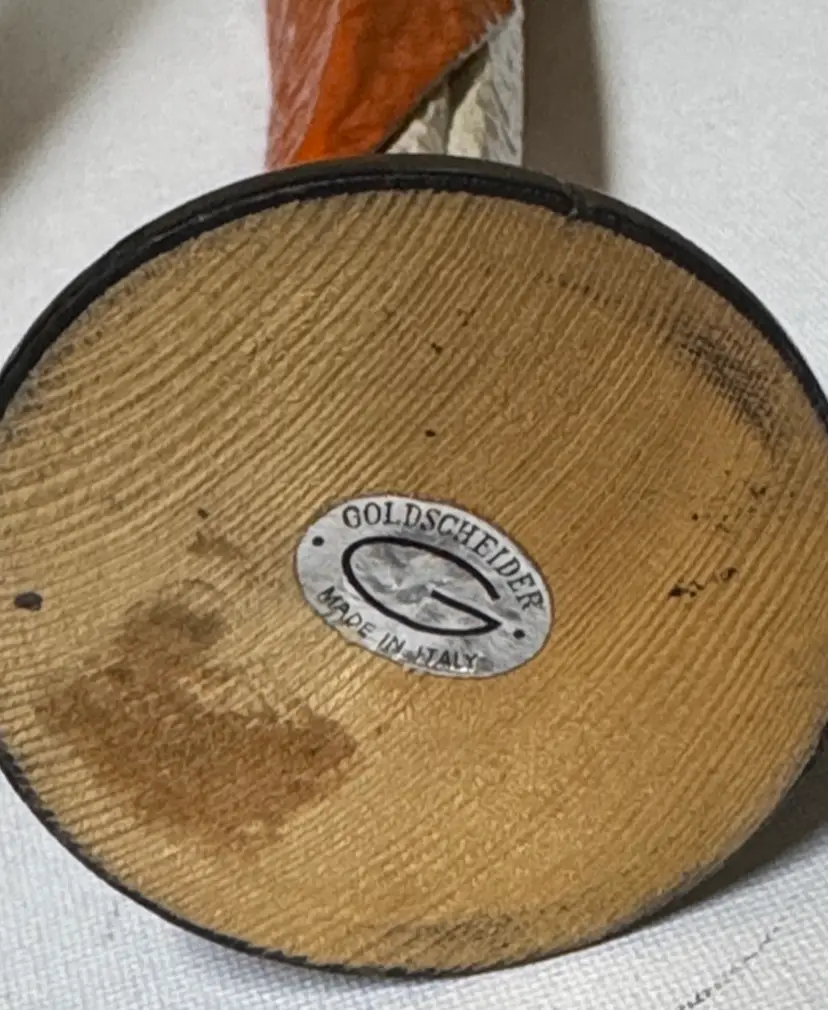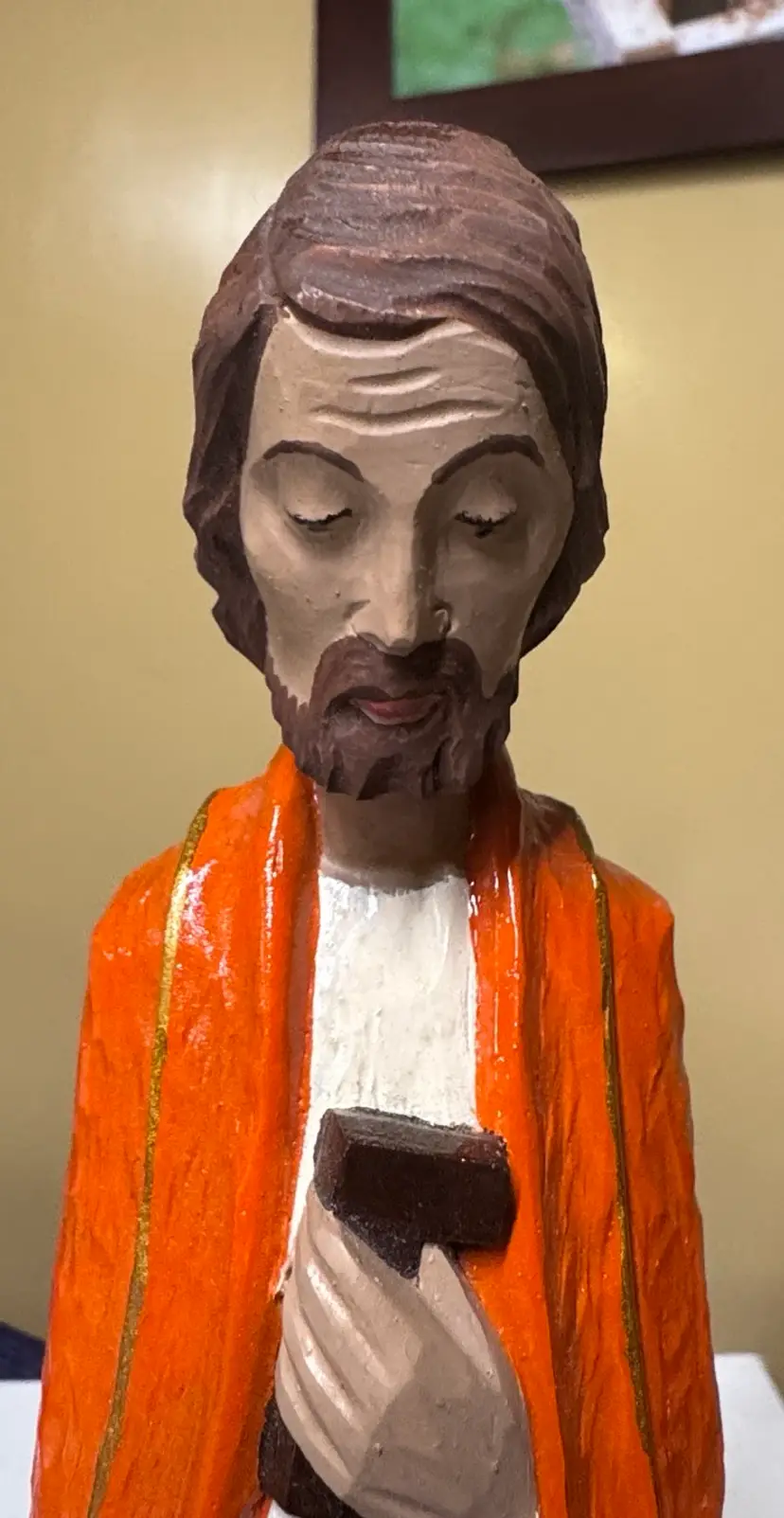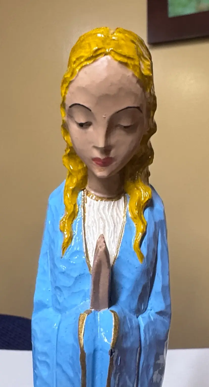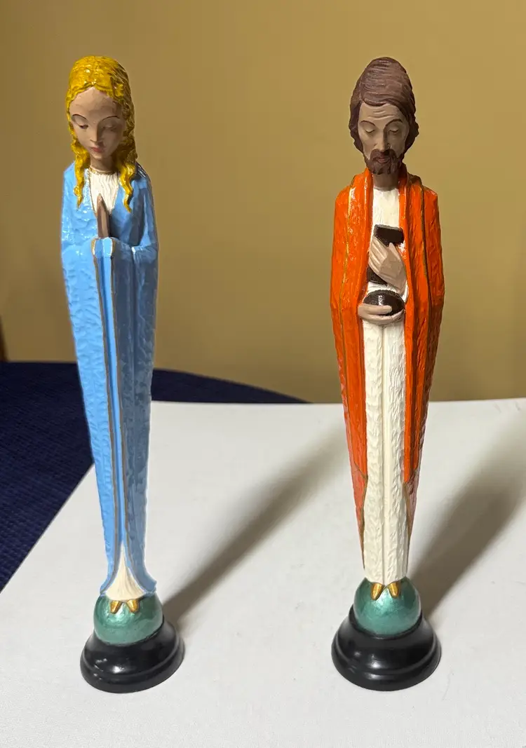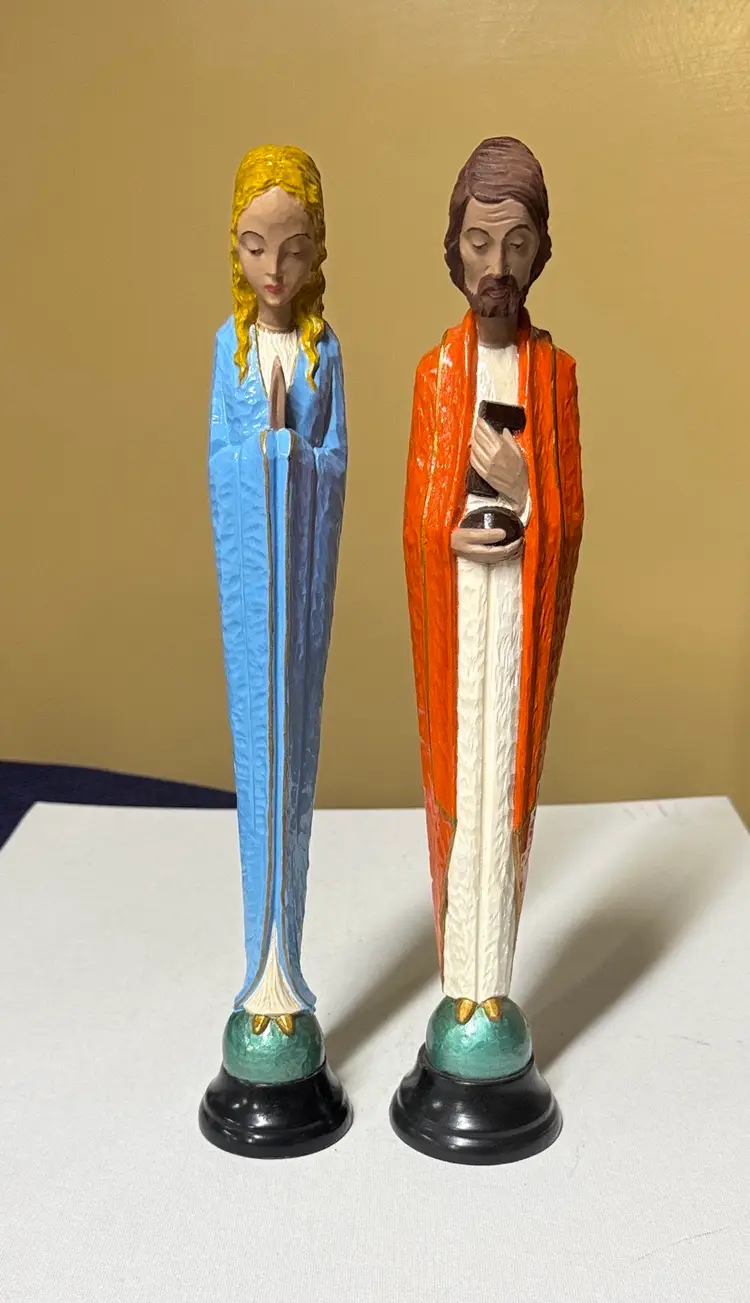 Set of two religious figurines. Features vibrant blue and orange robes. Wood hand carved in Italy praying man and woman Goldscheider hand painted 13” tall Excellent like new condition (11411021254)