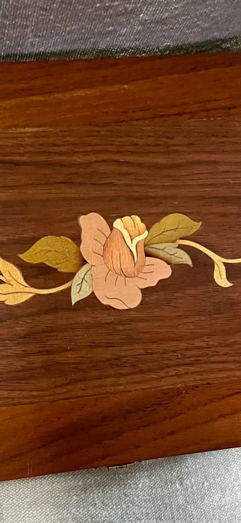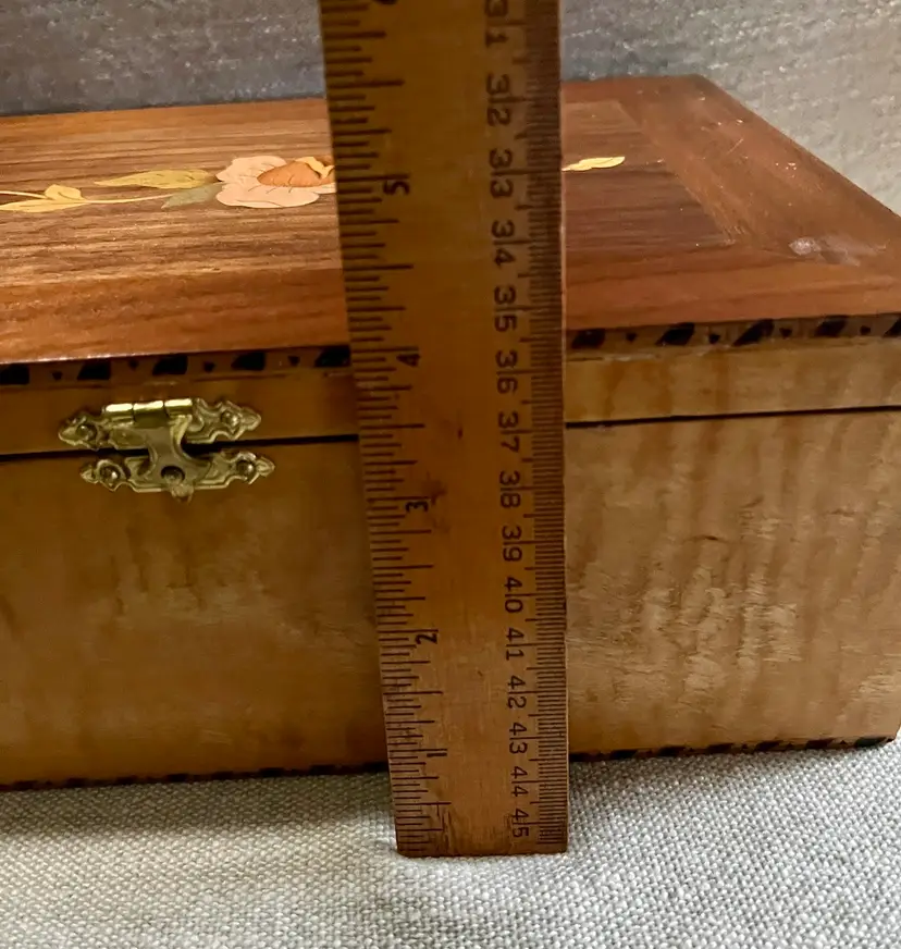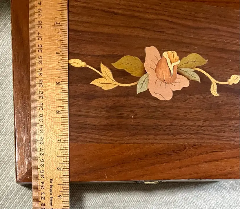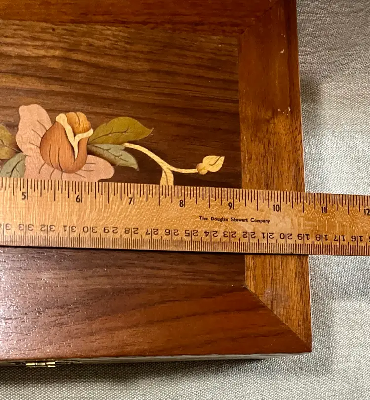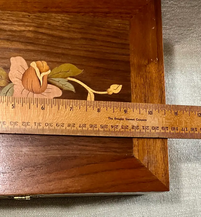 This handcrafted inlay lacquer jewelry trinket box is a beautiful and unique piece crafted in Michigan, USA. The box features a traditional rectangular shape with a medium size, making it suitable for storing jewelry or small items. The interior includes a sliding upper shelf for organization, and the exterior showcases intricate floral and two-tone checkered edging artisanal designs. Made of wood with a lacquered finish, this one-of-a-kind piece is a perfect addition to any room and is easy to care for. The box is adorned with a latch closure and the artist's information on the underside in pencil.