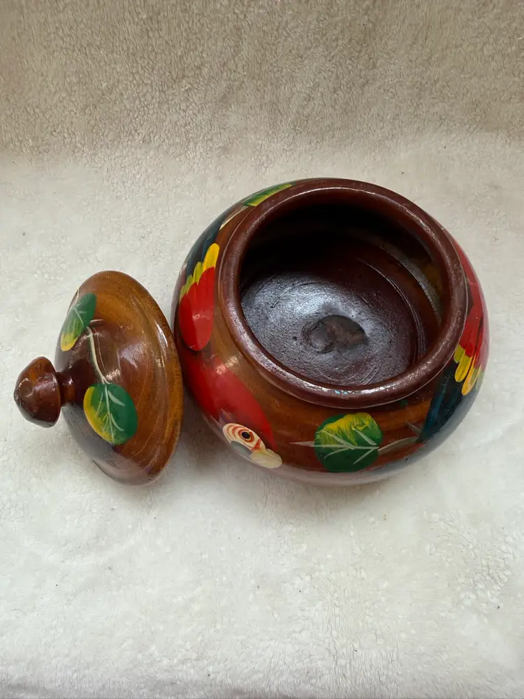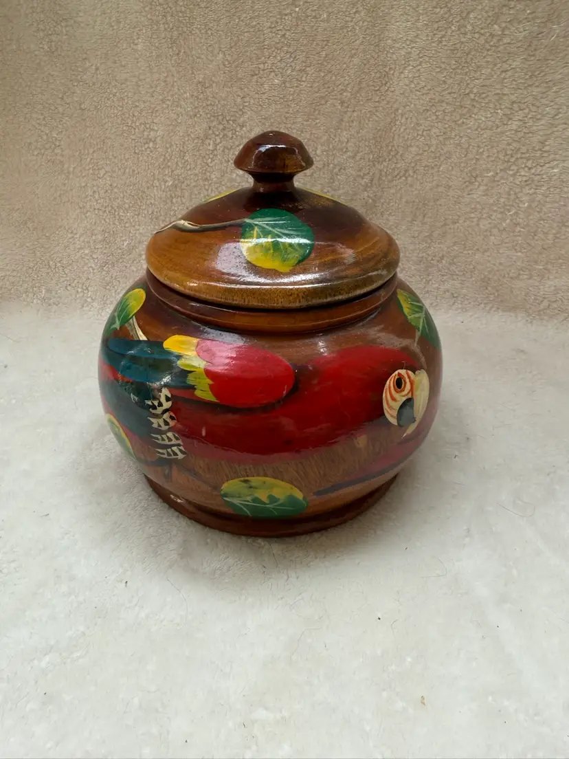 Beautiful handmade wood jar with lid, hand painted with parrots. 5.5” H x 6” W. No chips or cracks offers welcome