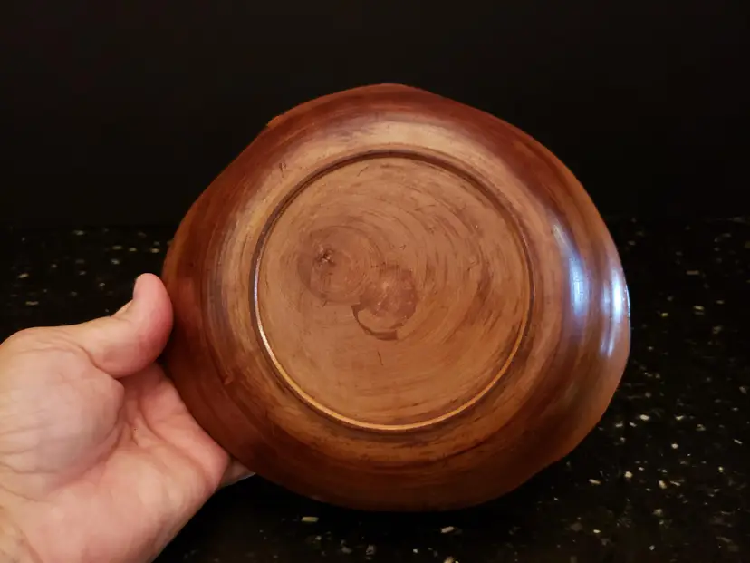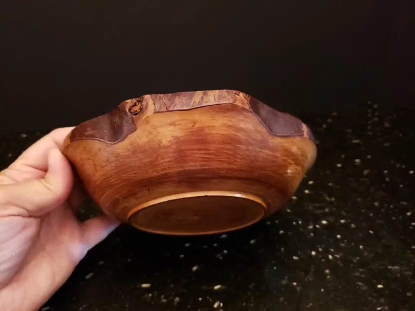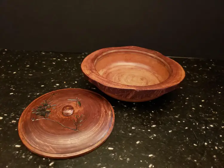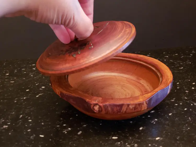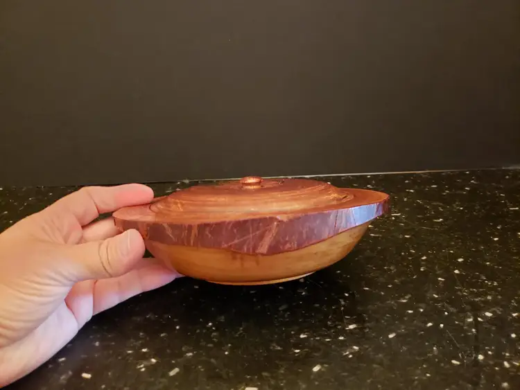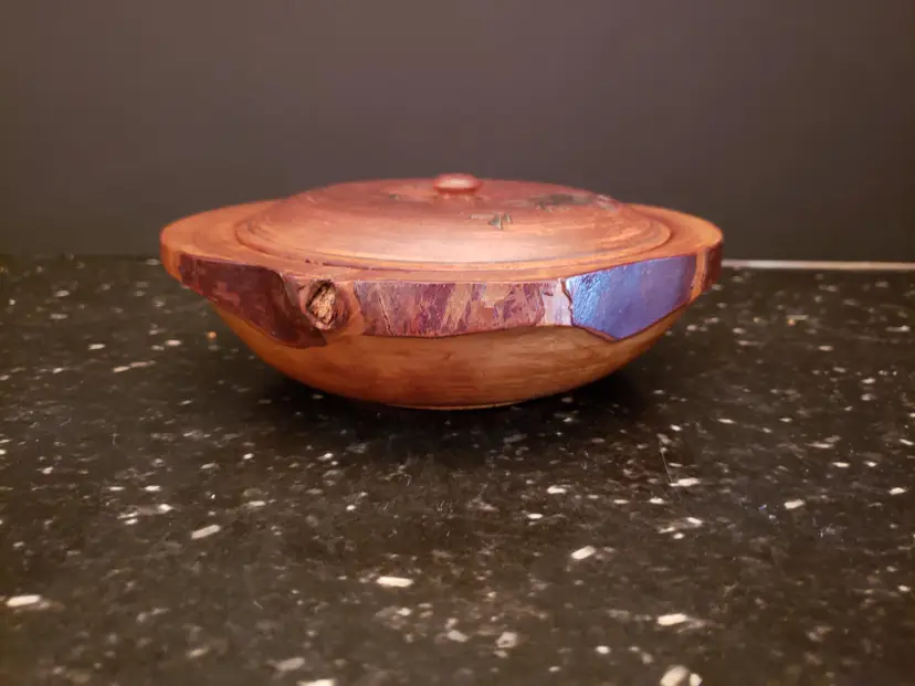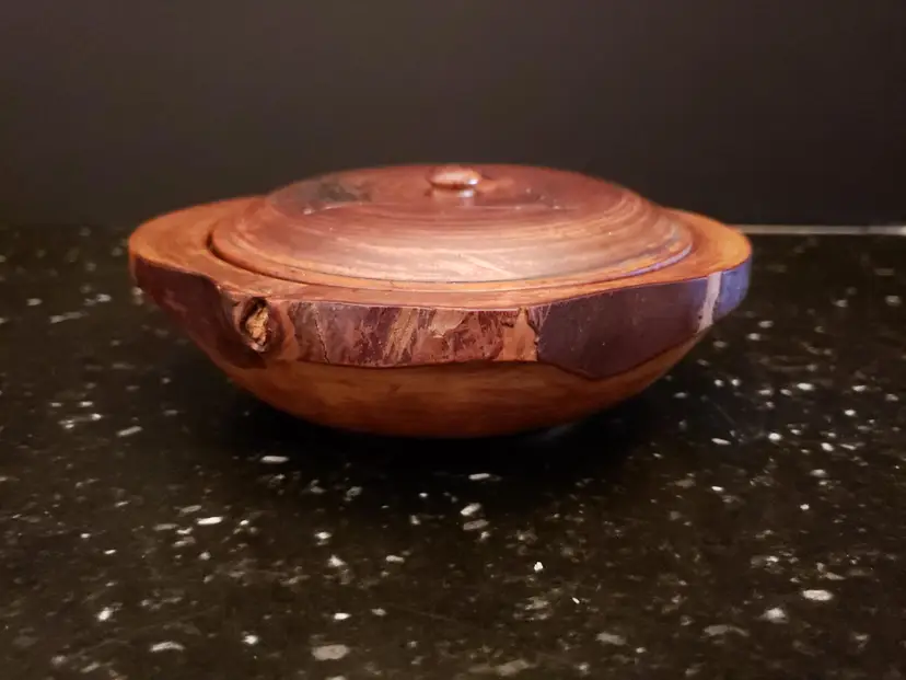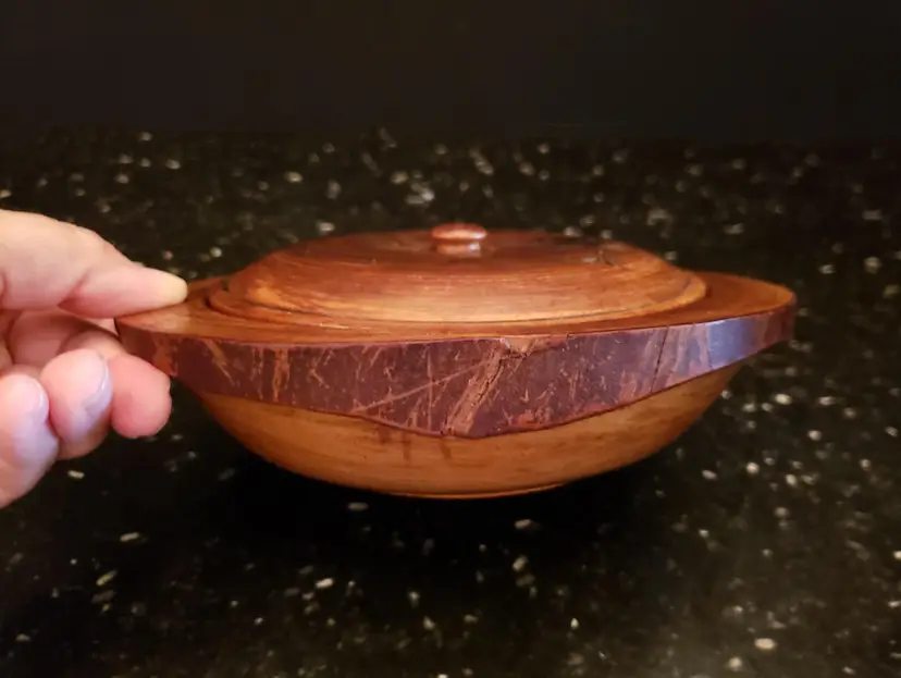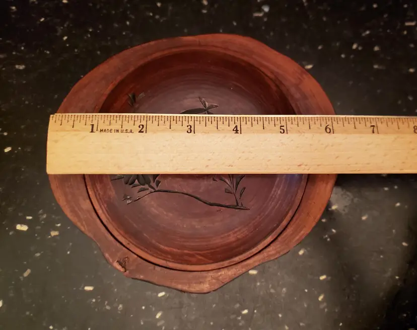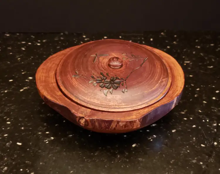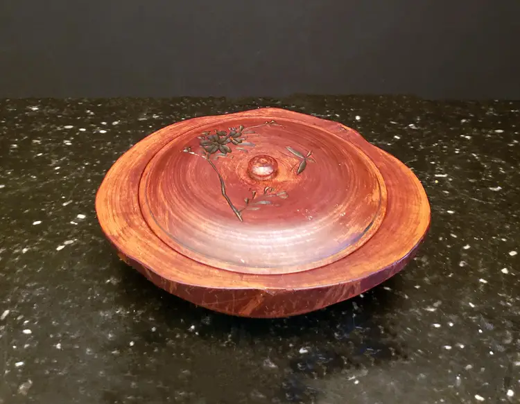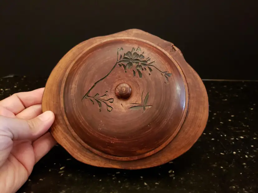 This is a unique wooden round box with lid. The lid has a wood burning design of a flower and butterfly. There is no makers mark on the bottom. Rustic and natural style.