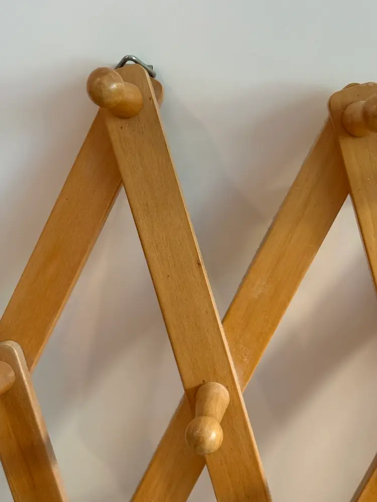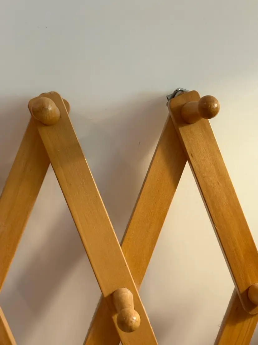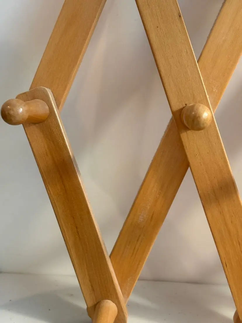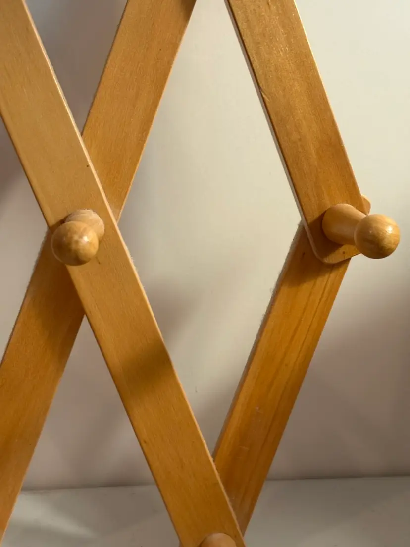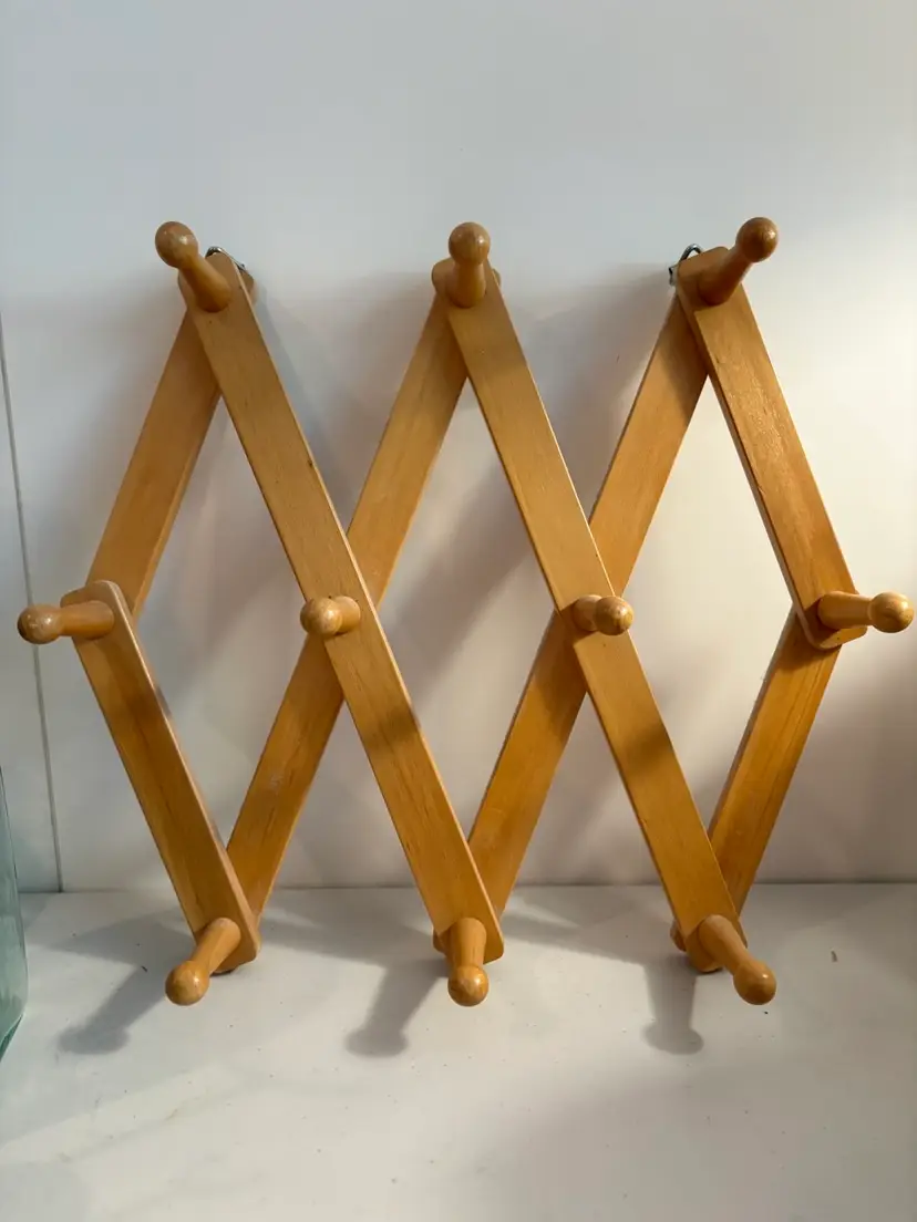 The Wooden 10 Peg Accordion Expandable Cup Mug Coat Rack is a stylish and functional wall-mounted accessory for organizing coats, hats, and other items in your home. Made of wood, this coat and hat rack features an expandable design that allows you to easily hold and display up to 10 items. The accordion-style rack provides a convenient way to keep your outerwear and accessories neat and easily accessible. Perfect for adding a touch of organization and decor to your living space.