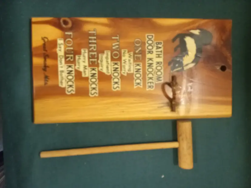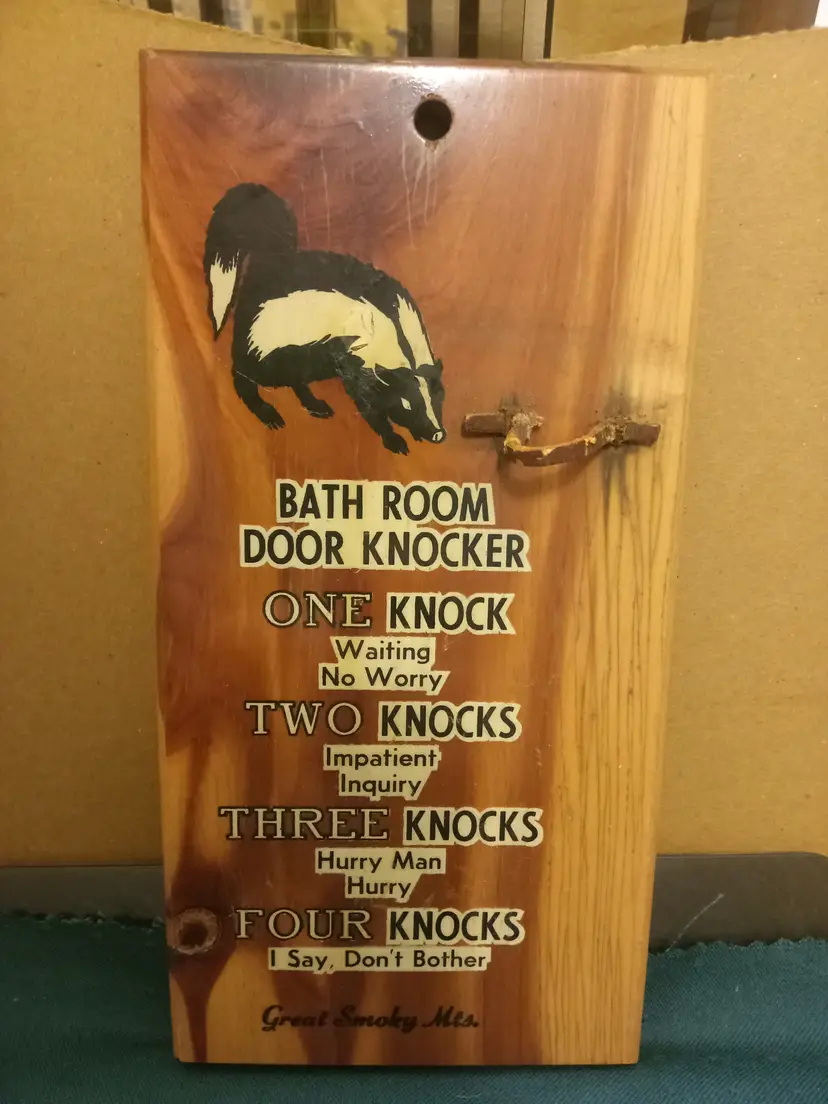 wooden bathroom door knocker featuring a skunk graphic and a humorous guide to knocking etiquette.