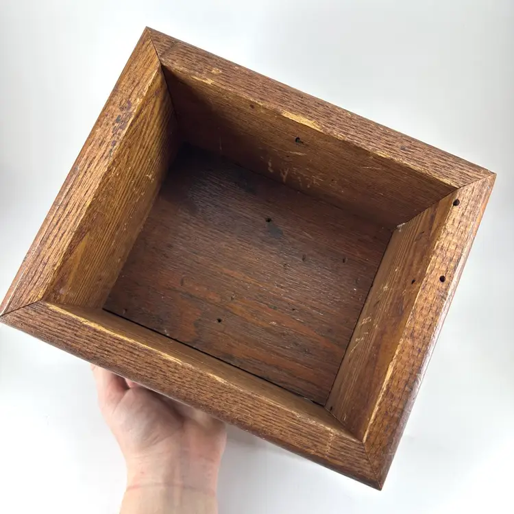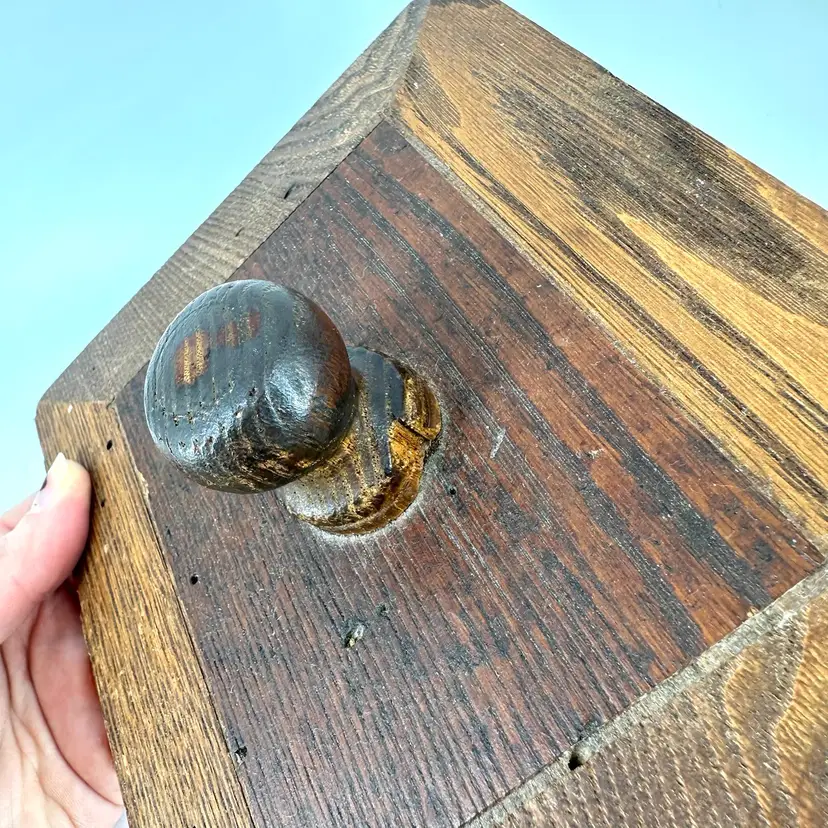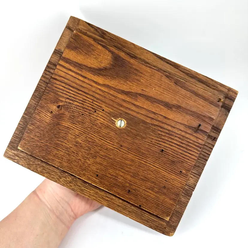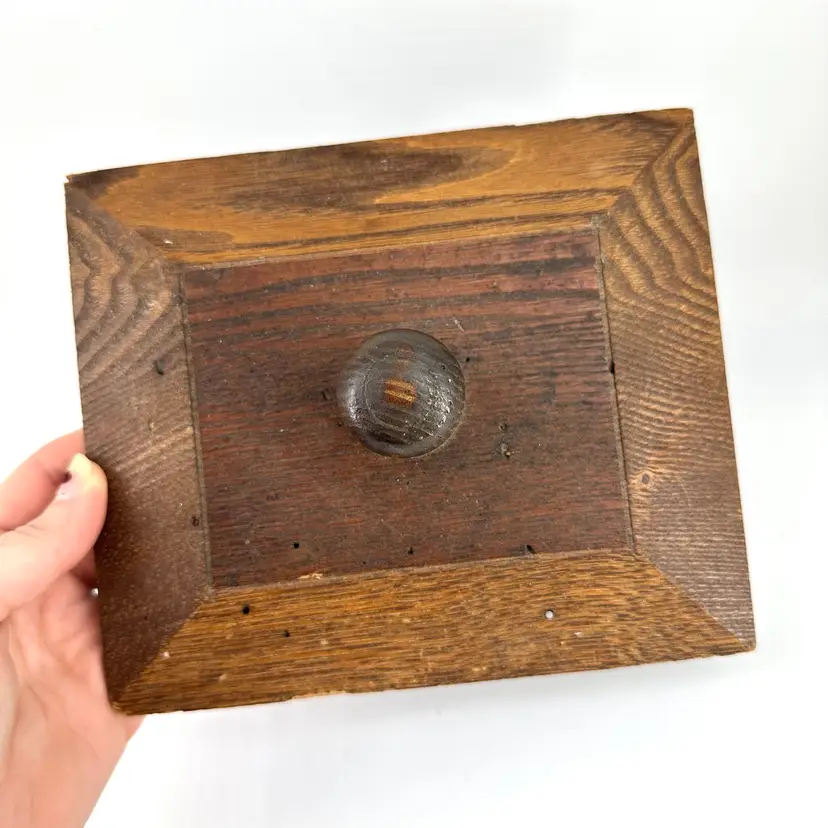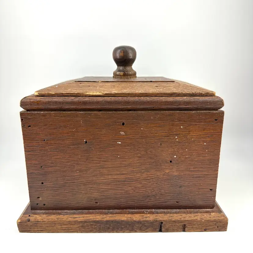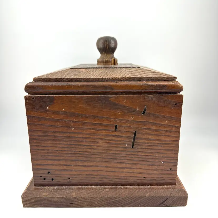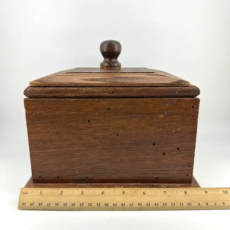 Hand crafted made box with detachable lid made of wood. Box has a few hole marks, as shown in pictures, as well as some scratching on the inside. The handle on the lid has a small chip mark as well as some wear to the corners of the lid, see photos. Box measures approximately 9” long and 4” deep. No signatures.