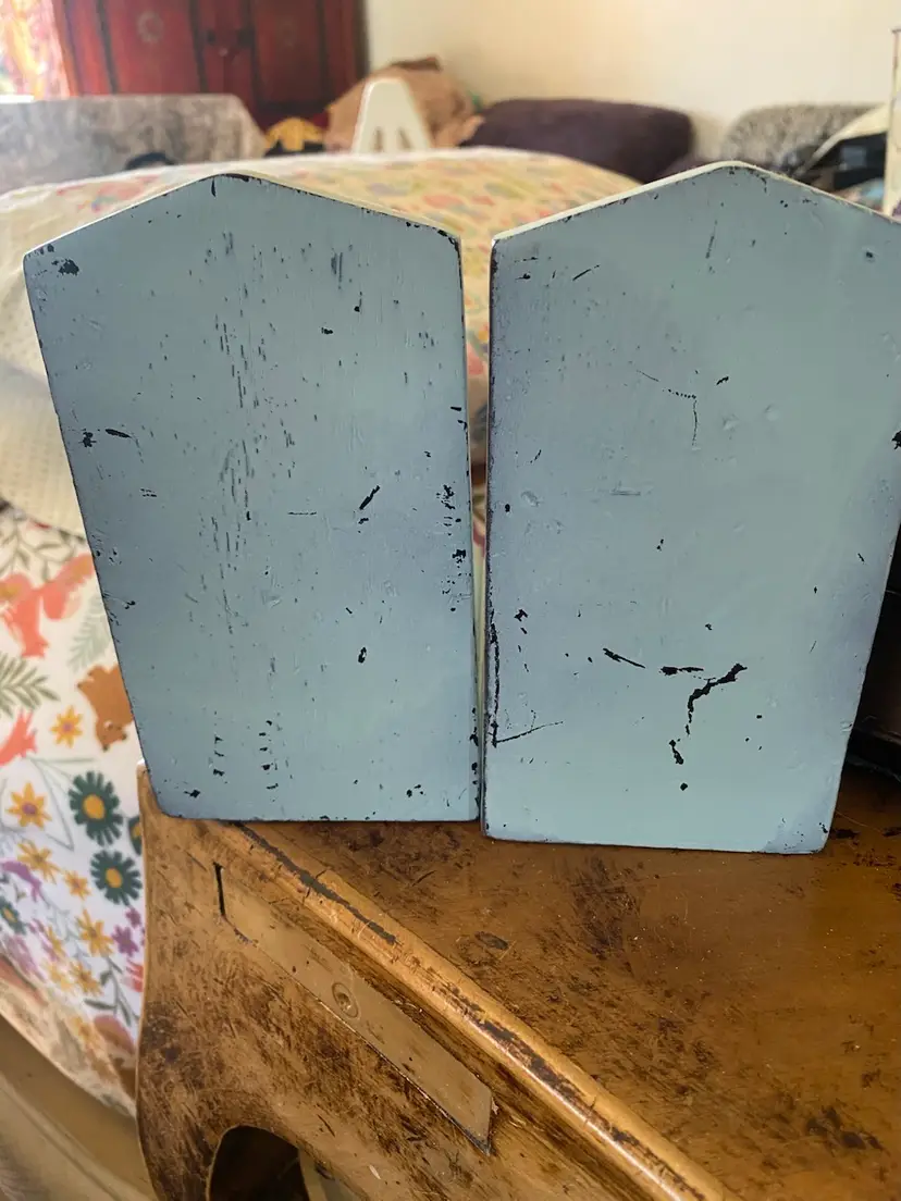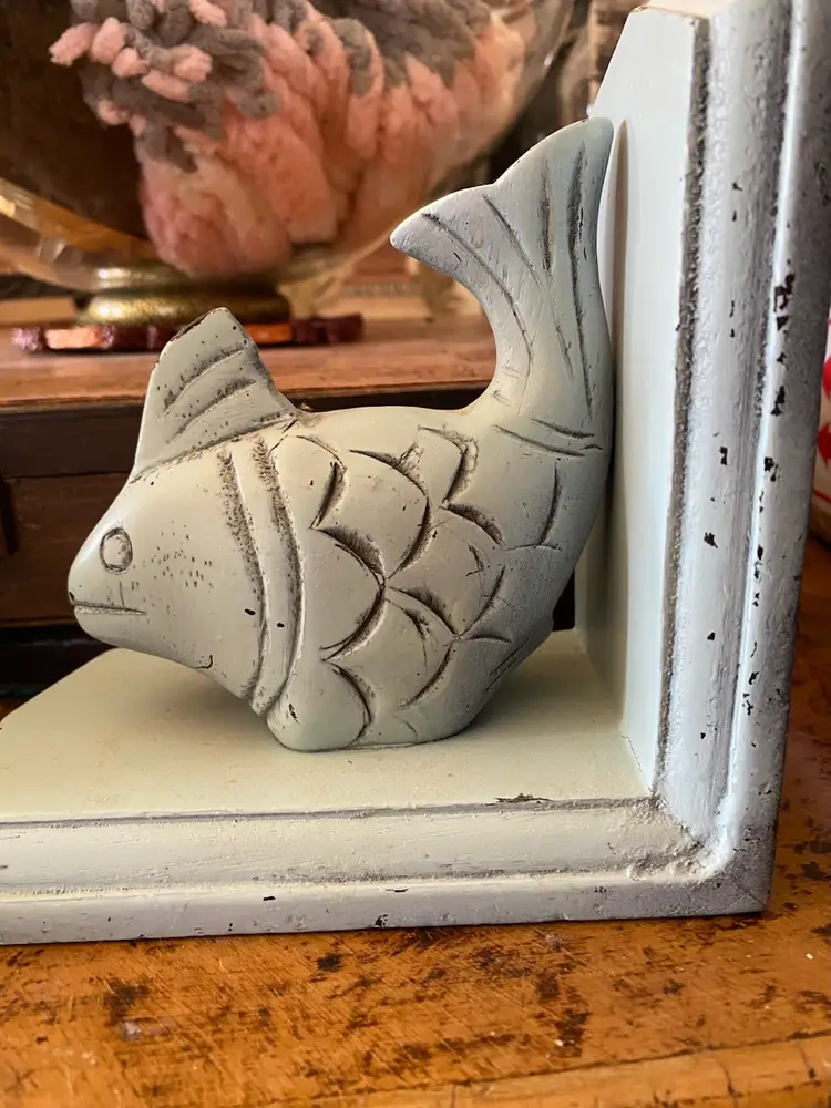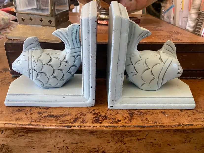 These are a distressed (both intentionally and with normal wear), fairly lightweight carved bookends. About a pound each. Measurements are 5.75”wide and 5.5” tall(each). These are so adorable for aquatic themed space.