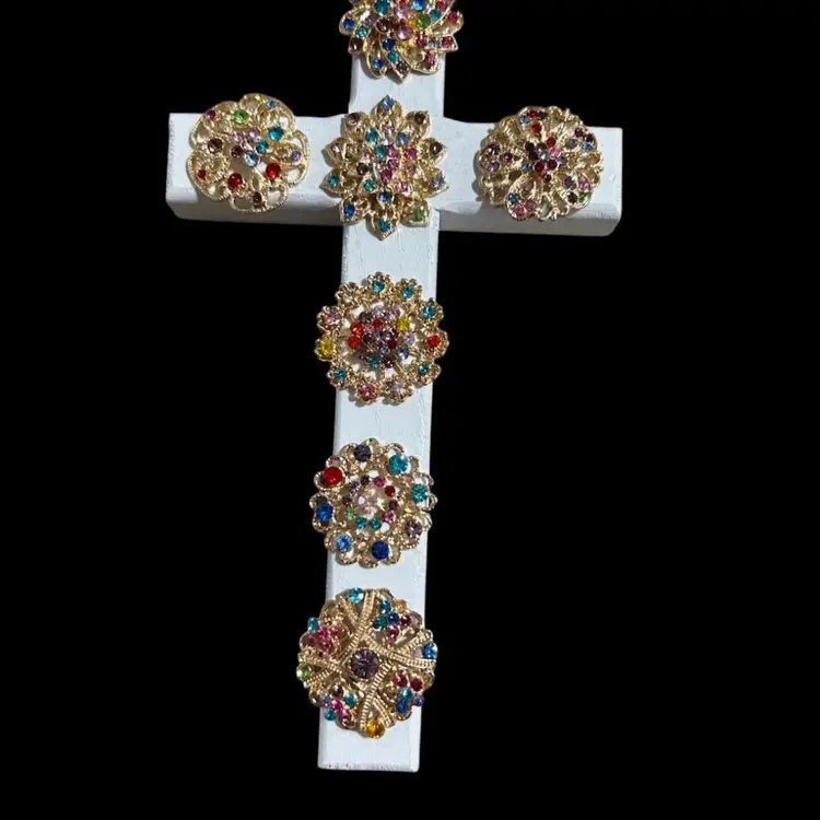 Wooden cross painted white with multi colored brooches. Measures approximately 8” tall and 4 1/2” wide