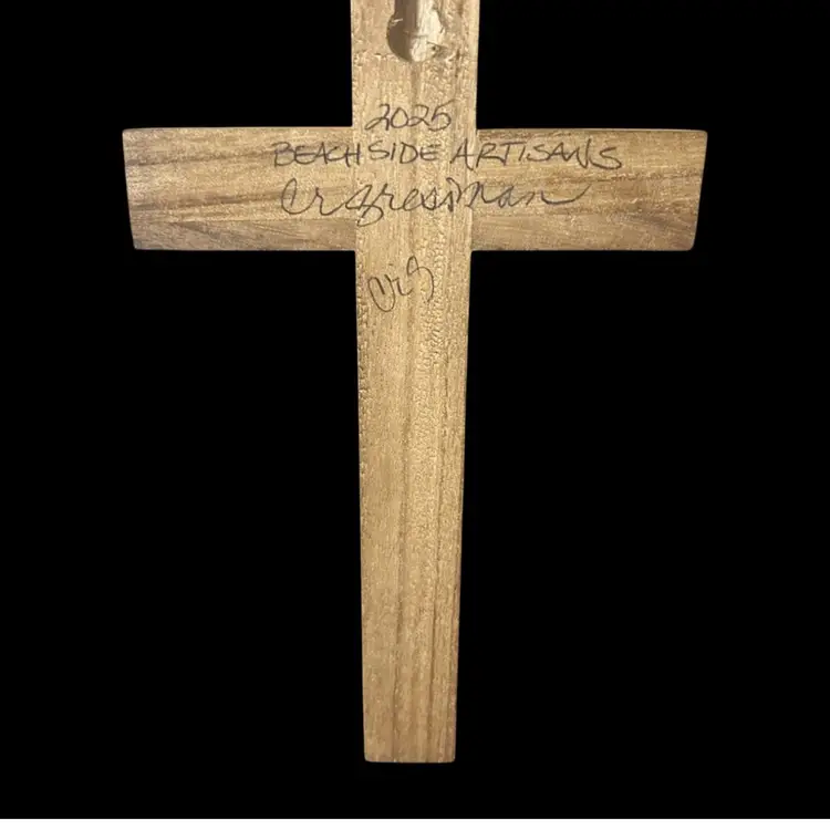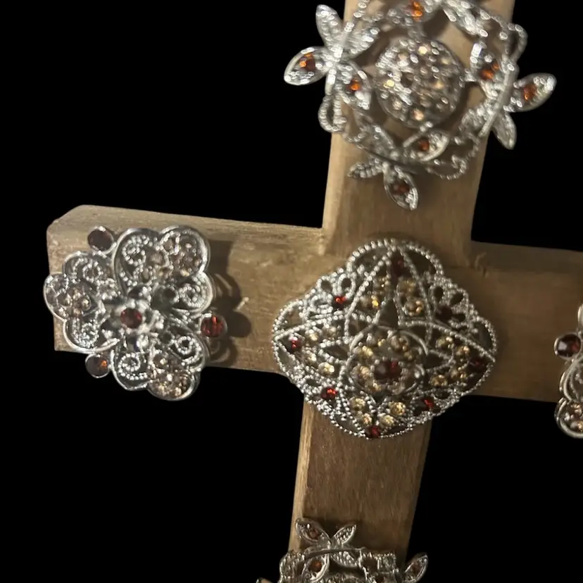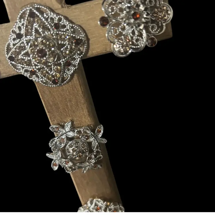 This wooden cross was stained and then I applied brooches. It measures approximately 8” tall and 4 1/2” wide. These are made to order so it may not look exactly like the one in the picture however, the color of the brooches will be the same. Feel free to reach out to me for custom orders because some of the crosses also come in white.