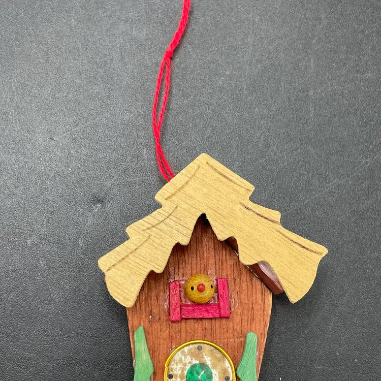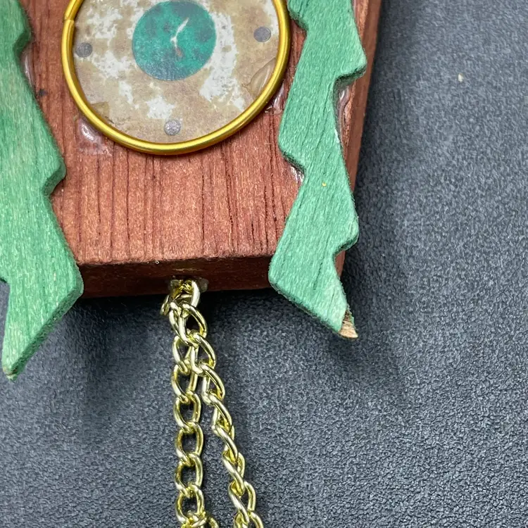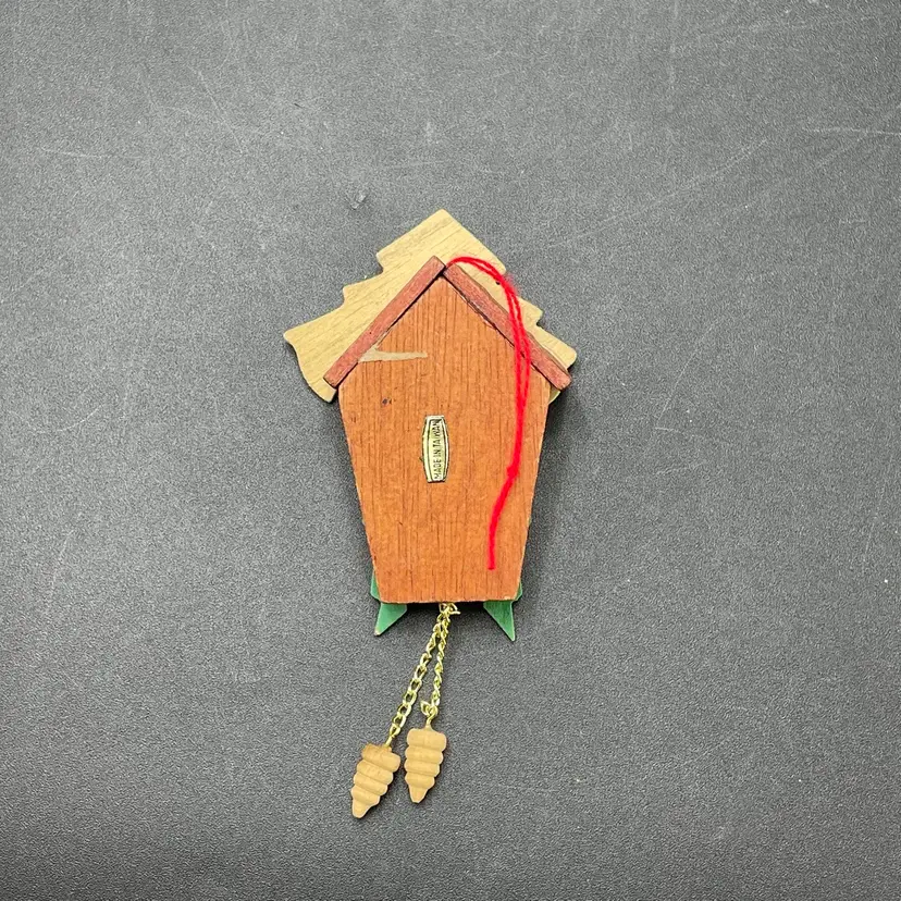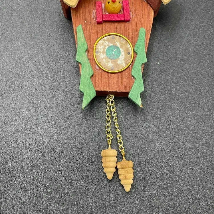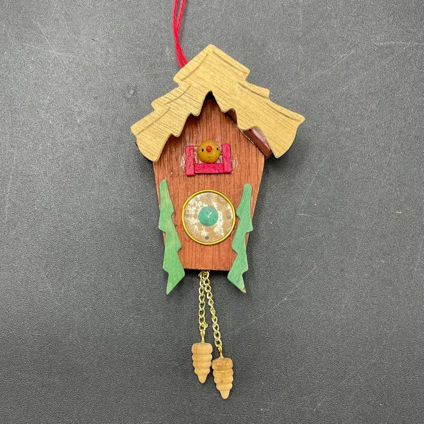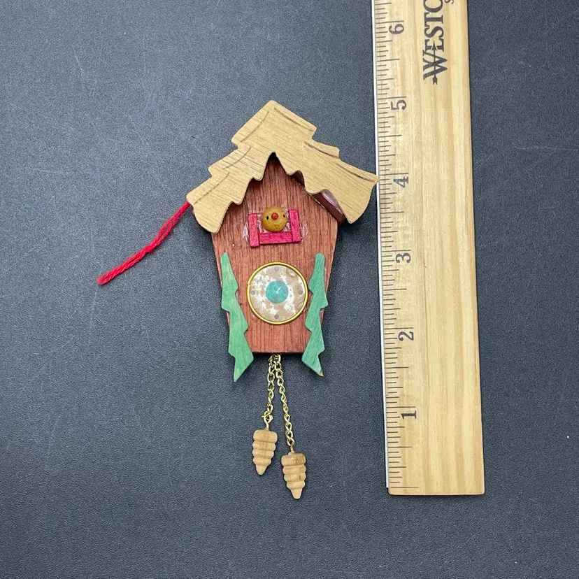 This is a vintage miniature wooden cuckoo clock hanging ornament. Made in Taiwan. Measures approximately 5" long including weights. There is a tiny paint chip on one of the green decorations as shown in pictures. No other major flaws.