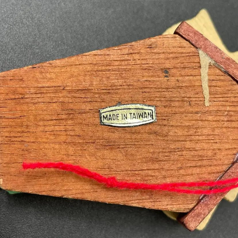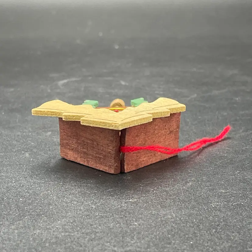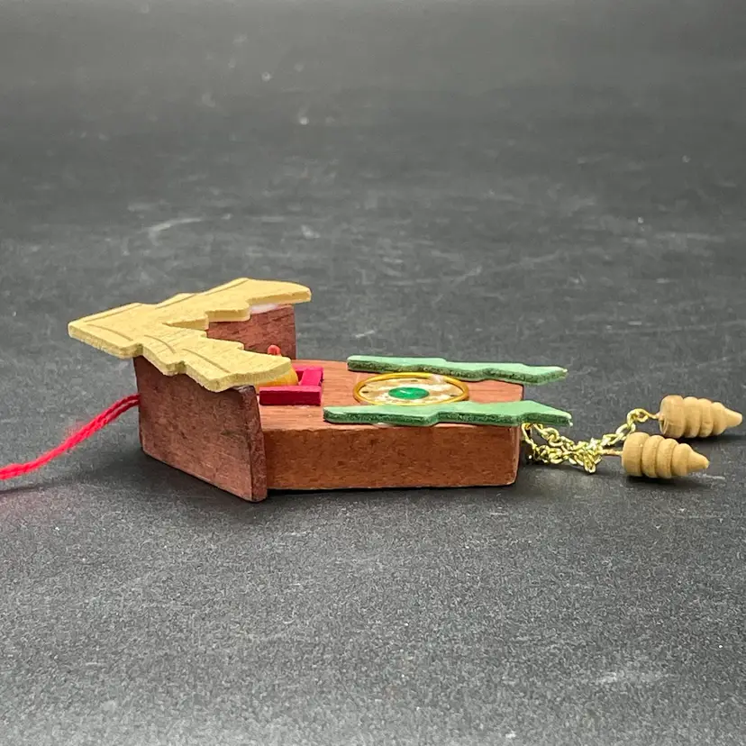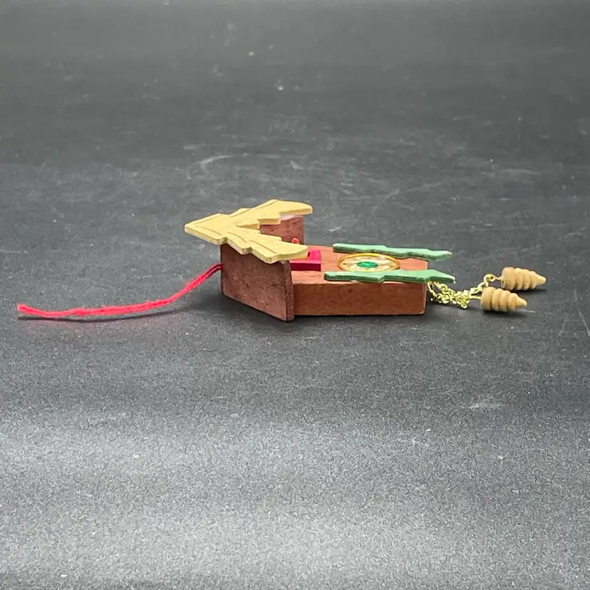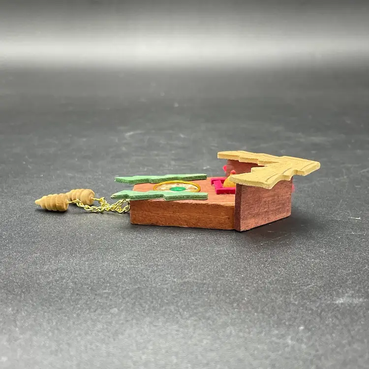 This is a vintage miniature wooden cuckoo clock hanging ornament. Made in Taiwan. Measures approximately 5" long including weights. There is a tiny paint chip on one of the green decorations as shown in pictures. No other major flaws.